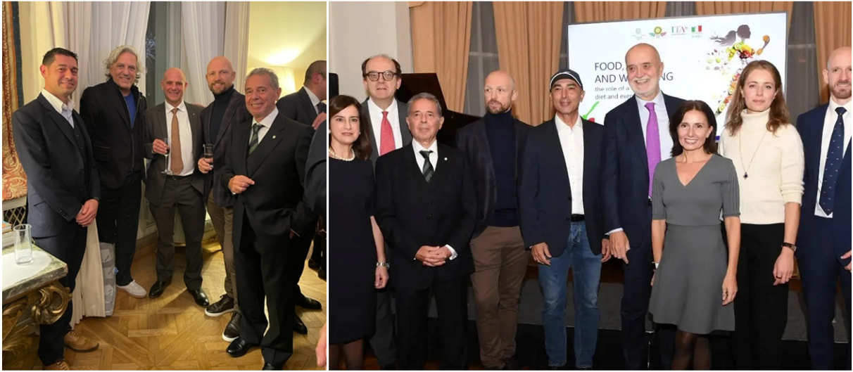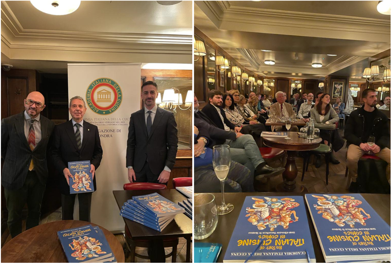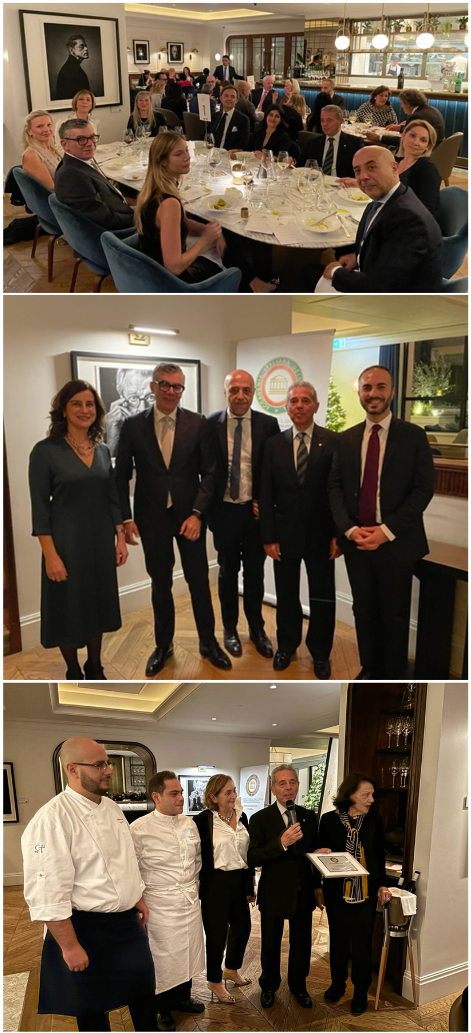 Tavola rotonda su “Alimentazione, sport e benessere” organizzata il 14 novembre dalla Delegazione con la collaborazione dell’Ambasciata Italiana a Londra e di ICE/ITA, con il validissimo aiuto nell’organizzazione della Consultrice Silvia Mazzola. L’evento è stato introdotto dal Delegato e Vice Presidente AIC Maurizio Fazzari, con i saluti di S.E. Amb. Inigo Lambertini; l’Addetta per l’Agricoltura dell’Ambasciata, Gabriella Manfredi, ha presentato i relatori e la scaletta della tavola rotonda. Ne è nato un dibattito molto interattivo fra scienziati e professionisti dello sport, che ha interessato vivamente i quasi 200 presenti. Per finire, il Direttore dell’ICE/ITA, Giovanni Sacchi, ha presentato due video sull’alimentazione dei giovani, realizzati per l’occasione. Il giorno successivo, con il patrocinio del Consolato Generale d’Italia e della Camera di Commercio Italiana a Londra, è stato presentato il libro History of Italian Cuisine in Comics. Il Console Alessandro Mignini e l’Addetta Stampa e Cultura dell’Ambasciata Aurora Russi hanno aperto la serata. Il Delegato ha illustrato il volume e instaurato un dialogo interessante e allo stesso tempo divertente con Roberto Costa, proprietario della catena di ristoranti Macellaio RC. Presentazione molto interattiva con i quasi 50 presenti nella sala. Il 19 novembre si è tenuta la cena conclusiva presso il ristorante italiano “Al Mare”, del Jumeirah Carlton Tower Hotel, preceduta da un aperitivo rigorosamente italiano al Peak Club. Alla presenza e con gli interventi del Console Generale Domenico Bellantone, dell’Addetto Economico dell’Ambasciata Dino Sorrentino, dell’Addetta all’Agricoltura Gabriella Manfredi e del Vice Addetto Economico Federico Dimonopoli. In questa occasione il Delegato ha consegnato il Diploma di Buona Cucina alla Direzione e chef con un caloroso applauso dei presenti. Ringraziamenti anche per Silvia Mazzola, che ha curato ogni dettaglio con l’aiuto della Consultrice Lucille Perricone.