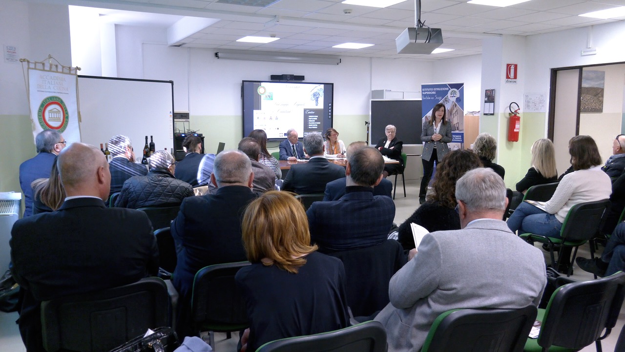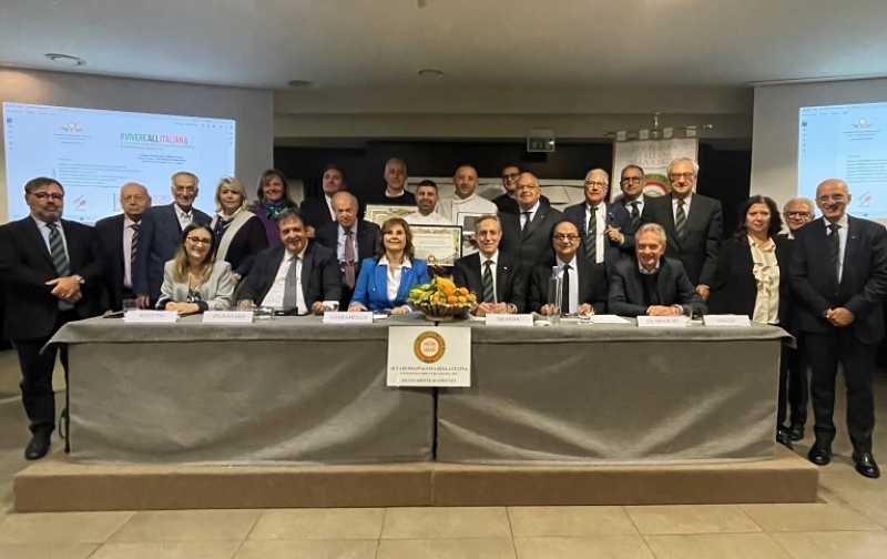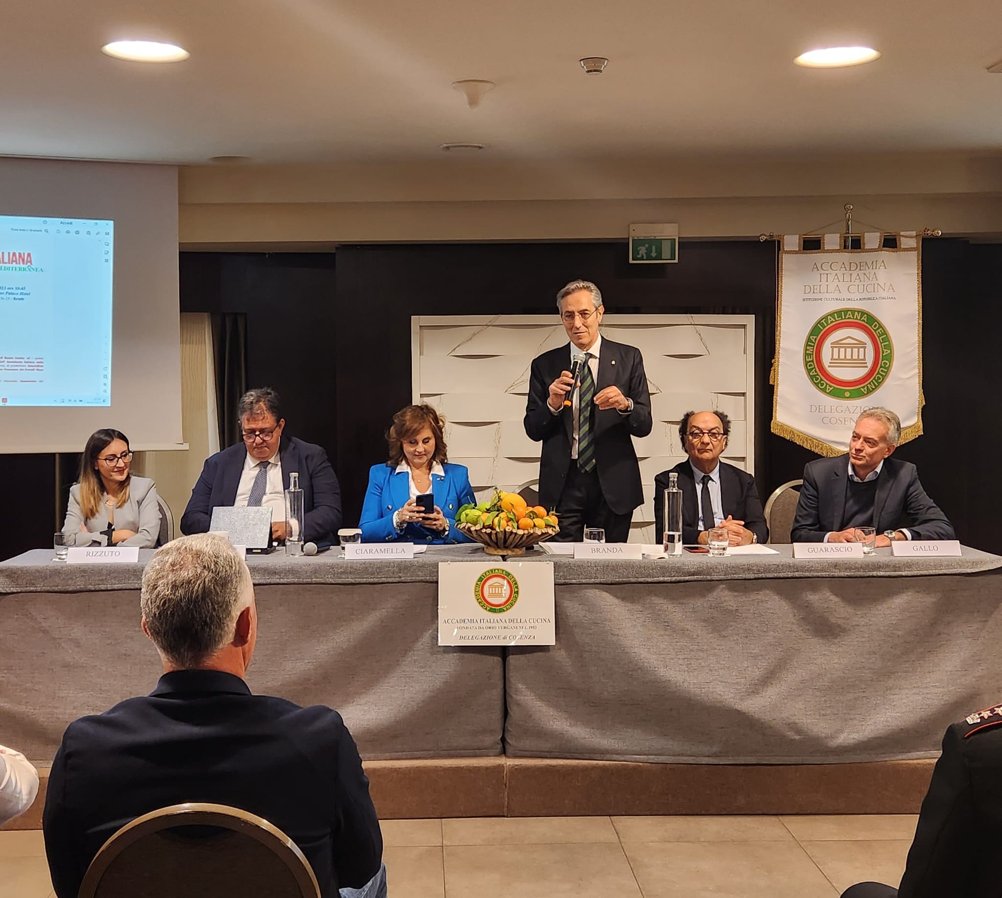 “La cucina Mediterranea: il benessere con gusto” è il tema scelto dalla Delegazione cosentina per l’iniziativa che si è tenuta sabato 18 novembre presso la sala convegni del Palace Hotel Villa Fabiano di Rende (foto 1). L’evento, molto partecipato (foto 2), ha voluto rendere omaggio alla "Settimana della Cucina Italiana nel Mondo", manifestazione mondiale giunta alla VIII edizione. Particolarmente coinvolgente il momento della consegna dei premi assegnati per il 2023 dall’Accademia Italiana della Cucina: il ristorante “La Locanda del Povero Enzo” ha ricevuto il “Diploma di Buona Cucina” dal Sindaco di Cosenza Franz Caruso che ha inteso testimoniare la propria vicinanza ad una eccellente realtà operante in città (foto 3). Il premio “Massimo Alberini” è stato assegnato all’esercizio commerciale “Pasticceria San Francesco dei Fratelli Rizzo” di Spezzano della Sila e consegnato dal Prefetto della provincia di Cosenza Ciaramella; il premio “Dino Villani” al produttore “Salumificio Menotti” di Colosimi per il “Capocollo Riserva” è stato invece consegnato dal Comandante provinciale dei Carabinieri Agatino Spoto. Apprezzamenti unanimi da parte degli intervenuti per le attività poste in essere dall’Accademia, così come per la qualità degli interventi svolti dalla nutrizionista Martina Rizzuto, dal presidente del Cosenza Calcio Eugenio Guarascio sugli aspetti benefici di una dieta varia ed equilibrata per chi pratica sport, dal tuffatore olimpionico Giovanni Tocci che ha inviato un videomessaggio, dal giornalista gastronomo Luciano Pignataro così come le conclusioni dell’Assessore regionale all’Agricoltura Gianluca Gallo (foto 4 con Accademici, relatori e premiati).