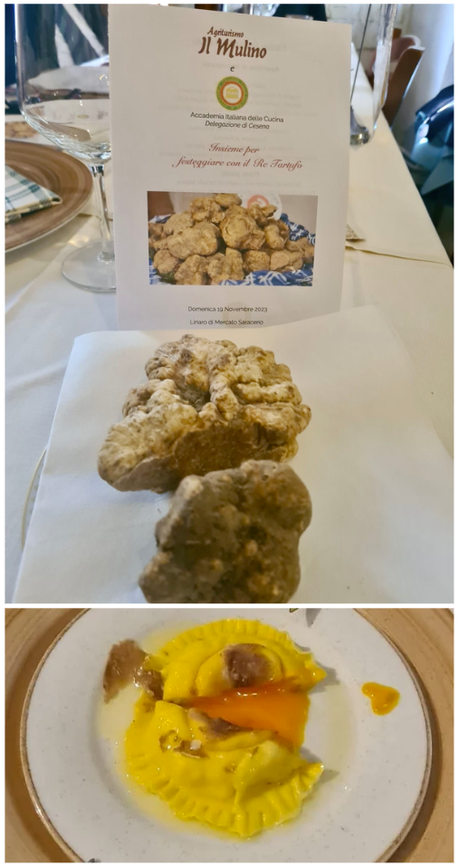 Appuntamento della Delegazione all’agriturismo “Il Mulino d’Ortano” per la riunione conviviale di novembre. Un pranzo domenicale dedicato ai prodotti del bosco e del sottobosco (tartufi e funghi), che hanno costituito gli ingredienti base del menù degustazione curato dall’ottimo Simposiarca Paolo Montalti (Foto 1). Dopo l’antipasto di crostini con tartufo e lardo finissimo accompagnati da Insalatina autunnale ai funghi porcini, sono stati serviti, come primi piatti, “Occhio di Venere” con scaglie di tartufo bianco (foto 2) e passatelli in brodo al profumo di tartufo. Sono seguiti gli arrosti misti di agnello, faraona, pollo e coniglio, porcini fritti e verdure all’orto di stagione. Per finire, zuppa inglese e, a libera scelta, castagne arrosto. Tutti piatti ben riusciti che hanno incontrato l’unanime gradimento dei commensali. Un apprezzamento speciale è stato riservato all’Occhio di Venere, raviolo ripieno con uovo e ricoperto di abbondante tartufo bianco. Nel corso del pranzo, la prof. Alessandra Zambonelli (foto 3) dell’Università di Bologna, prendendo spunto dai piatti serviti, ha arricchito l’incontro con una serie di interessanti riflessioni sulla valorizzazione e tutela delle qualità delle specie di tartufo più pregiate. Al termine del convivio, molto vivace e apprezzato, il Vice Delegato Gianluigi Trevisani ha consegnato alla titolare Ombretta Farneti e allo staff di cucina il piatto dell’Accademia (Foto 4).