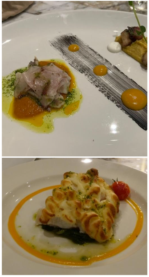 “La Cucina Partecipata nelle narrazioni di Costanza Di Quattro” è stato il tema dell’evento culturale della Delegazione introdotto dal Delegato e concluso dall’intervento del Coordinatore Territoriale della Sicilia Orientale Vittorio Sartorio, trattato in due eleganti presentazioni di Attilio Borda Bossana (La Cucina dei Monsù) e Luigi Hyerace (La cucina fra ricordi e emozioni nella cucina di Costanza Di Quattro) (Foto 1). Dopo la consegna delle insegne accademiche alla nuova Accademica Patrizia Cordaro da parte del Coordinatore Territoriale, gli Accademici e i numerosi ospiti hanno apprezzato la degustazione del menù tematico (Foto 2) preparato filologicamente dallo chef Massimiliano Usbergo e dalla sua squadra di cucina e servito dalla cortese squadra di sala, ritratti nella foto 3 con il Delegato e il Segretario.