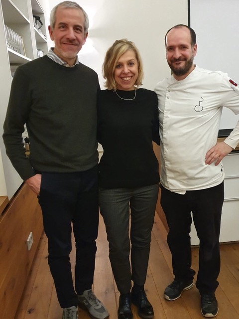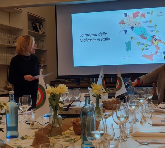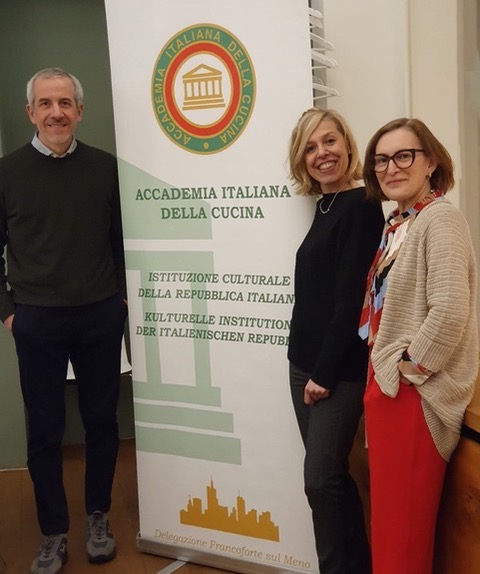 Nel Kitchen Open Space del Bornheimer Ratskeller si è tenuta un’interessante e coinvolgente degustazione di vini organizzata dalla Delegazione di Francoforte. La Delegata Laura Melara-Dürbeck, ispirata dal libro pubblicato da Kellerman Editore “Malvasia. Il vino prezioso d’Oriente che Venezia rese nobile nel Mediteranneo”, ha raccontato, insieme ai sommelier Elena Bosani e Alessandro Farchione, la storia della Malvasia. Elena e Alessandro hanno scelto e presentato tre vini molto apprezzati dai commensali, ne hanno illustrato le proprietà organolettiche e i territori di provenienza, accompagnando gli Accademici nelle varie fasi della degustazione. Un viaggio da Nord a Sud seduti a tavola. Le gustosissime pietanze di accompagnamento si sposavano perfettamente con i vini proposti: farrotto ai crostacei con pomodorini, salmerino di Wetterfeld con cavolo di rapa e raviolo ripieno al pesce, mele e mandorle, soufflé di ricotta allo zafferano e cannella con variazione di arance sanguinello di Sicilia. Applausi finali meritati per lo chef Mario Furlanello e per i sommelier e ringraziamenti alla Delegata per l'ottima organizzazione dell'evento.