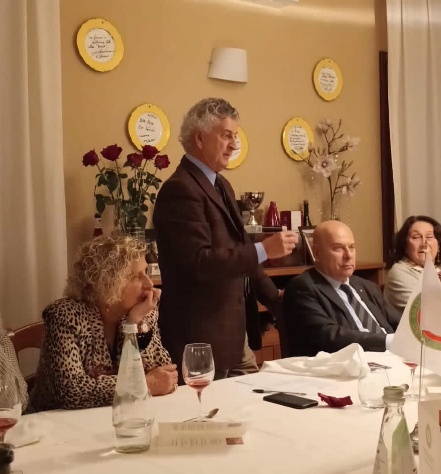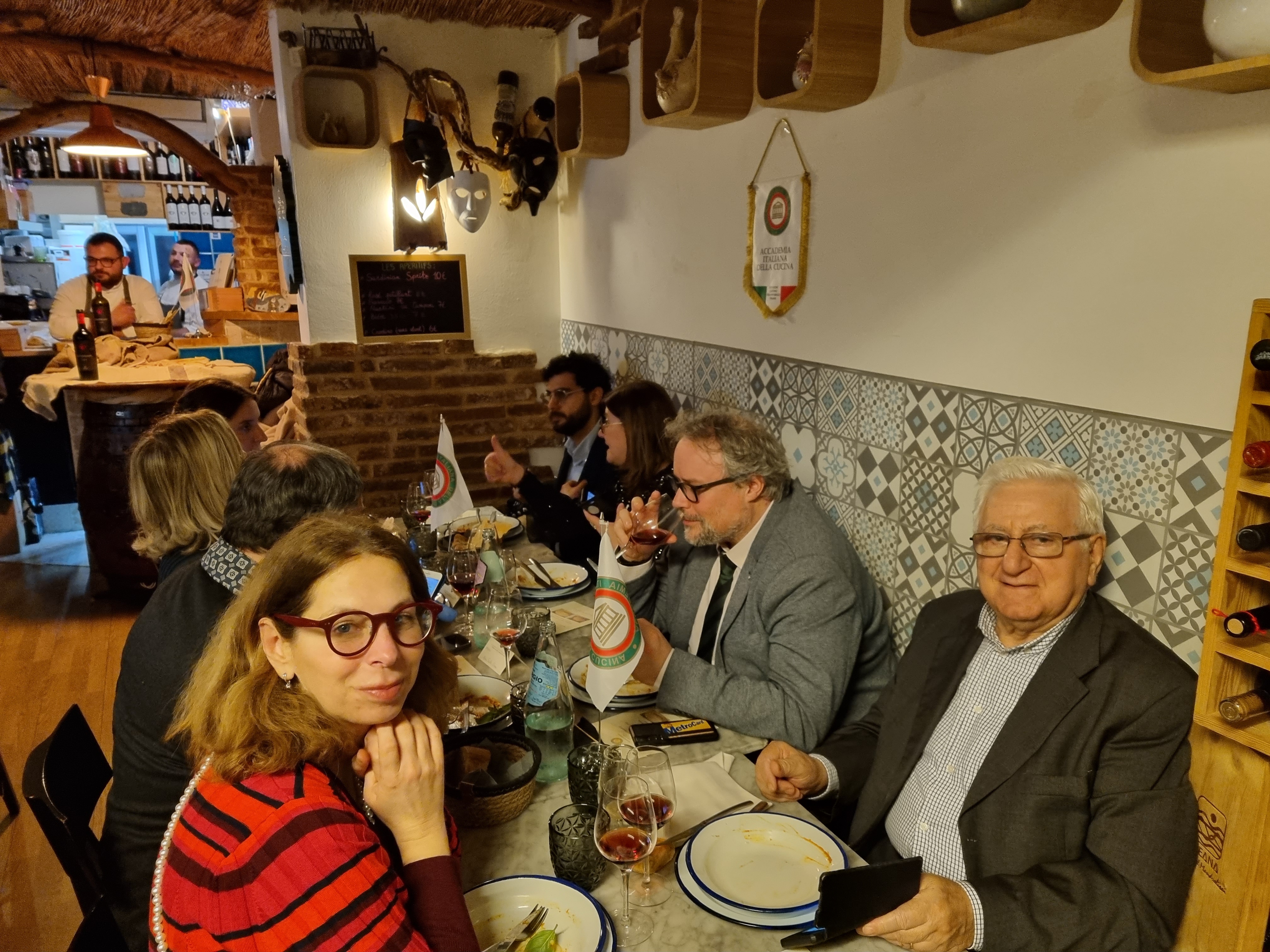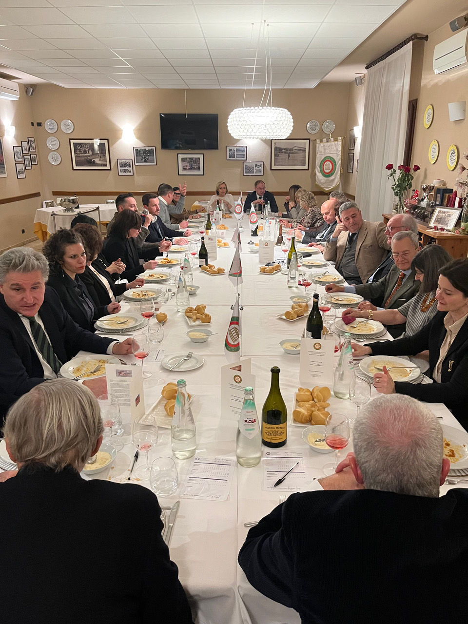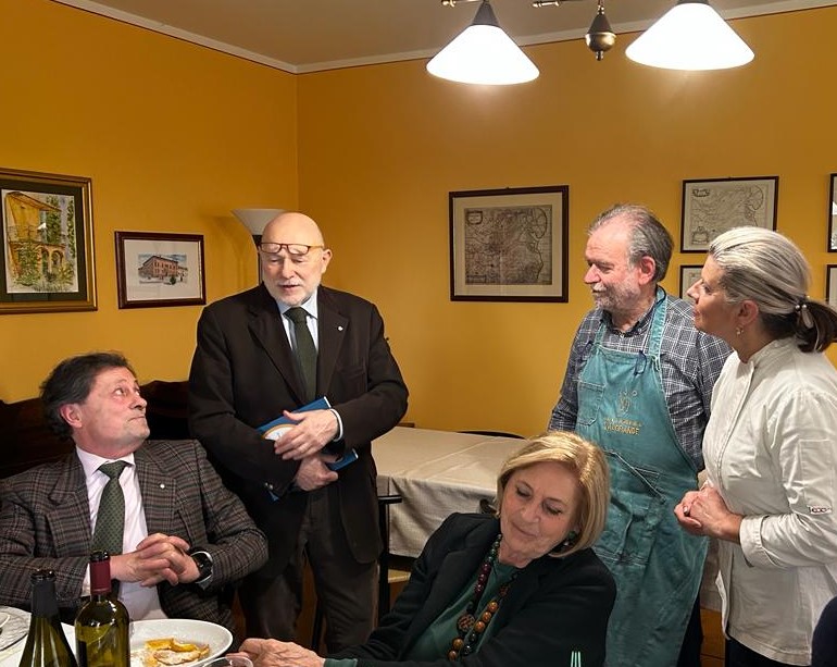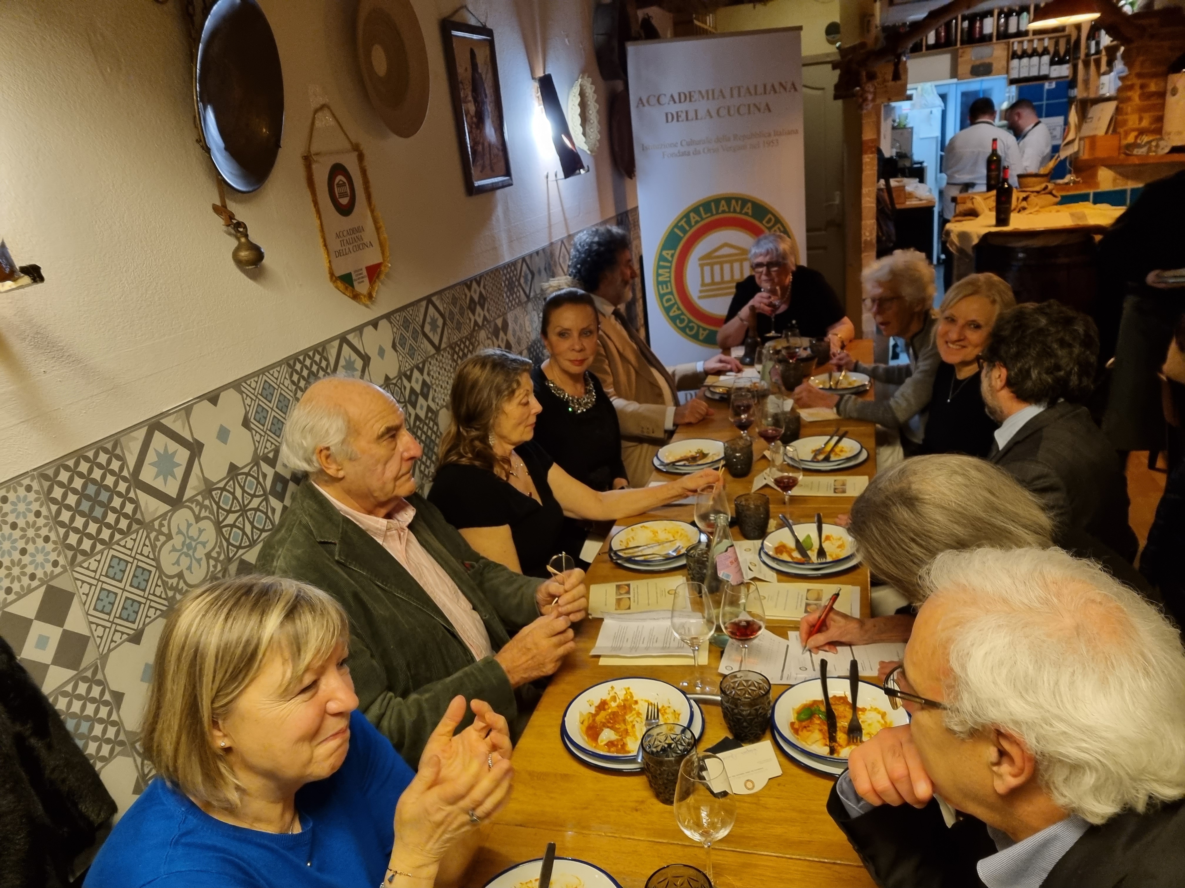 Riunione conviviale presso il ristorante "Cacio&Pepe" in San Marino organizzata dall'Accademico Simposiarca Cesare Tabarrini (foto 1), amante della cucina romana, e illustrata dall'Accademico Simposiarca Stefano Valentino Piva (foto 2). Il titolo dato alla serata “La Cucina ROMA/gnola” fin dal suo inizio, ha fatto intuire che la cena avrebbe rappresentato la cucina romana elaborata e interpretata in un contesto Sammarinese. Dopo il benvenuto del Delegato Andrea Negri (foto 3), il Simposiarca Piva ha argomentato sulla celebre Porchetta d’Ariccia, una specialità della tradizione romana, presente in tutte le feste popolari e laziali, passando poi a descrivere la “pasta alla gricia”, primo piatto tipico della cucina romana. Nell'illustrare il secondo piatto “salsiccia e fagioli”, un grande classico della cucina, diffuso in tutte le regioni d’Italia, un piatto rustico e saporito, perfetto da gustare quando il freddo si fa sentire, il Simposiarca ha ricordato che fonda le sue radici nella tradizione contadina della zona della Tuscia. E per finire, le famose ciambelline romane: una ghiottoneria indimenticabile, un fiore all’occhiello del nostro patrimonio dolciario. Un dolce povero, che veniva cucinato con ciò che si aveva nella propria casa. La serata, ricca di colte e stimolanti curiosità grazie alla relazione dell’Accademico Simposiarca Piva si è rilevata all’insegna della cultura, del buon cibo e della condivisione in amicizia.