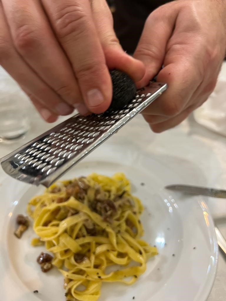 La Delegazione, prima del termine del periodo di raccolta del tartufo nero pregiato, ha organizzato un convivio dedicato al prezioso fungo ipogeo, proprio nell’ambiente ove esso alligna in maniera più che ragguardevole, tanto da renderne il territorio di Roccafluvione (zona pedemontana in provincia di Ascoli Piceno) la più prolifica al mondo. La scelta del locale è caduta presso il noto e storico ristorante “Il Vecchio mulino”, i cui chef-titolari, Franca e Stefano Argira, sono conosciuti come particolarmente esperti nel trattare il prestigioso tartufo locale. Al ghiotto evento ha partecipato il membro del CS “Franco Marenghi” Leonardo Seghetti (foto 1) che, come di consueto, ha catturato con i suoi interventi l’attenzione di tutti i presenti, e il Delegato di Fermo Fabio Torresi con una rappresentanza di suoi Accademici (foto 2 con il Delegato di AP Vittorio Ricci). I commensali, cui è stato servito il tartufo a profusione, hanno degustato ed apprezzato particolarmente, tra gli antipasti, il “ventaglio tartufato”, una sorta di crêpe di incomparabile bontà, così come lo sono state le “tagliatelle del Mulino” (foto 3), con il tartufo grattugiato senza risparmio alcuno; il dessert infine ha ricevuto l’unanime giudizio eccellente, a suggellare le abilità e la maestria culinarie degli chef Stefano e Franca (foto 4. Consegna del guidoncino).