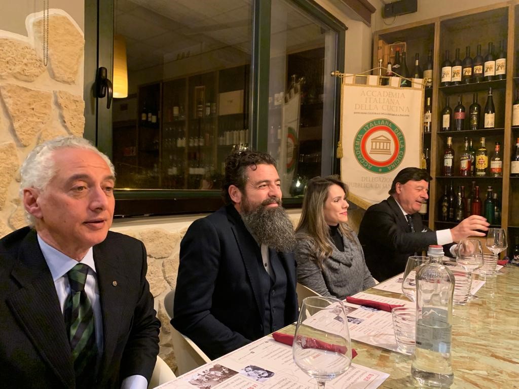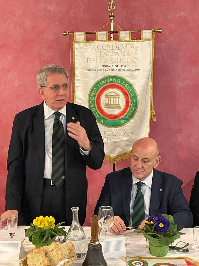 Serata dedicata ad uno dei prodotti che fin dal XV secolo rappresenta un punto fermo per la cucina del territorio, anche se non propriamente abruzzese: il baccalà, protagonista di un evento culturale-gastronomico che ha unito le nove Delegazioni della regione il 16 febbraio, sotto la guida del Coordinatore territoriale e Delegato di Chieti, Nicola D’Auria. Nel convivio teatino, celebrato al ristorante Capsicum nel capoluogo di provincia, grazie al Simposiarca Rocco Del Conte, il Vice Presidente Vicario, Mimmo D’Alessio, ha deliziato gli Accademici e i loro ospiti con una disamina storica della parabola gastronomica del baccalà, che ha proprio nella provincia di Chieti uno dei suoi centri di diffusione e di maggior consumo. La brigata di cucina, guidata da Patrizia Marinucci, è stata attentissima nel riproporre i piatti della tradizione abruzzese collegati con il baccalà, che un tempo erano diffusi in tutte le cucine, soprattutto quelle “povere”. Foto 1. Il Simposiarca Del Conte illustra il menu. Foto 2. VPV Mimmo D’Alessio e Delegato Nicola D’Auria. Foto 3. Accademici e intervento di D’Alessio. Foto 4. Consegna del guidoncino a Patrizia Marinucci.