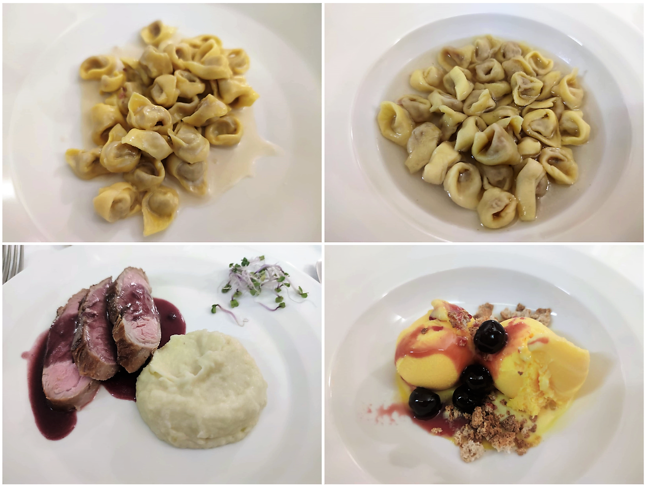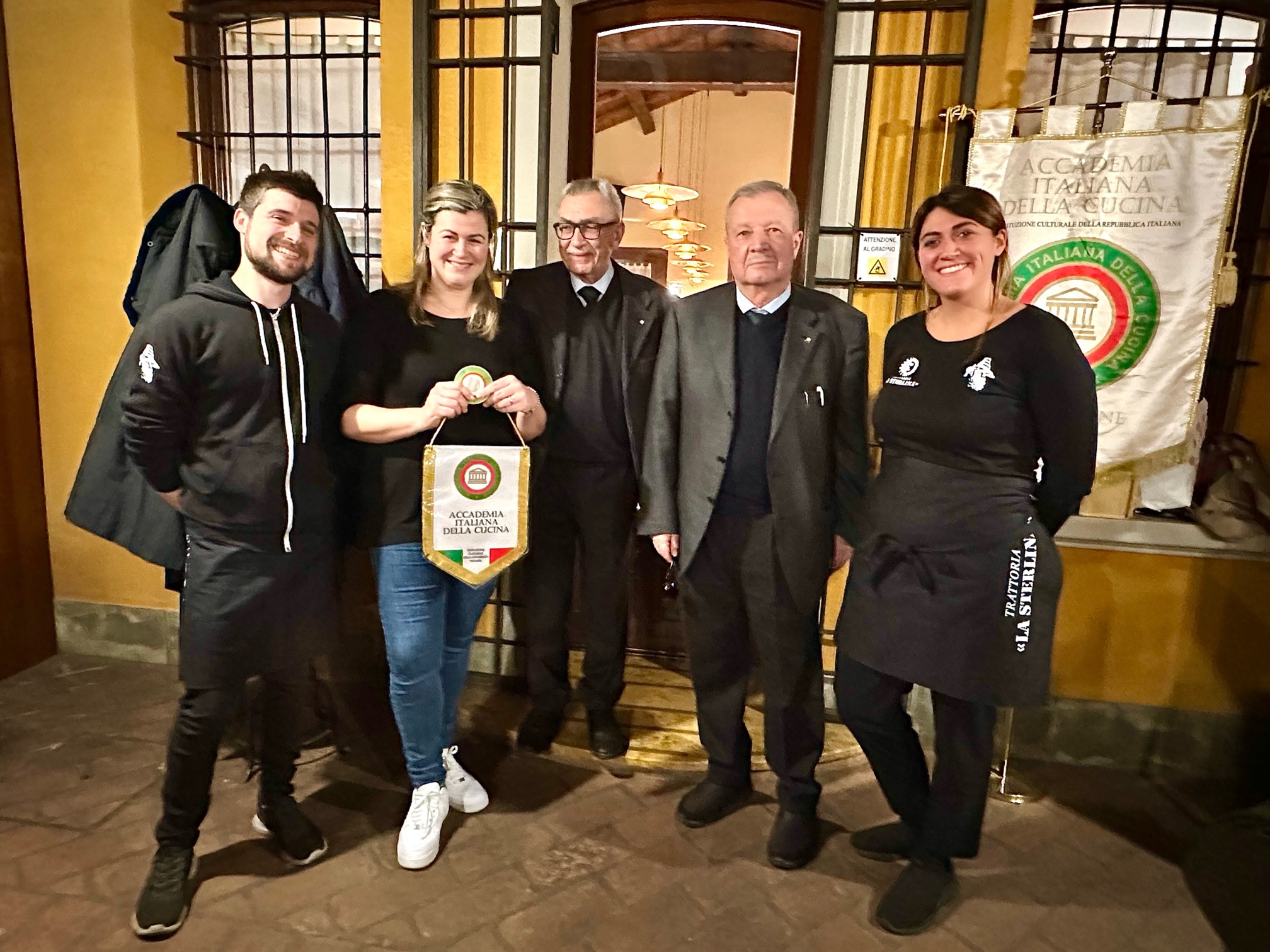 È un esempio di vera trattoria di campagna con cibi prodotti nel territorio imolese il locale che ha accolto la Delegazione in un'affollata riunione conviviale che ha largamente soddisfatto gli Accademici. La cucina de "La Sterlina" ha confermato che i piatti che caratterizzano questo territorio che apre le porte alla Romagna mantengono quei sapori e profumi che spiegano cosa significhi una scelta votata al rispetto delle preparazioni tradizionali. Dai passatelli in brodo alle carni grigliate col fritto misto, dagli strozzapreti ai cappellacci, senza tralasciare la zuppa inglese, è stato un susseguirsi di gustose pietanze premiate con un prolungato plauso alla famiglia Dalmonte. In apertura il momento più importante della serata con la cerimonia di investitura e di calorosa accoglienza per due nuove Accademiche: Silvia Villa e Rosa Mattioli. Foto 1. L'aCCADEMICO Giancarlo Fiorentino presenta la nuova Accademica Rosa Mattioli. Foto 2. Il Consultore Michele Gamberini presenta la nuova Accademica Silvia Villa. Foto 3. Consegna del guidoncino dell'Accademia alla Famiglia Dalmonte con il Simposiarca Sergio Galassi e il Delegato Antonio Gaddoni. Foto 4. Passatelli in brodo.