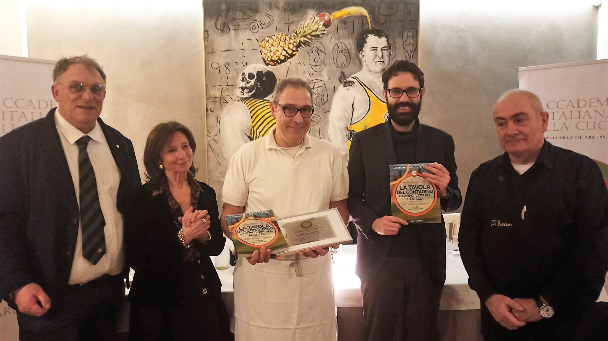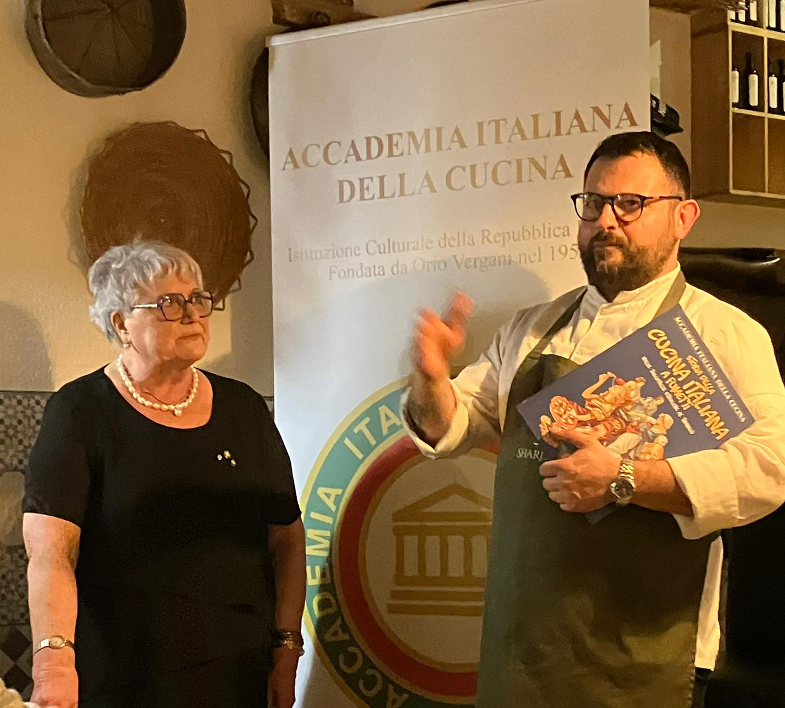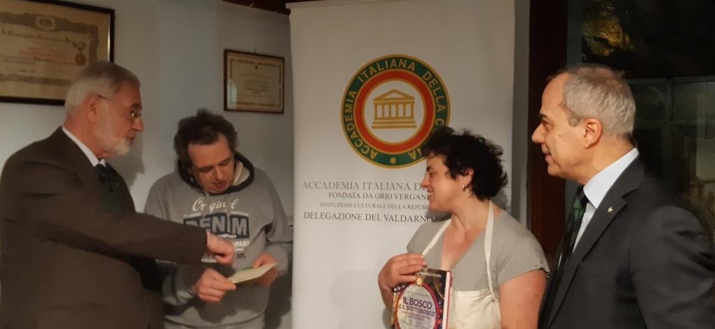 Grazie alla preziosa organizzazione del Simposiarca Andrea Barocchi, la Delegazione ha trascorso una piacevolissima riunione conviviale presso il ristorante Casprini da Omero, al Passo dei Pecorai, nel comune di Greve in Chianti. Il ristorante, gestito dalla famiglia Casprini dal 1913, ha avuto tra i suoi cuochi anche Guido Samorini, secondo alcune fonti l’inventore della torta della nonna. Oggi il ristorante è gestito da Luca Casprini e da sua moglie Alessandra Polipetti, chef del ristorante, che continua la tradizione della cucina regionale, prediligendo prodotti nostrali e fatti in casa e seguendo ricette antiche della tradizione fiorentina-chiantigiana. Il menù appetitoso e le porzioni generose hanno dato vivacità e sincera convivialità alla serata (foto 1). Si sono susseguiti: antipasto di fettunta con lardo di Colonnata, gnocchi con salsiccia e funghi, coniglio in umido con fagioli all’uccelletto, bocconcini di agnello aglio e rosmarino con frittura di verdure di stagione. In abbinamento ai piatti è stato scelto un buon vino rosso Chianti dei Castelli di Grevepesa, mentre hanno accompagnato il dolce - uno zuccotto fatto in casa ricoperto di cioccolata calda fondente - vini dolci e liquori (foto 2). Durante la serata la nuova Accademica Anna Matteuzzi ha ricevuto dal Delegato Sandro Fusari le insegne accademiche (foto 3). In chiusura di serata, il Delegato e il Simposiarca hanno ringraziato il titolare e la cuoca, consegnando loro un volume dell’Accademia (foto 4).