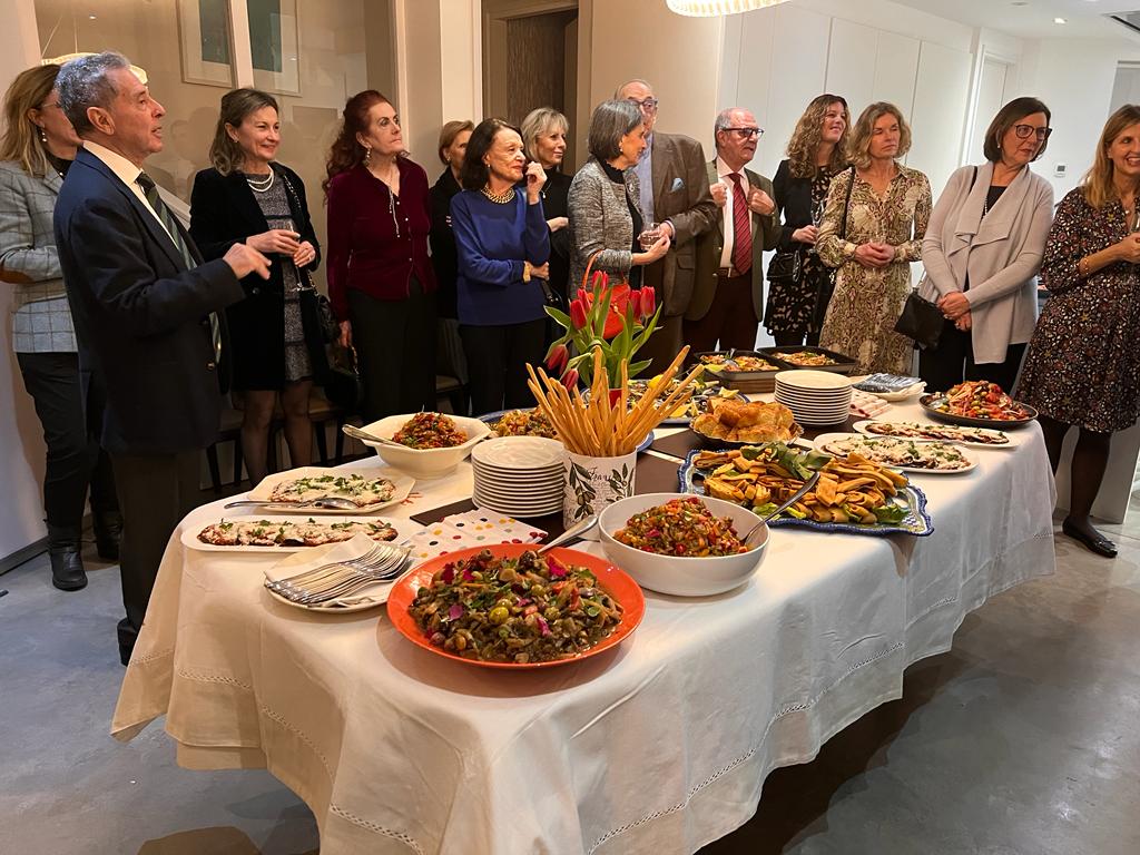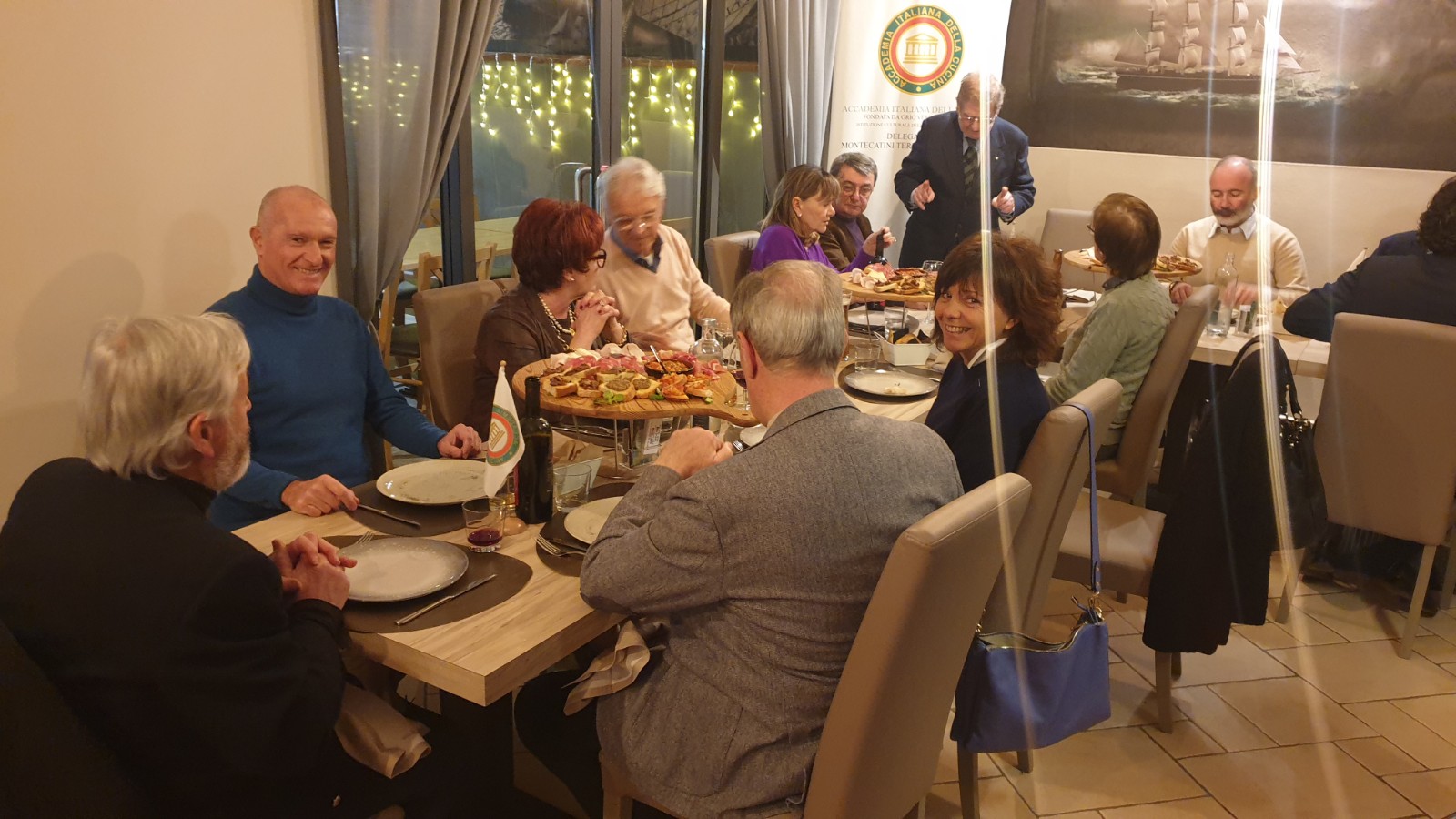 Cena conviviale presso il ristorante Baiocco Osteria di Miami. Il locale è situato in una tipica dimora coloniale americana del secolo scorso ed ha recentemente rinnovato il giardino retrostante arredato ora con tavolini originali siciliani decorati con ceramiche colorate. Lo chef Stefano Pilia ha preparato un menu ispirato alla Festa Internazionale della Donna. Il tema della serata è stato infatti: CENA IN GIALLO, in assonanza con il colore giallo della mimosa. Il menu comprendeva: parmigiana al datterino giallo; vitello tonnato con uovo mimosa; gnocchi di patate gialle con lime e bottarga; risotto allo zafferano con ragù di polpo; tiramisù al limoncello. Ad inizio serata il Delegato Antonio Pianta ha sottolineato la ricorrenza del 70° anniversario dell’Accademia. Il proprietario David Ranucci ha poi ricordato che la sua famiglia ha una storia centenaria nella ristorazione. Gli ospiti hanno poi trovato come segnaposto i biglietti scritti a mano con notizie storico letterarie legate al colore GIALLO. La serata ha visto la partecipazione di 60 tra ospiti e Accademici.