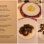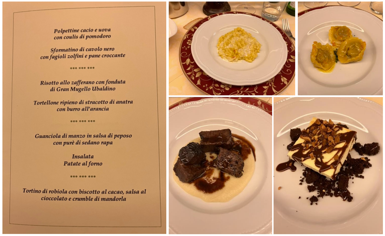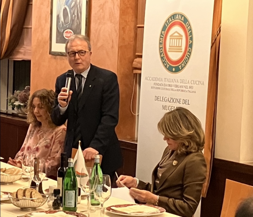 Per la riunione conviviale di febbraio gli Accademici si sono riuniti presso il ristorante “L’O di Giotto” all’interno del Park Hotel Ripaverde a Borgo San Lorenzo (FI). La serata è stata organizzata nei minimi particolari dall’Accademico Giulio Cappetti che ha attentamente studiato l’abbinamento di vini del territorio ai piatti, preparati con cura e passione da Diego Esposito giovane chef di origine abruzzese. Un’occasione per monitorare la ristorazione d’albergo, che è risultata particolarmente attenta alla selezione degli ingredienti e orientata verso la scelta della materia prima locale. Il Convivio si è concluso con i ringraziamenti allo chef e alla sua brigata e con la consegna del guidoncino da parte della Delegata Monica Sforzini. Foto 1. Il Simposiarca Giulio Cappetti durante la presentazione del menu. Foto 2. Un momento della serata. Foto 3. Lo chef Diego Esposito con il personale di cucina e di sala, il Simposiarca e la Delegata. Foto 4. Il menu con alcuni piatti.