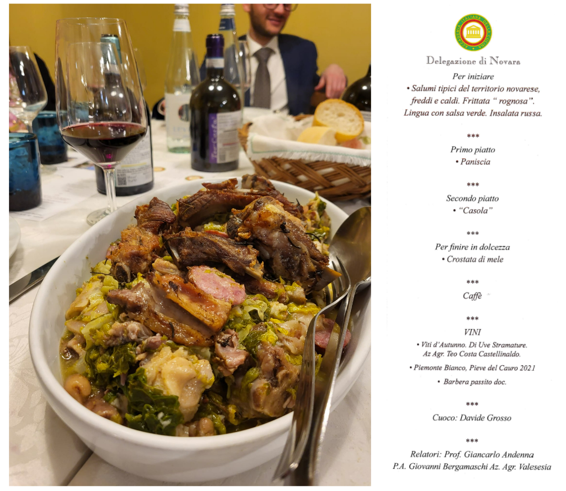 La seconda conviviale del 2023 ha avuto come tema “Il maiale in terra novarese”. Il piatto principale preparato dallo chef Davide Grosso de “La vecchia trattoria della pace” è stato la “Casola”, apprezzata dai numerosi commensali e ospiti attratti da un piatto che si fa sempre più raro. In questa occasione sono entrati in Delegazione due nuovi Accademici. Alla riunione conviviale erano presenti il prefetto di Novara, il sindaco di Mandello Vitta, le Delegate di Biella e Vercelli. L’Accademico Giancarlo Andenna ha illustrato la storia del paese Mandello Vitta che conserva intatte una chiesa ed una torre di avvistamento del XII secolo. Il titolare dell’Az. Agr. Valsesia, che ha ricevuto nel 1993 il premio Dino Villani, ha ricordato la storia del maiale dagli anni ’50 ad oggi, come si alleva, si nutre, si macella e quanto preziose siano le sue carni. Foto 1. Il Delegato Piero Spaini e i nuovi Accademici Felice Invernizzi e Mauro Palombi. Foto 2. Delegato e chef Davide Grosso. Foto 3. Spaini, chef, relatore Giovanni Bergamaschi. Foto 4. Casola e menu.