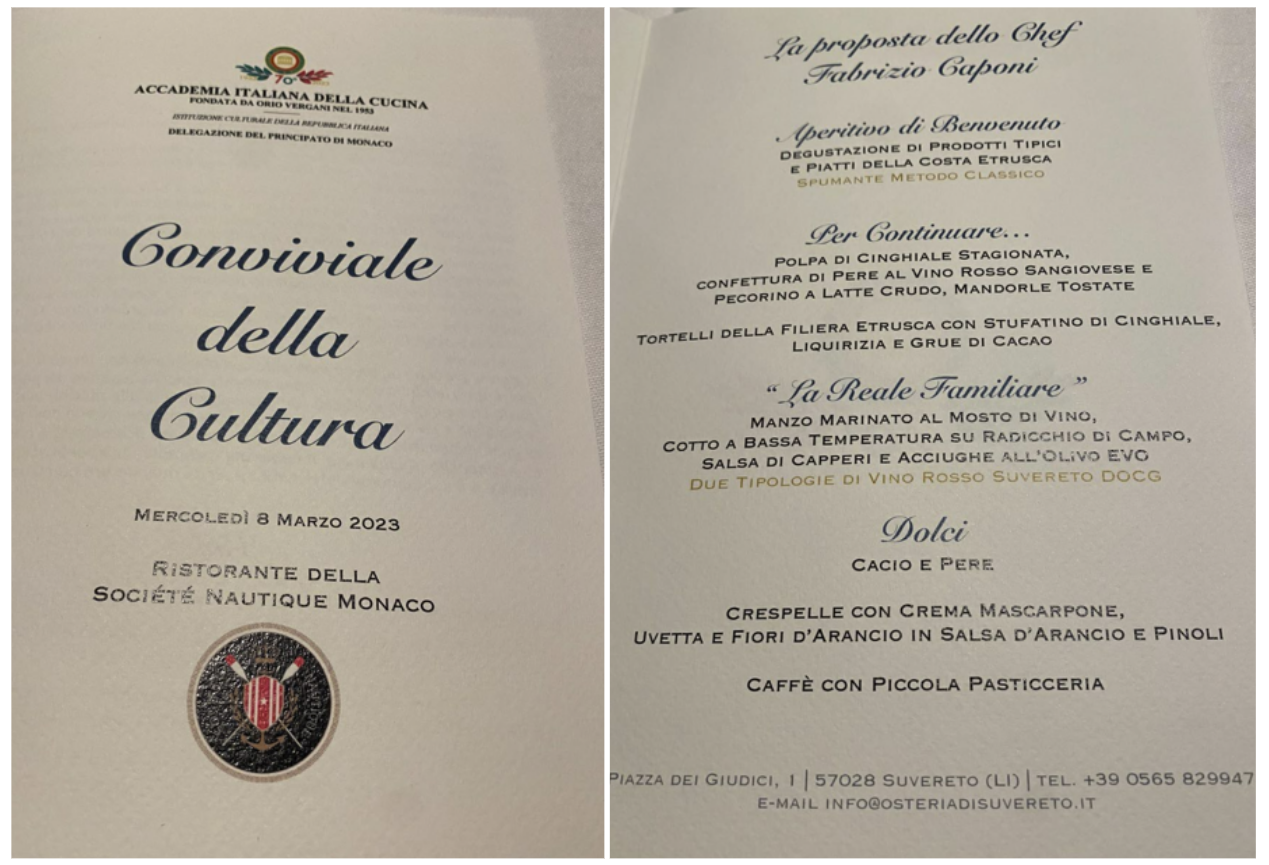 L'incontro conviviale delI’8 marzo presso la Société Nautique di Monaco non ha soltanto celebrato la Festa Internazionale della Donna, ma ha affermato contestualmente la rilevanza del valore della sostenibilità anche nell'ambito dell'alimentazione e, di conseguenza, della ristorazione. A rappresentare tale sensibilità, la Delegazione del Principato di Monaco ha scelto Io staff del ristorante l'Ciocio di Suvereto, piccolo borgo del Livornese situato tra il mare e le colline, la cui storia, attestata da numerose testimonianze architettoniche, affonda le sue radici nel Medioevo. Il menu proposto è stato articolato secondo parametri coerenti con la ricerca delle eccellenze qualitative, dalla selezione di materie prime locali, alle farine di grani antichi macinati a pietra, ai vini originari del borgo di Suvereto. Tutto “fatto in casa” insomma, come dimostrano l'intitolazione stessa del ristorante, soprannome dello chef, e la rivisitazione di ricette di famiglia, che risalgono a memorie personali ed emanano il profumo di infanzie ormai lontane. Così i protagonisti della tradizione gastronomica toscana si sono presentati in tavola in abito green, funzionale a valorizzarne le peculiarità nonché disponibile ad accogliere tocchi originali e creativi: dalle verdure ai salumi, dalle carni di cinghiale e manzo fino alla frutta. La sintesi di passato e presente si rivela una risorsa vincente nel perseguire l'obiettivo ormai imprescindibile della sostenibilità.