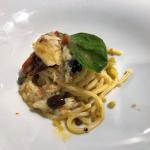 “Il baccalà in tavola” al centro della riunione conviviale della Delegazione di Pescara, nell’ambito della giornata di studio promossa dal Coordinamento territoriale delle Delegazioni abruzzesi. La serata, che si è svolta al ristorante “Margazzill - Idee dal Mare” di Città S. Angelo, è iniziata con una interessante dissertazione tenuta dal Delegato Giuseppe Fioritoni e da Massimo Monti, responsabile di un’azienda leader nella commercializzazione del baccalà norvegese dal 1903. Interessante e sfizioso il menu scelto dal Simposiarca Gianluca Galasso e realizzato dalla brigata di cucina del ristorante, guidata dal titolare Claudio D’Arcangelo e dallo chef Daniele Terrenzio. Entusiasti e deliziati i numerosi Accademici presenti alla conviviale insieme a familiari e amici. La conviviale territoriale abruzzese è stata anche l’occasione per ufficializzare l’ingresso in Delegazione della nuova Accademica Valeria Toppetti. Foto 1. La neo Accademica Valeria Toppetti e il Delegato Giuseppe Fioritoni Foto 2. Da sx, il Simposiarca Gianluca Galasso, il Delegato e Massimo Monti Foto 3. Simposiarca e Delegato con Claudio D’Arcangelo e Daniele Terrenzio. Foto 4. Lo spaghettone quadro con baccalà, pomodorini confit, capperi, olive e pane fritto.