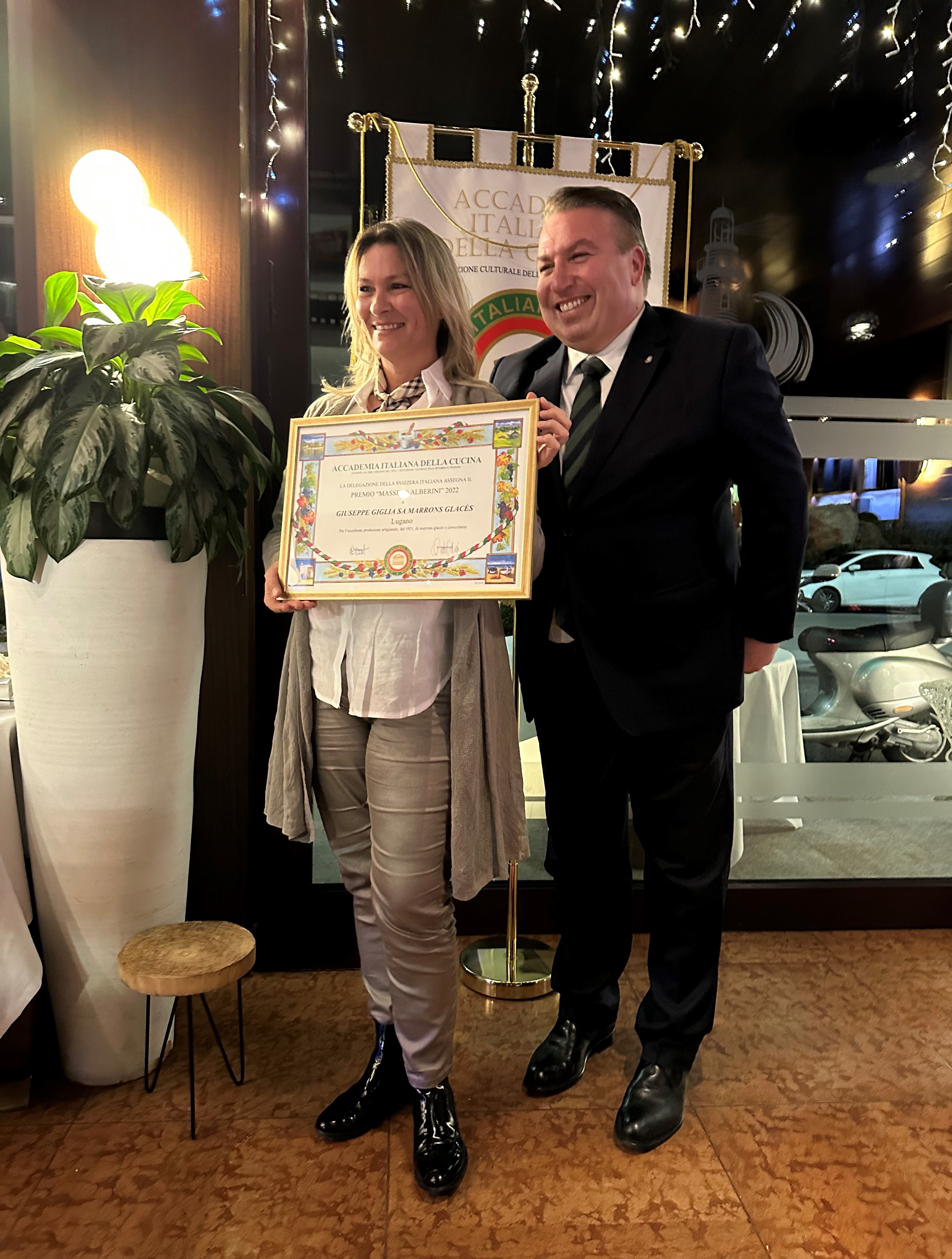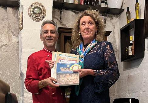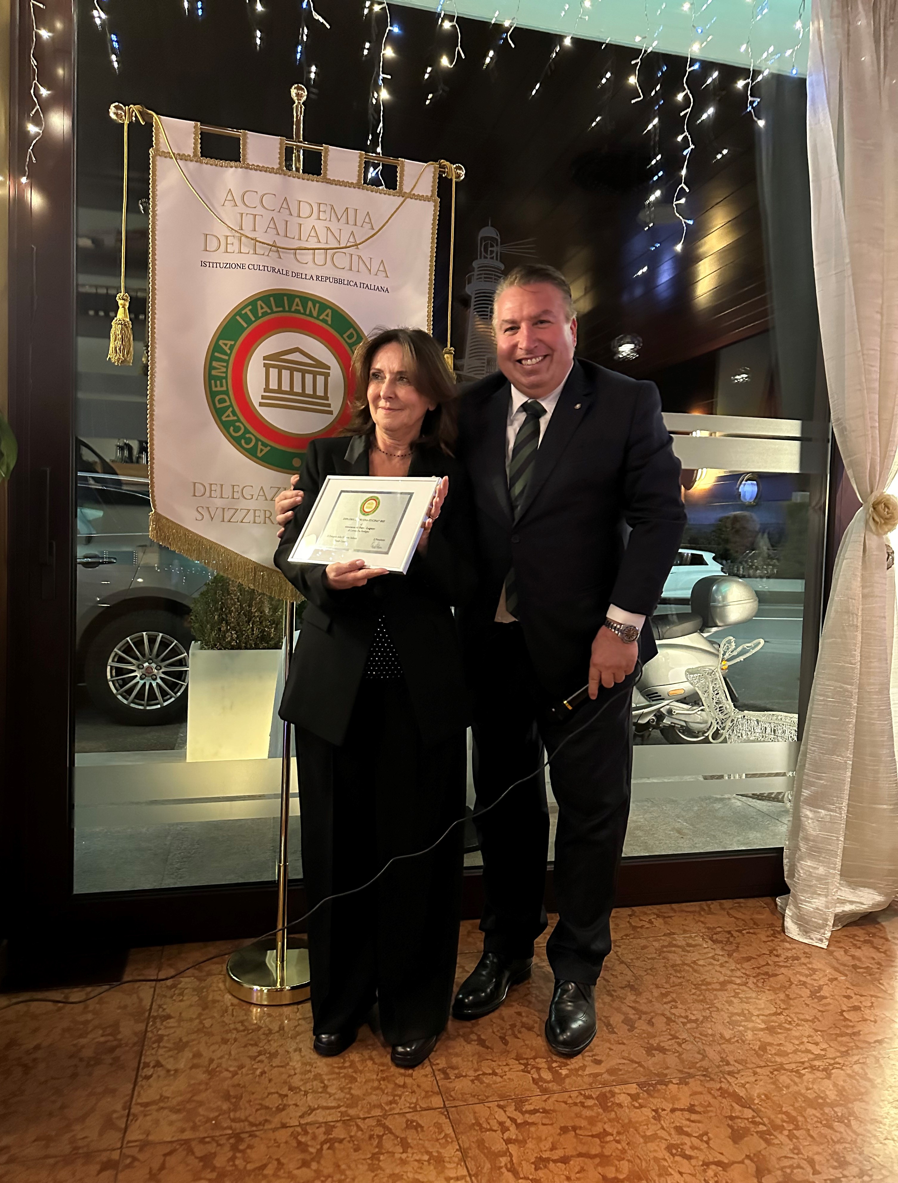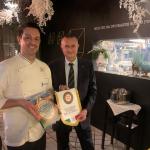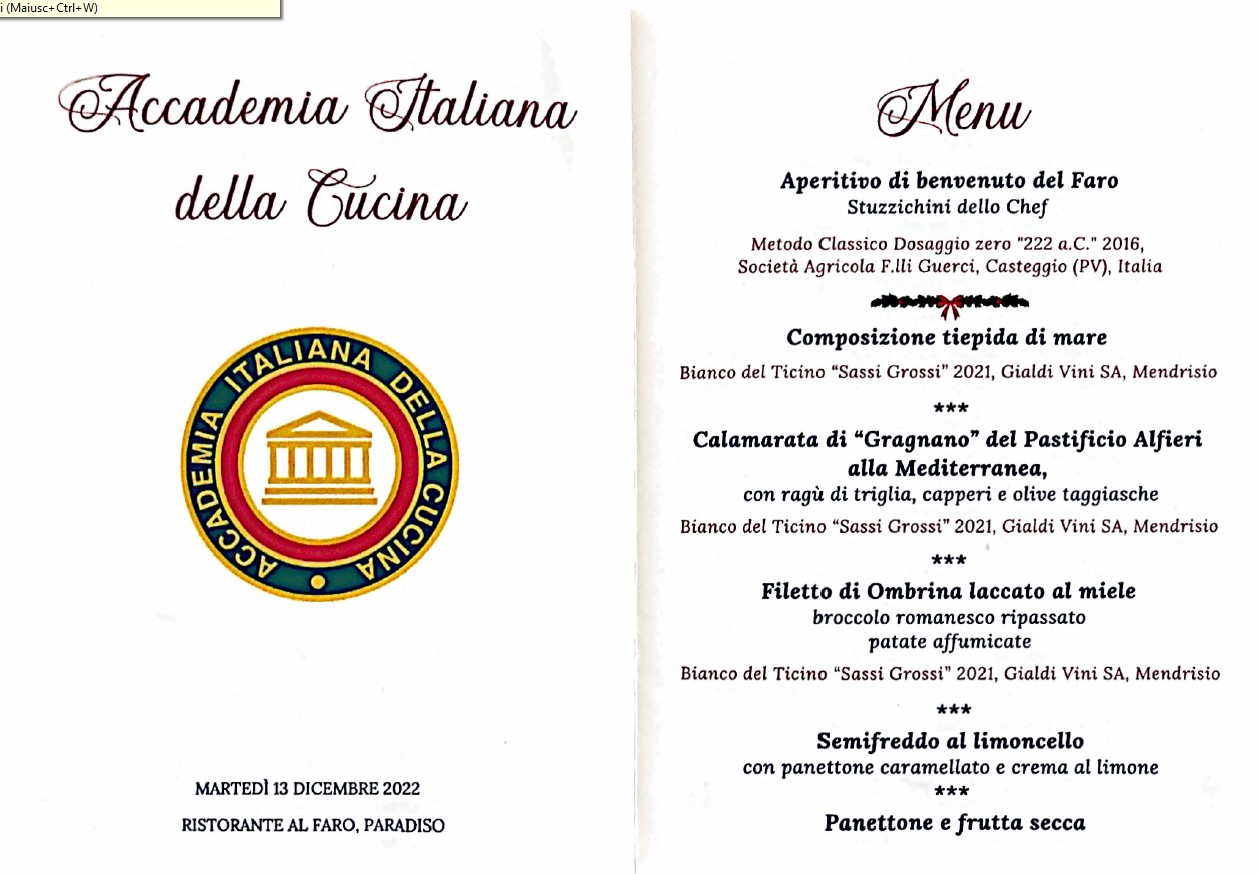 La sesta e ultima riunione conviviale del 2022 si è tenuta presso il ristorante Al Faro di Paradiso, dove, prima di iniziare il convivio, il Delegato Emilio Casati ha letto il ricordo del Presidente Petroni e fatto osservare a tutti i presenti un minuto di silenzio in memoria del caro Delegato Onorario Paolo Grandi recentemente scomparso. Durante la stessa sono stati consegnati i premi “Massimo Alberini” alla Giuseppe Giglia S.A. rappresentata dalla direttrice Cinzia Stuppia e il “Diploma di Buona Cucina” alla titolare Loredana Pia Bordogna del ristorante Al Faro. Ospite della serata il Consigliere di Stato del Cantone Ticino, on. Norman Gobbi. La serata ha riscosso un grande successo. Foto 1. Cinzia Stuppia (Giuseppe Giglia S.A) e il Delegato Emilio Casati. Foto 2. Loredana Pia Bordogna (ristorante Al Faro) e il Delegato Emilio Casati. Foto 3. Il menu. Foto 4. Composizione tiepida di mare.