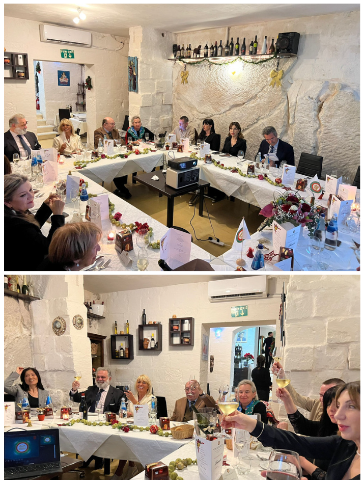 Un appuntamento pieno di emozioni quello della tradizionale cena degli auguri che ha coinciso con il decimo anniversario dalla fondazione della Delegazione di Malta. L'evento è stato organizzato presso il ristorante La Giara a Valetta. Con l’ausilio di diverse foto di repertorio, uno dopo l’altro si sono rivissuti gli eventi che nel corso degli anni sono stati più apprezzati in ambito culturale maltese. Più eventi hanno riguardato il binomio musica e cibo, altri hanno interessato l’antropologia del cibo con conferenze sulla Storia dell’Alimentazione o ne hanno toccato l’aspetto salutistico con l’intervento di medici esperti in nutrizione. Nel contesto della Settimana della Cucina Italiana nel Mondo si sono organizzati eventi dove arte, bellezza e cultura del cibo sono stati protagonisti. Ringraziamenti sono andati a tutti coloro che, esterni all’Accademia, hanno contribuito a renderla un’istituzione apprezzata e riconosciuta non solo dalla ristorazione locale ma anche dalla rete culturale e diplomatica di Malta. Prima fra tutti la giornalista Marie Benoit, gli Ambasciatori Luigi Marras E Mario Sammartino che ne hanno patrocinato gli eventi e i Direttori dell’Istituto di Cultura Salvatore Schirmo E Massimo Sarti che hanno strettamente collaborato con la Delegazione. I ringraziamenti si sono conclusi con uno spontaneo, caloroso applauso al Presidente Emerito di Malta Ugo Mifsud Bonnici che, negli anni, non ha mai mancato di accettare un invito dell’Accademia.