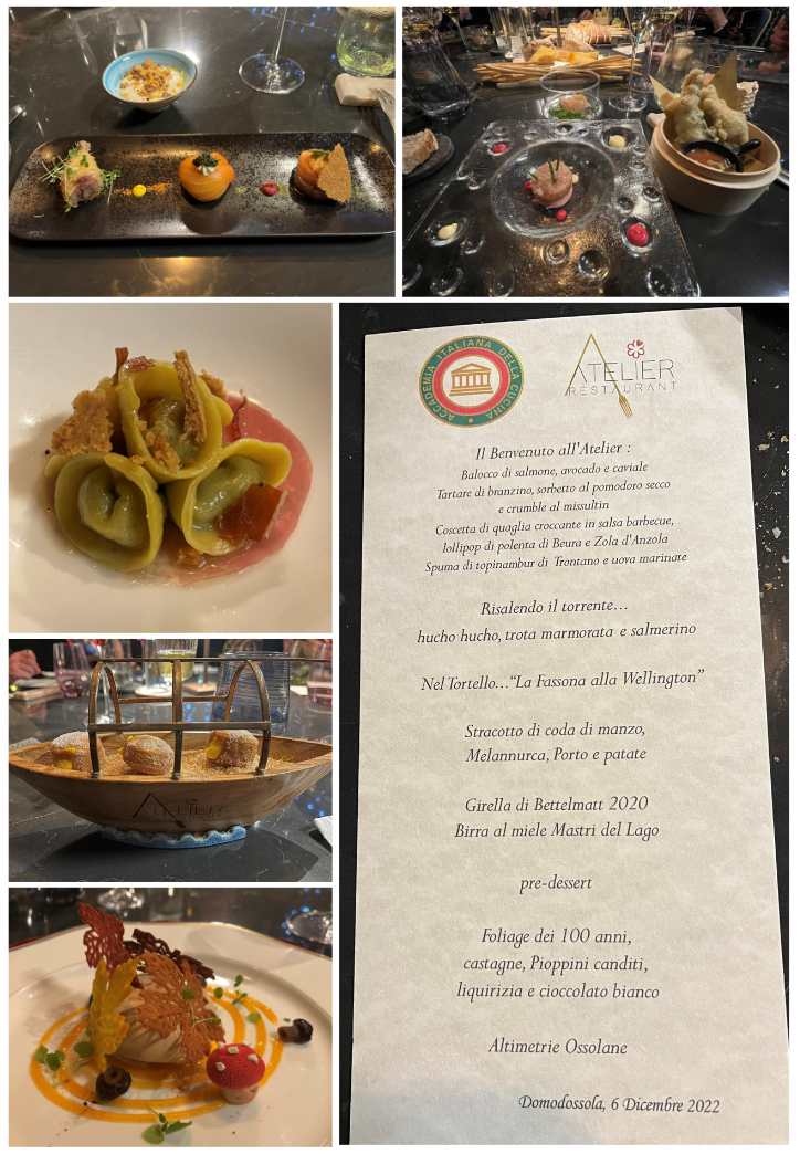 Dopo avere spaziato in questo 2022 tra lago e montagna, la Delegazione Val d’Ossola ha reso omaggio alla città di Domodossola recandosi presso il ristorante l’Atelier dello chef Giorgio Bertolucci per la cena degli auguri di Natale. Alla magia creata dalle raffinate decorazioni natalizie si è unito il mistero del menu, svelato solamente all’arrivo nella sala messa a completa disposizione degli Accademici. Dopo le classiche bollicine di Trento doc con assaggio di cinque diverse portate e l’antipasto di pesci d’acqua dolce, è stato servito il piatto forte, il tortello di fassona alla Wellington esaltato da un leggero brodo di prosciutto affumicato vigezzino e accompagnato da un ottimo Pinot nero del nord-est. A seguire, stracotto di coda di manzo, melannurca, porto e patate, e girella di Bettelmatt degustata con un’ottima birra al miele. Dopo il pre dessert, ecco il foliage dei 100 anni, dolce decorato da castagne, funghi pioppini caramellati, liquirizia e cioccolato bianco, dedicato al treno che percorre la valle Vigezzo. A fine cena il giovane chef si è intrattenuto con gli Accademici e ha ricevuto dal Delegato Paolo Rossi il libro sul tema del 2022 e il guidoncino della Delegazione.