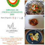 Un prelibato menu fra memoria e invenzione è stato proposto da Pietro D’Agostino per la riunione conviviale dedicata alla consegna del Diploma di Cucina Eccellente 2022 al suo ristorante “La Capinera” a pochi metri dal mare di Taormina. Il convivio è stato onorato dalla partecipazione del Consigliere di Presidenza Ugo Serra e del Coordinatore della Sicilia Orientale Vittorio Sartorio, salutati dal Delegato (Foto 1). La Delegazione, che ha gremito il ristorante ai limiti della recettività, ha unanimemente apprezzato la qualità di tutte le eccellenti portate (Foto 2) tutte basate su pescato, pasta, oli e agrumi e pane da grani antichi, strettamente locali, condite con pregiati olio di oliva e accompagnate da un gradevolissimo zibibbo di Pantelleria prodotto dalla casa. La consegna del Diploma (Foto 3) è stata celebrata entusiasticamente dagli Accademici presenti (Foto 4).