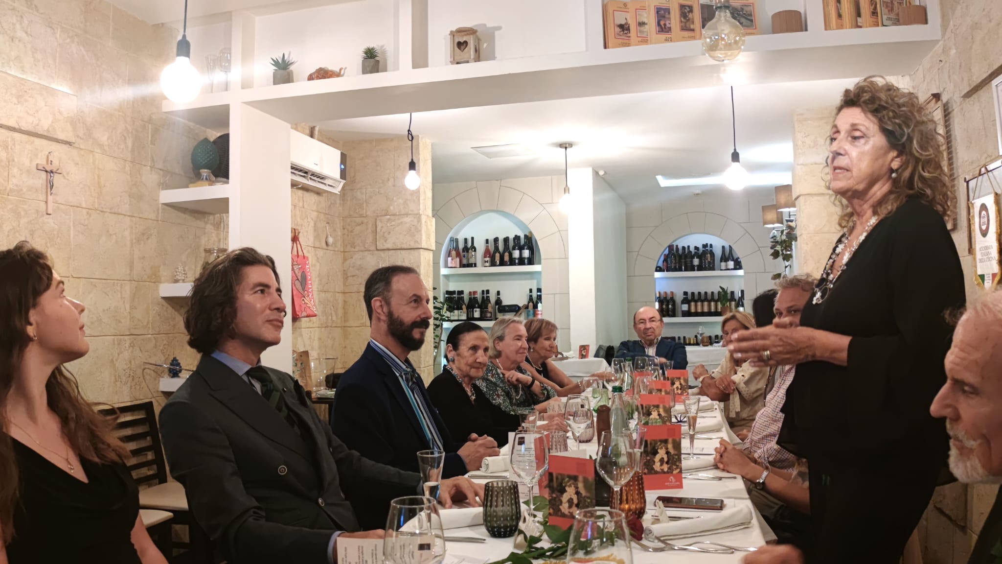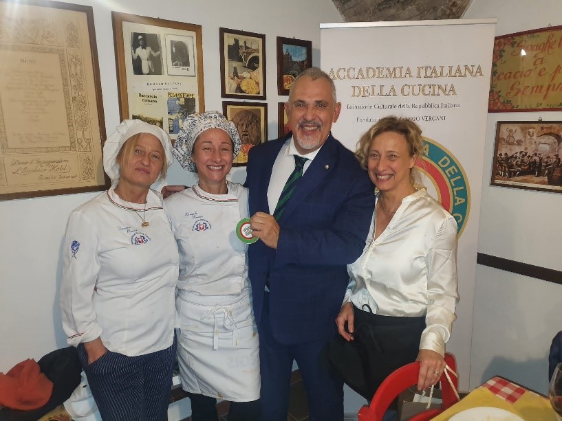 Riunione conviviale di settembre della Delegazione di Rieti presso “L’osteria delle tre sorelle Mancini”. Il ristorante, ormai storico reatino, ha iniziato l’attività nel 1995 con Sergio, padre delle attuali titolari Cristina, Francesca e Maria Sole, che si dividono tra cucina e sala con maestria, competenza e simpatia. Simposiarchi del convivio, Gianluca Di Blasio (foto 1) e il neo Accademico Giuseppe Morgante (foto 1 e 2). La serata è volta via allegramente, nel clima tipico dell’Osteria, allietata dalla lettura di poesie romanesche relative ai piatti degustati, da parte dell’Accademica Giovanna Palomba e dell’Accademico Roberto Giannursini. La Delegazione quasi al completo e i molti ospiti hanno potuto apprezzare un tipico menu romanesco, scelto dai Simposiarchi e dal Delegato. Coratella di abbacchio, tonnarelli cacio e pepe, rigatoni con la pajata, coda alla vaccinara cucinata, come da tradizione, con pinoli, uvetta e cacao amaro seguita dal bollito alla picchiapò, tipico piatto romano del riuso, con contorno di patate alla romana. Il dolce servito, eccezionale nella sua semplicità, è stata una mousse di ricotta condita con miele, noci e rum. La serata, che è stata una piacevole conferma, si è chiusa con la consegna da parte del Delegato Francesco Maria Palomba della vetrofania dell’Accademia alle tre sorelle Mancini (foto 2), con l’auspicio di rivedersi di nuovo quando sarà tempo di carciofi e puntarelle.