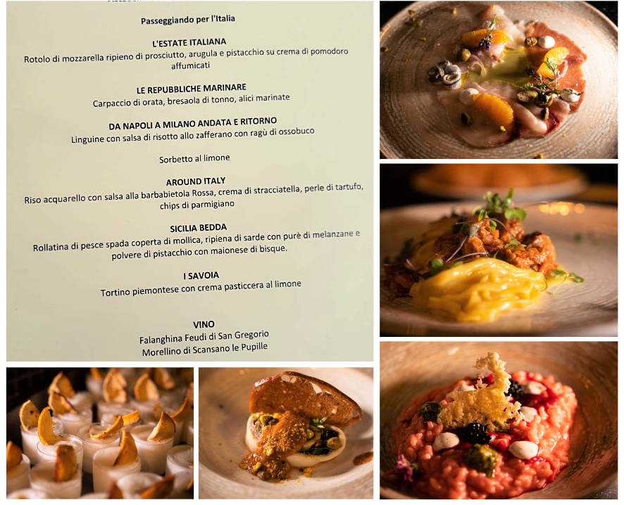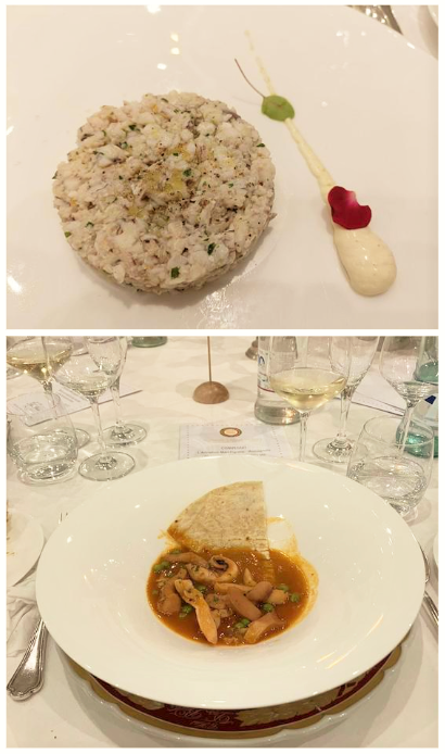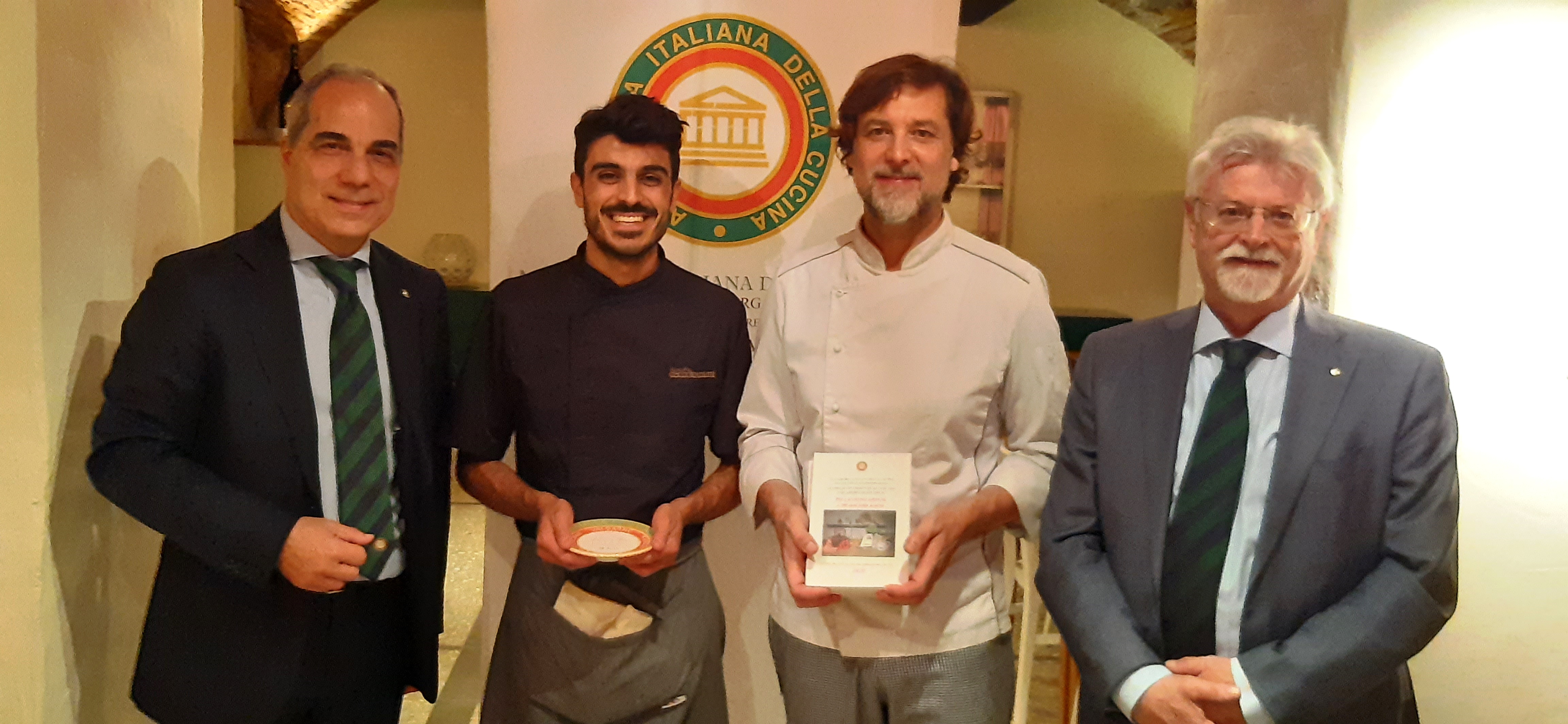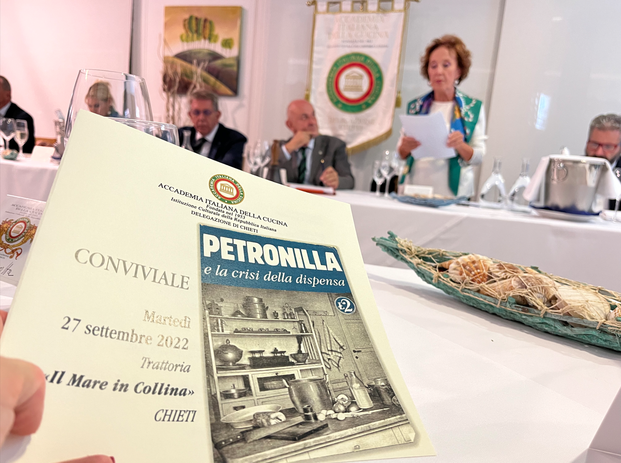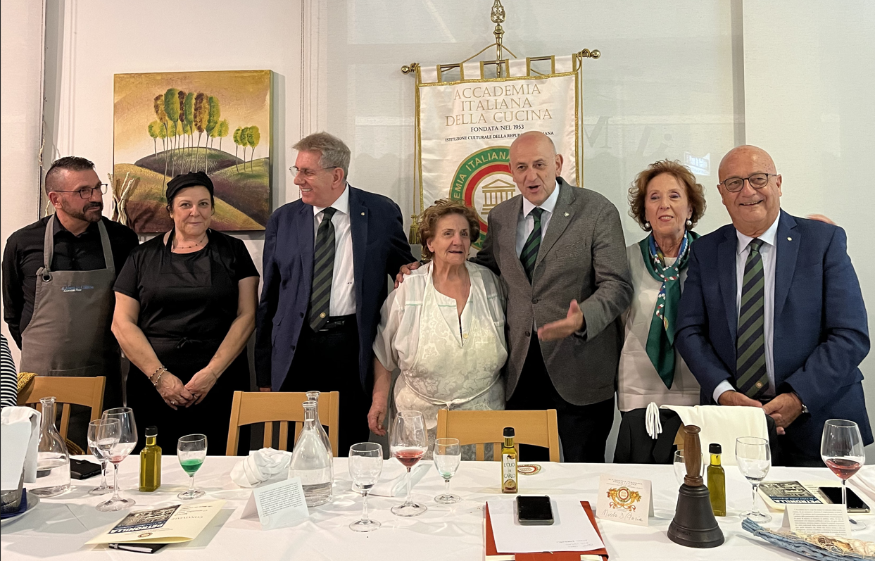 Protagoniste della riunione conviviale presso "Il Mare in Collina" sono state due donne: una in cucina, l’altra dominante nella relazione che ha aperto la serata. Bruna Mammarella Santuccione e la sua famiglia hanno dedicato la propria vita alla ristorazione, dal 1975 i Santuccione sono infatti gestori di alcuni tra i più importanti ristoranti di Chieti e nel 2015 avviano Il Mare in Collina con un’idea ben precisa, quella di proporre piatti che coniughino la tradizionale cucina marinara della costa teatina con quella dell’entroterra, rispettando la stagionalità, i prodotti dell’orto e della tradizione contadina. L’altra protagonista indiscussa è stata Petronilla, alias Amalia Moretti Foggia o Dottor Amal, attraverso la splendida relazione della Consultrice Gabriella Orlando che ha rapito i commensali raccontando il contributo che questa donna, dottoressa, farmacista, attivista politica, ha dato alla cucina italiana attraverso la sua rubrica “Ai Fornelli” della Domenica del Corriere tra gli anni ‘30 e ‘40. Un esempio di divulgazione e coesione sociale dal valore altissimo, in un momento di dolore, guerra e smarrimento del nostro Paese. Foto 1. Menu e relatrice Gabriella Orlando. Foto 2. Simposiarca Carlo Crocetta. Foto 3. Brigata di cucina. Foto 4. Uno dei piatti degustati.