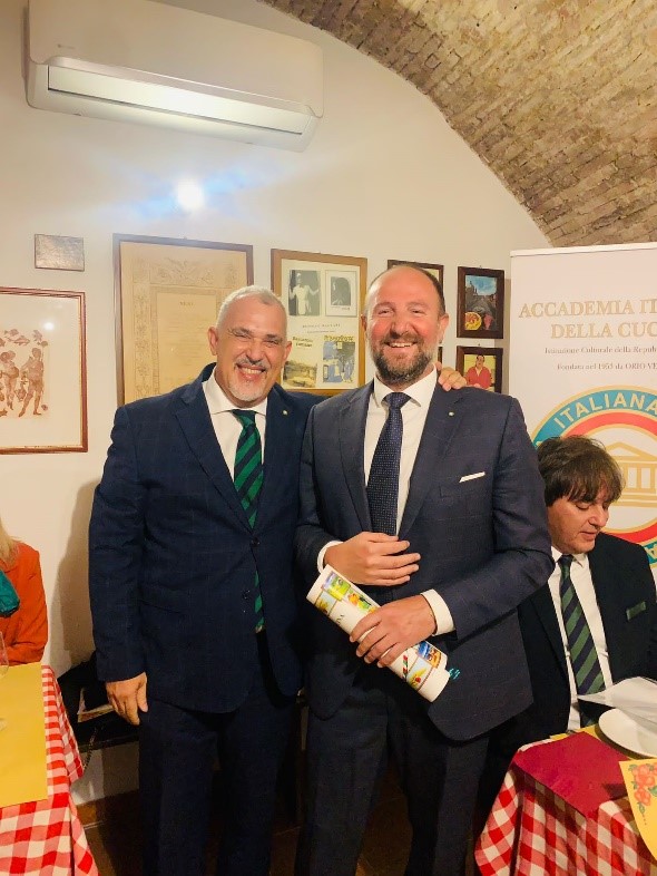 Un lungo abbraccio associativo all’Accademico Renato Andalò ha coronato la riunione conviviale settembrina tenutasi nel chiosco-ristorante Soul Kitchen di Toscanella di Dozza. Proprio nei giorni precedenti, Renato aveva donato all’Istituto di Riabilitazione di Montecatone un pulmino da 9 posti per degenti e famigliari. E la Delegazione ha reso omaggio all'Accademico consegnandogli un omaggio associativo tra gli applausi dei presenti. La serata è poi proseguita visitando il locale aperto da poco più di tre anni dai due giovani fratelli Russomanno che non si sono arresi davanti al concomitante inizio pandemico. Una scelta coraggiosa ma premiata, come testimoniato dalla qualità dei piatti, alcuni dei quali ad alto gradimento, degli abbinamenti con i vini e del servizio preciso ed efficiente emersi durante il convivio.