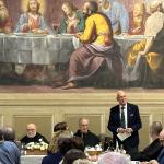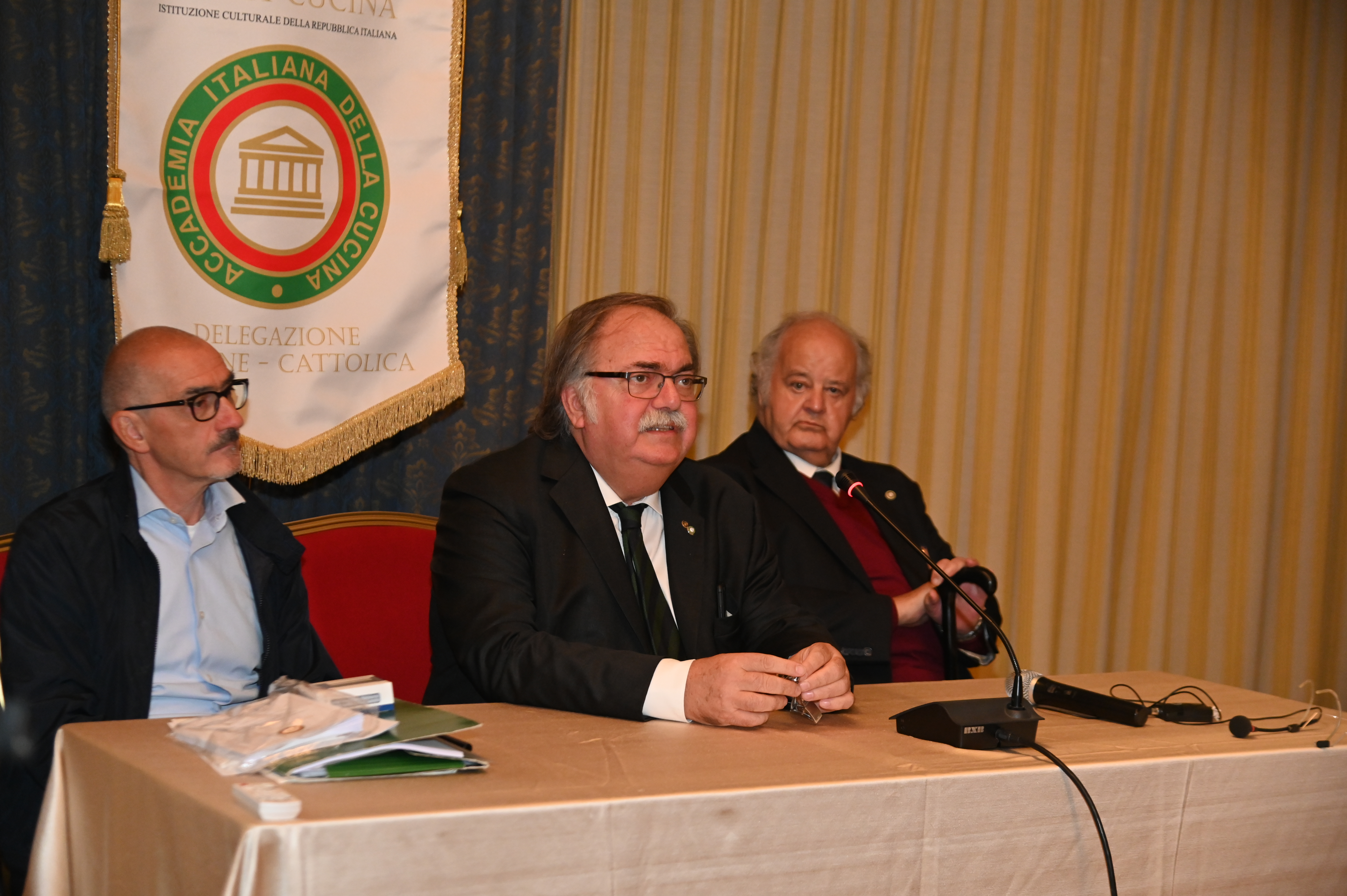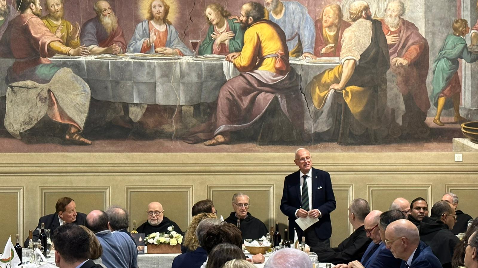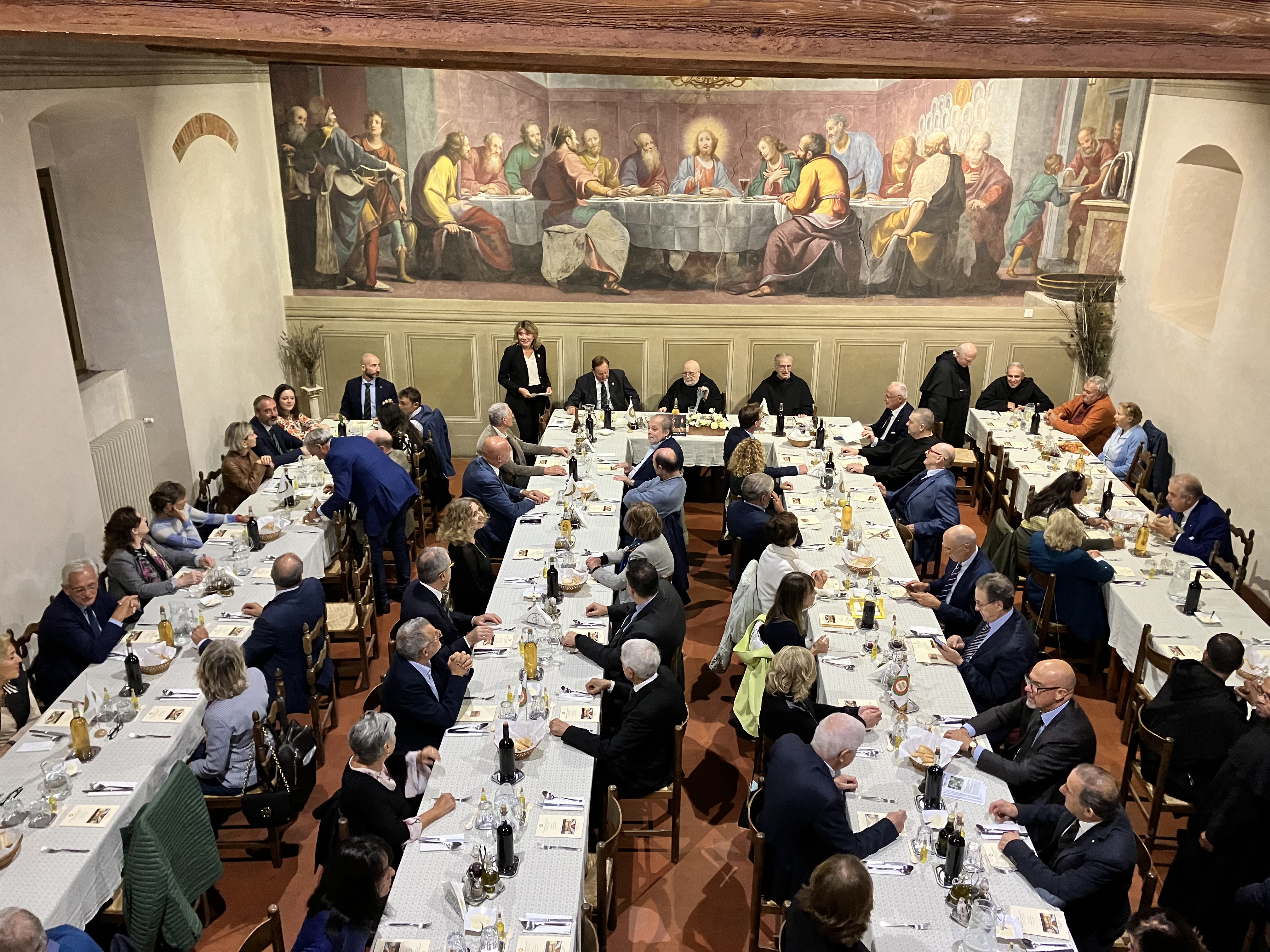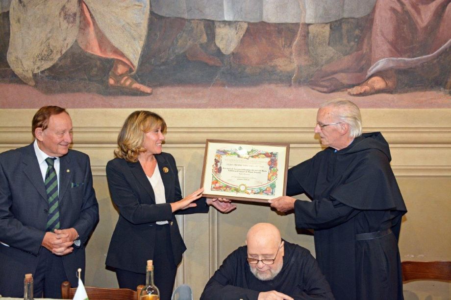 Gli Accademici delle due Delegazioni, alla presenza del Presidente Paolo Petroni, si sono riuniti nel Santuario di Monte Senario, uno dei più antichi della Toscana (1234), circondato da una splendida abetaia e situato nel Comune di Vaglia (FI). L'evento conviviale si è tenuta nel suggestivo refettorio del Convento, dove gli Accademici e le numerose autorità presenti - tra cui il Segretario Generale e Delegato di Firenze Roberto Ariani, il CT Toscana Est Roberto Vasarri, il DCS Toscana Est Roberto Doretti e il Sindaco di Vaglia Leonardo Borchi - sono stati ospitati dai Frati dell’Ordine dei Servi di Maria per condividere la loro mensa. Dopo i saluti e i ringraziamenti della Delegata del Mugello Monica Sforzini, il Segretario Generale Roberto Ariani, quale Delegato di Firenze, ha evidenziato l’importanza che da sempre il Santuario ha per i fiorentini. L’occasione dell’incontro è stata la consegna ai Frati Serviti del prestigioso Premio “Dino Villani” 2022 per la “Gemma d’Abeto”, un liquore di raffinata bontà prodotto dal 1865 ai giorni nostri, prima nella farmacia e poi nella Distilleria del Convento, secondo una antica ricetta gelosamente custodita e tramandata dai Frati. Durante la cerimonia di consegna del premio il Presidente Petroni ha ricordato in particolare la figura di Dino Villani, maestro di pubblicità, fondatore tra i più insigni dell’Accademia e ideatore del premio. Foto 1. Il refettorio durante i saluti della Delegata. Foto 2. Intervento del Presidente Paolo Petroni. Foto 3. Consegna del Premio a Padre Giovanni M. Sperman. Foto 4. L'intervento del Segretario Generale e Delegato di Firenze Roberto Ariani.