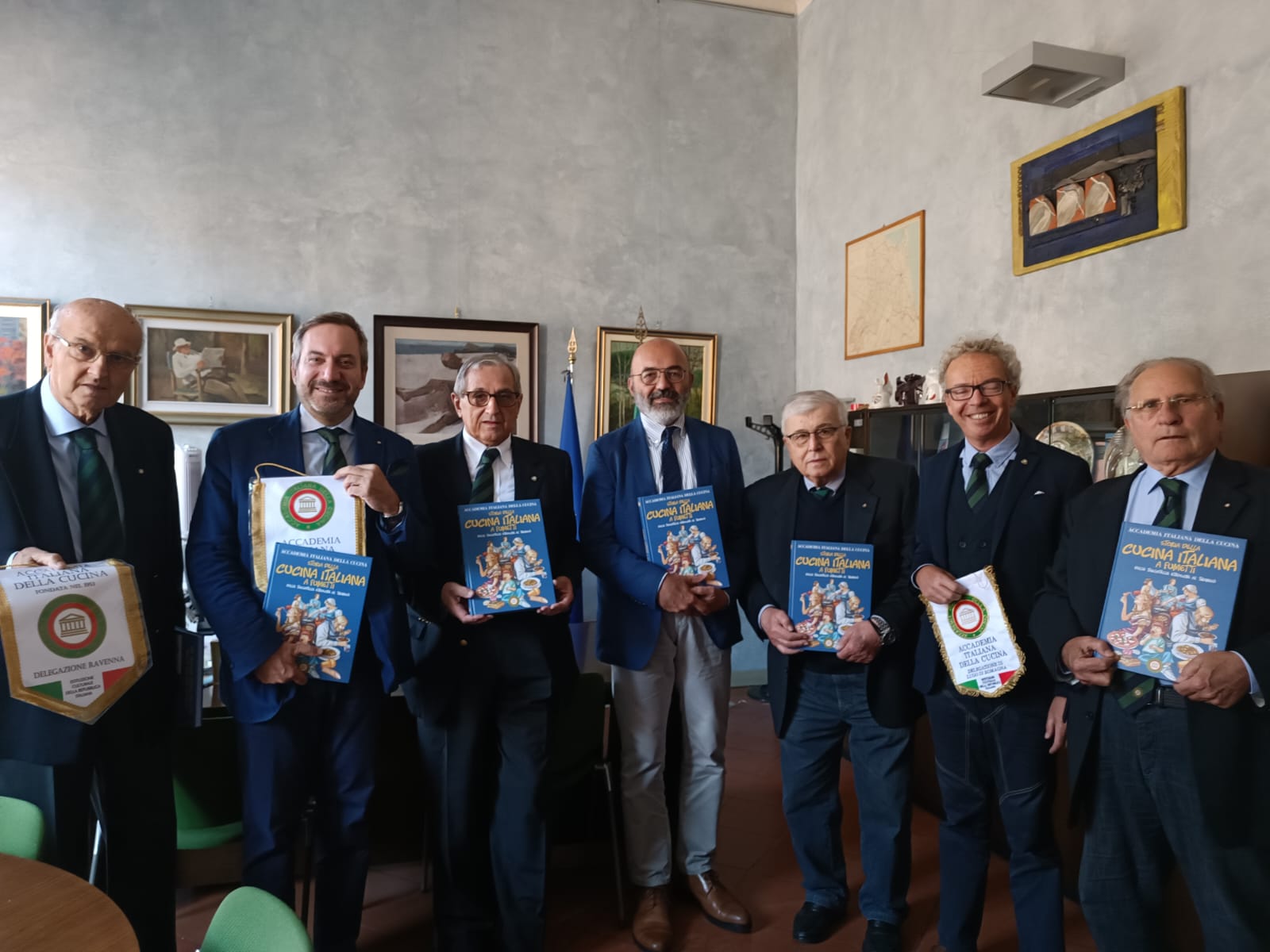 Le Delegazioni di Ravenna, Cervia-Milano Marittima, Faenza, Lugo di Romagna dell'Accademia Italiana della Cucina hanno donato, a tutte le Scuole di ogni ordine e grado della Provincia di Ravenna, una copia del volume “Storia dell’Accademia Italiana della Cucina – dalle tagliatelle etrusche al tiramisù” da inserire nelle rispettive biblioteche. La consegna dei volumi è avvenuta nei locali dell’Ufficio Scolastico Regionale - X Ambito Territoriale di Ravenna, alla presenza del Dirigente dott. Paolo Bernardi che si è complimentato per la gradita iniziativa culturale. I volumi, tramite l’Ufficio Scolastico Territoriale, saranno distribuiti alle biblioteche delle singole scuole di tutta la Provincia di Ravenna.In foto, da sinistra: Francesco Donati (Vice Delegato di Ravenna), Leonardo Colafiglio (Delegato di Faenza), Davide Rossi (Delegato di Ravenna), dott. Paolo Bernardi (Dirigente Scolastico), Gian Bruno Pollini (Delegato di Cervia-Milano Marittima), Fabio Monducci (Delegato di Lugo di Romagna) e Gino Pinza (Tesoriere di Ravenna).