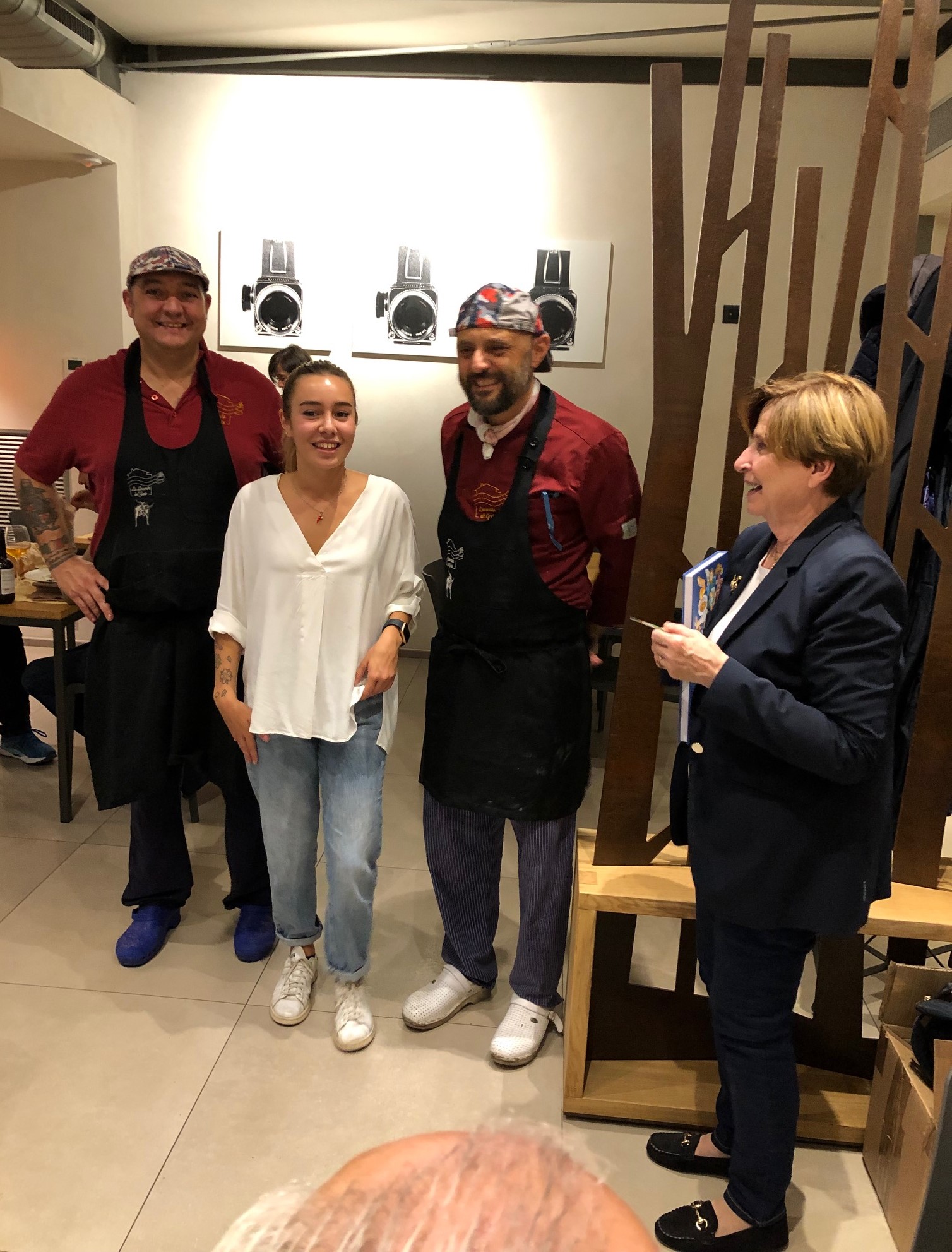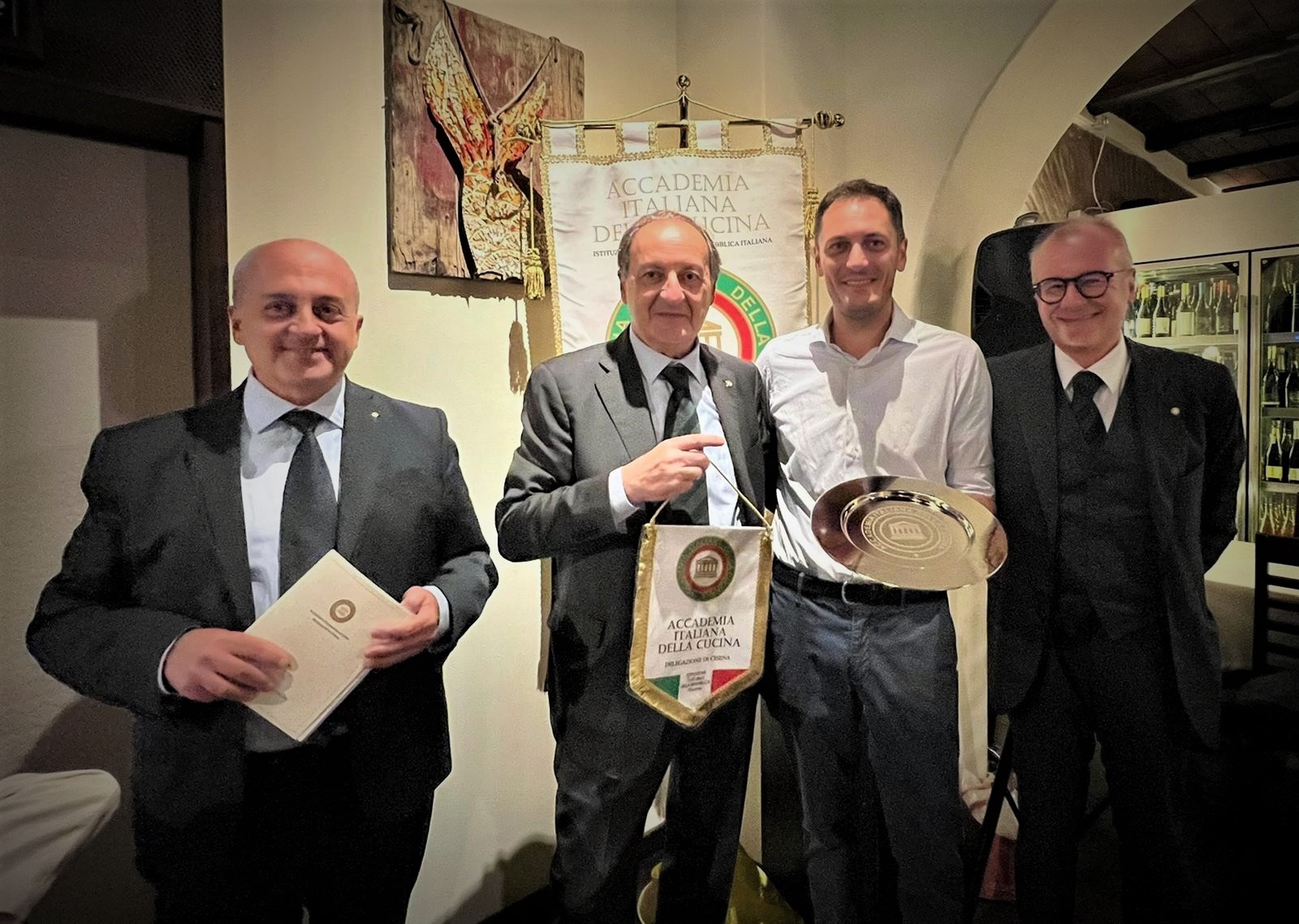 Una bellissima serata per la Delegazione al ristorante “Smaller” di Michele Monteleone, preceduta dalla riunione della Consulta della Delegazione, i cui membri hanno definito gli appuntamenti per l'anno in corso con particolare attenzione alla Cena Ecumenica, alla VII edizione della Settimana della Cucina Italiana nel Mondo e alla riunione conviviale per il Santo Natale. Simposiarchi della serata, Stefano Valentino Piva e Cesare Tabarrini. I piatti proposti dallo chef Andrea De Masi sono stati molto apprezzati per l’originalità degli abbinamenti e la freschezza degli ingredienti. Ancora una volta la buona cucina e la calda atmosfera hanno accolto i partecipanti in un incontro connotato da rinnovato entusiasmo e testimoniato da momenti di sincera emozione, quando il Delegato Andrea Negri ha consegnato, agli Accademici Piero Tonelli e Pier Luigi Ceccoli, l’attestato rispettivamente di trentacinque e di venticinque anni di appartenenza all’Accademia. Foto 1. La consegna degli attestati agli Accademici Tonelli e Ceccoli. Foto 2.Titolare Monteleone, chef De Masi, Delegato Negri; Delegato e Segretario Elisabetta Righi Iwanejko. Foto 3. Il Delegato illustra lo Statuto e il Regolamento aggiornati. Foto 4. Piatti.