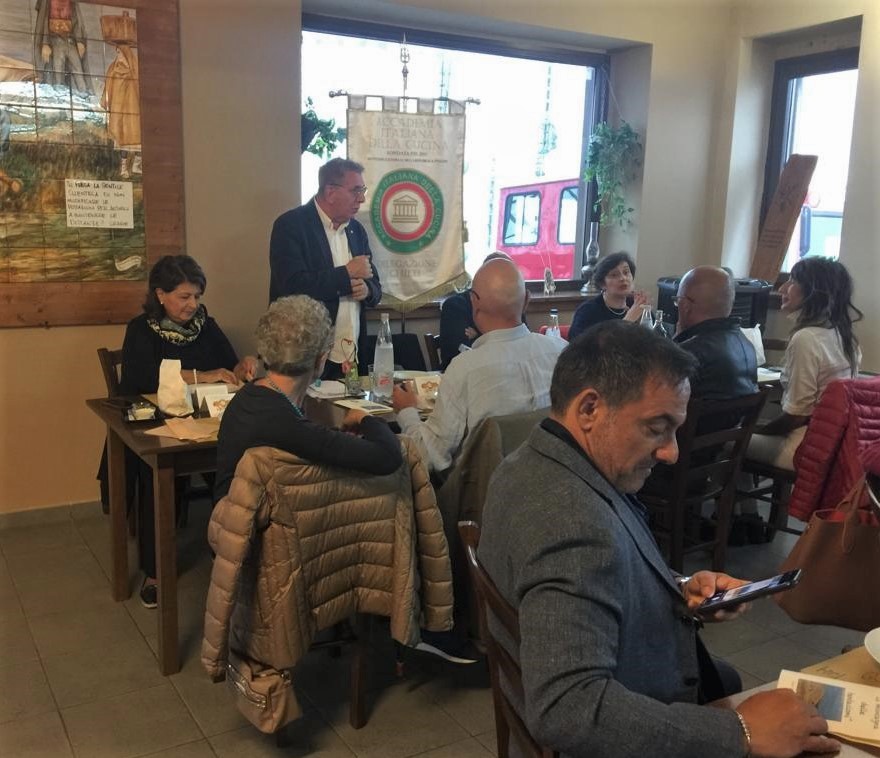 Il menu della memoria. Questo il titolo della proposta messa in tavola per la Delegazione potentina dalla famiglia Guarini-Allegretti, proprietari e gestori della Foresteria di San Leo a Trivigno (PZ). Antico eremo benedettino del 1300, comprendente i resti dell'Abazia di San Leone e oltre centocinquanta ettari di terreno coltivati di proprietà dalla famiglia Guarini da circa un secolo, la Foresteria diventa una struttura ricettiva apprezzata dai turisti in cerca di tranquillità circa vent’anni fa, quando Peppino Guarini e sua moglie Maria Giovanna, scelgono di “condividere i silenzi, i colori e i profumi di questo pezzetto di storia”, affacciato sulle suggestive Dolomiti lucane. Il ristorante è riservato agli ospiti della Foresteria, ma si apre all'esterno per piccoli numeri. Sotto la direzione attenta di Maria Giovanna, instancabile ricercatrice di ricette e sapori della tradizione, arrivano nel menu l'uovo alla purgatoria, la minestra di cicerchie, i ravioli con ricotta e noci, i bocconcini di maiale con peperoni in agrodolce, i dolci delle occasioni speciali. Il tutto, dalla carne ai formaggi, prodotto nell'azienda annessa, alla cui gestione si è aggiunta oggi la figlia Andreana. Ingredienti di una conviviale molto partecipata e allegra, durante la quale è stato consegnato il diploma di appartenenza venticinquennale all'Accademico Donato Mancino.