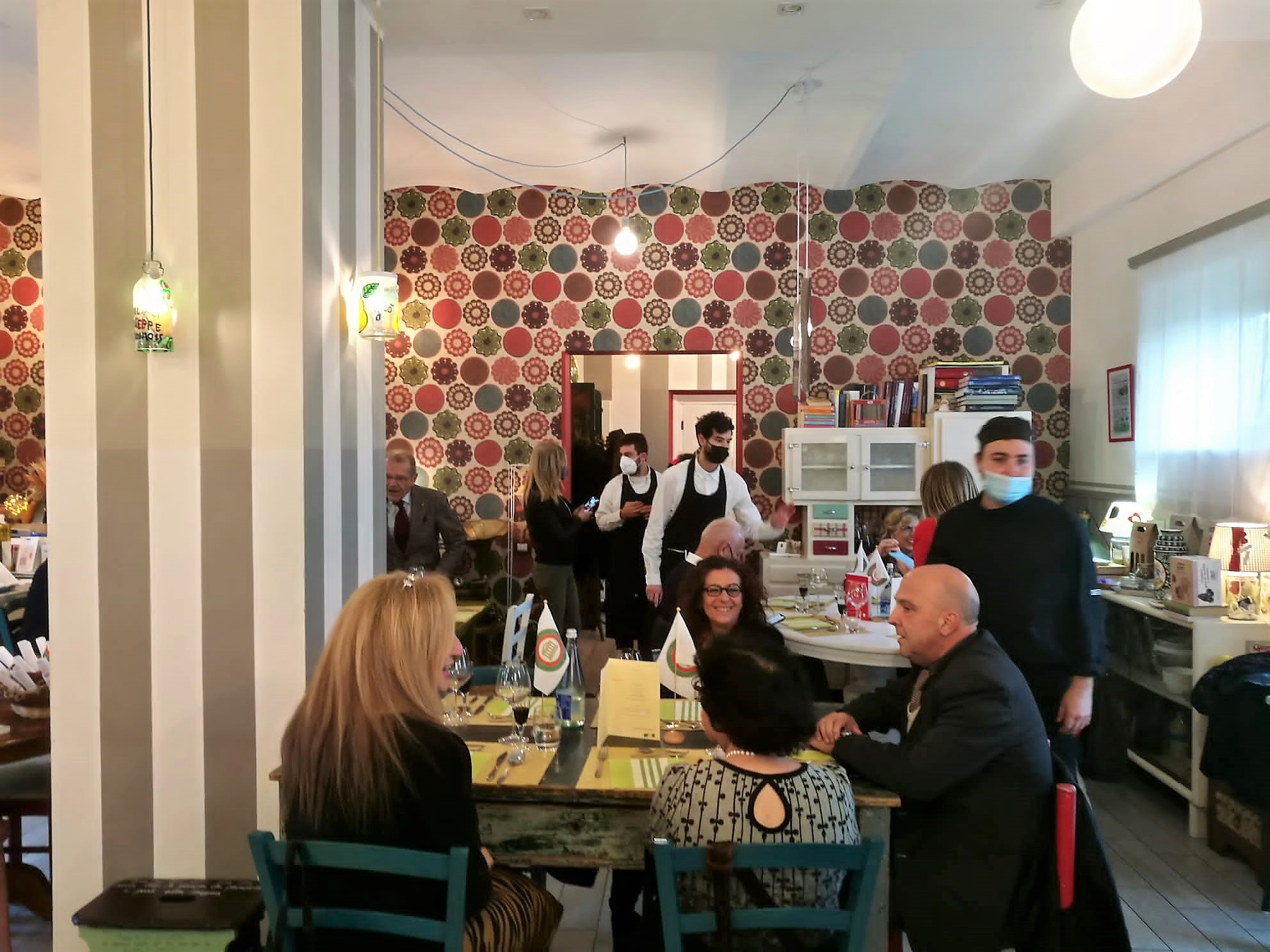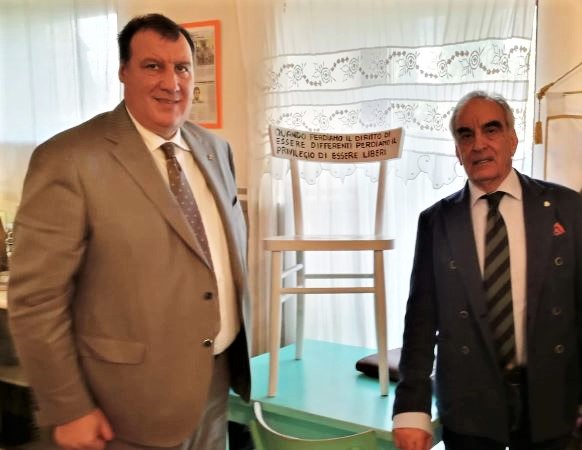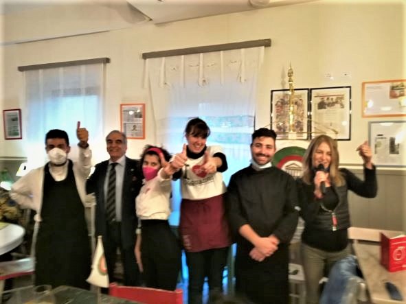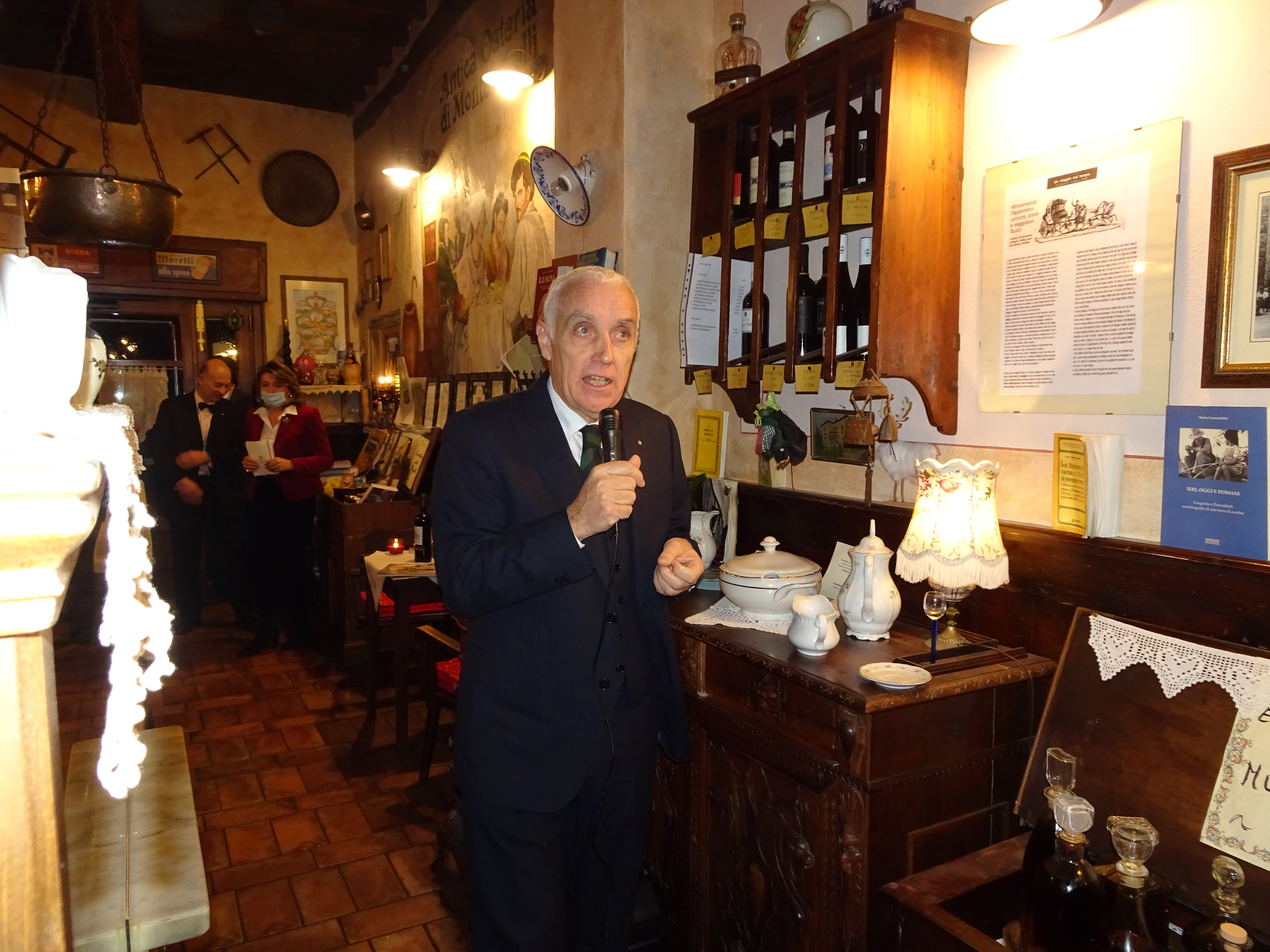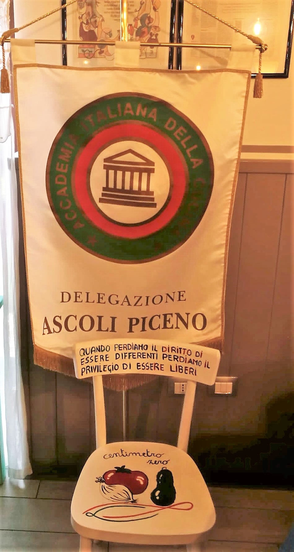Riunione conviviale dedicata al Sommo Poeta Dante Alighieri nel 700° anno dalla sua morte, egregiamente organizzata dal Simposiarca Luciano Vesperini, studioso dantista, presso la "Locanda centimetro zero" in loc. Pagliare (AP), così denominata perché gli ingredienti impiegati dallo chef Paolo Fusco sono tutti prodotti e coltivati in terreni ubicati nelle vicinanze della Locanda e di proprietà della stessa. Particolarità è che la locanda è gestita da una Cooperativa sociale con finalità di inserimento nel mondo del lavoro di giovani disabili che lavorano e si formano all'interno dell'esercizio di ristorazione, servendo, con grande simpatia, la clientela (in foto 1 con il Delegato Ricci). Tra gli invitati, il Questore della provincia di Ascoli Piceno dott. Alessio Cesareo che ha avuto parole di ammirazione per il lavoro portato avanti dalla Locanda (in foto 2 con il Delegato). Una nota particolare, la realizzazione di una sedia che riporta nella spalliera una frase a sostegno della disabilità, sedia donata al Presidente Mattarella, il quale, nel messaggio di fine d'anno, l'ha citata integralmente.