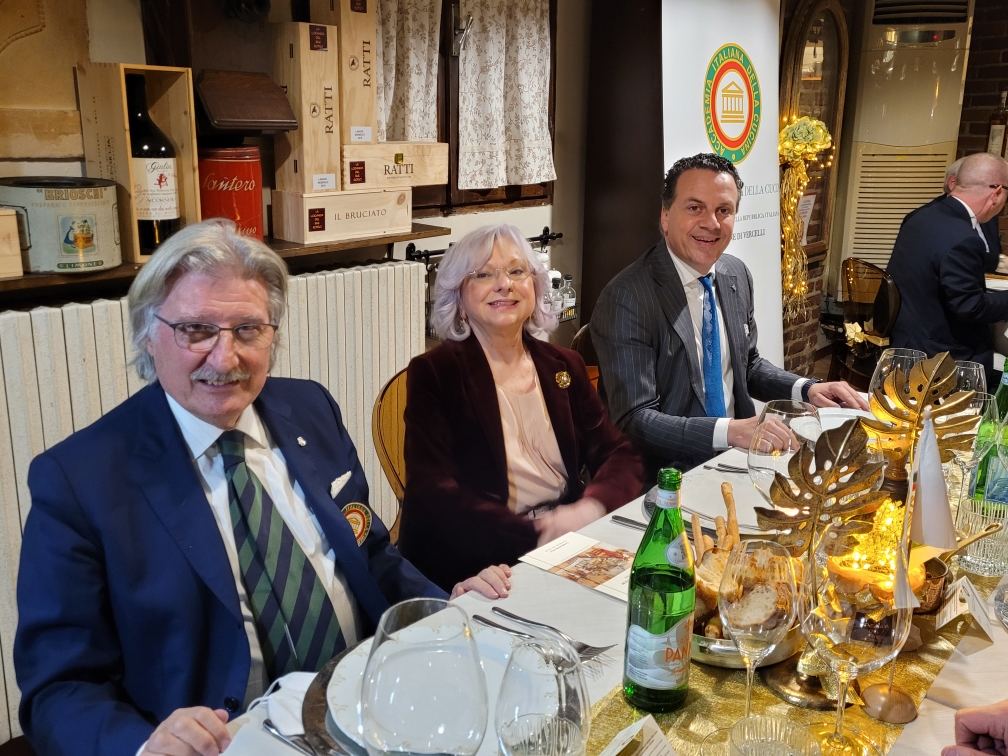 In occasione del convivio degli auguri della Delegazione di Vercelli presso la Locanda del Bue Rosso, la Delegata Paola Bernascone, presente il Coordinatore territoriale Piemonte Est Piero Spaini, ha dato il benvenuto ai due nuovi Accademici Luca Vannelli e Gian Maria Gagna. La riunione conviviale è stata molto partecipata e la Delegata, lieta nel ritrovarsi in presenza, ha ricordato quanto fatto dalla Delegazione anche in piena pandemia con gli eventi on line. Si è poi passati agli approfondimenti culturali e gastronomici sull’origine del buffet, sul servizio alla russa, sull’introduzione del menu e sull’attuale e molto diffuso servizio all’italiana: semplice da eseguire, veloce, informale, il cibo viene disposto direttamente in cucina nei piatti che vengono serviti in tavola da un cameriere. La Delegata ha poi omaggiato con un cadeau tutti gli Accademici: un grembiule da cucina, ricamato con il logo dell’Accademia. Foto 1. Piero Spaini CT Piemonte Est, Paola Bernascone Delegata di Vercelli, Eraldo Botta Presidente della Provincia di Vercelli. Foto 2. Accademico Gian Maria Gagna. Foto 3. Accademico Luca Vannelli.