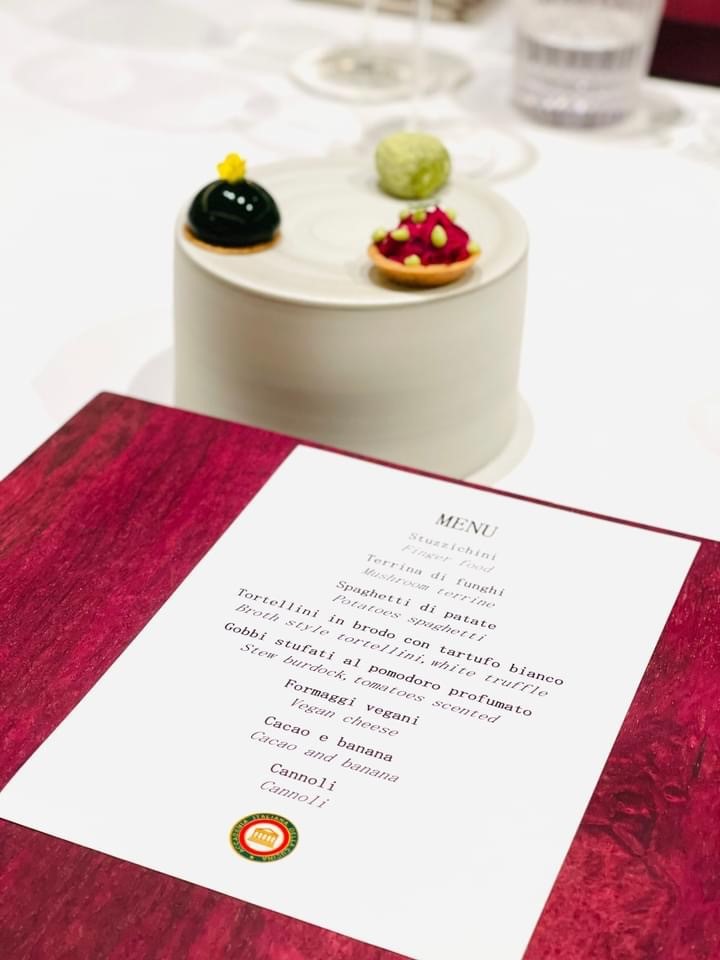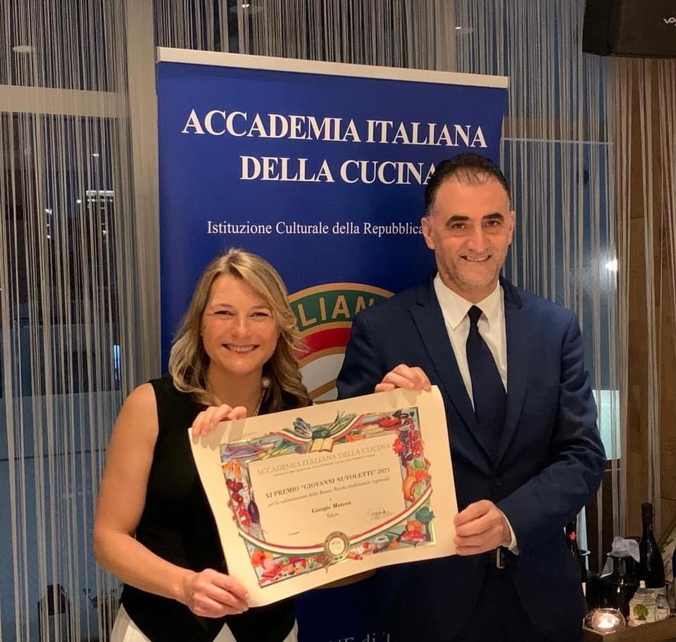 Numerosi e di grande spessore gli eventi organizzati in Giappone per la VI edizione della Settimana. A Tokyo, la manifestazione si è aperta con la conferenza stampa presso l’Ambasciata Italiana a Tokyo (foto 1). Alla presenza di un importante numero di giornalisti, l’Ambasciatore SE Gianluigi Benedetti ha presentato le iniziative con l’intervento di Italian Trade Office, Camera di Commercio Italiana e della Legazione di Tokyo della Accademia Italiana della Cucina. Primo evento organizzato dalla Legazione è stato il webinar “Sustainability and Traditional Italiana Cuisine”, patrocinato dall’Ambasciata italiana e con l’intervento introduttivo di SE Benedetti e, per l’Accademia, del Segretario Generale Roberto Ariani. Dopo i saluti iniziali e una introduzione al tema della Legata Emanuela Orighi è intervenuto lo chef Simone Cantafio della Stüa de Michil in Corvara che ha illustrato il proprio approccio sostenibile in una cucina professionale; a seguire hanno presentato i propri progetti Food Loss Bank con “Ugly Love”, Chefs for the Blue che porta avanti una campagna sulla pesca sostenibile, la community Eas-Y Green e Green-Will. A marcare il concetto di sostenibilità, la riunione conviviale sulla cucina italiana interpretata in chiave vegana dallo chef Kotaro Noda del ristorante Faro Shiseido che ha suscitato molto apprezzamento nei commensali (foto 2 il menu). Sempre guidati dal tema di quest’anno e in collaborazione con l’associazione Chefs for the Blue e chef di cucina Italiana a Tokyo, è nato un booklet di ricette sostenibili di cucina familiare distribuito in formato digitale in lingua italiana e giapponese. La Legazione ha poi presentato presso il rinomato Nutrition Hattori College la sua attività sul territorio e, anche quest’anno, era nella giuria del GranConcorso di Cucina organizzato dalla Camera di Commercio Italiana in Giappone. Le attività si sono concluse a dicembre con il convivio Goloso Dante presso il ristorante DiGiorgio (foto 3) in cui si sono degustati piatti ispirati alla Divina Commedia e alla cucina medievale. Al patron del ristorante Giorgio Matera è stato nell’occasione consegnato il premio Giovanni Nuvoletti (foto 4).