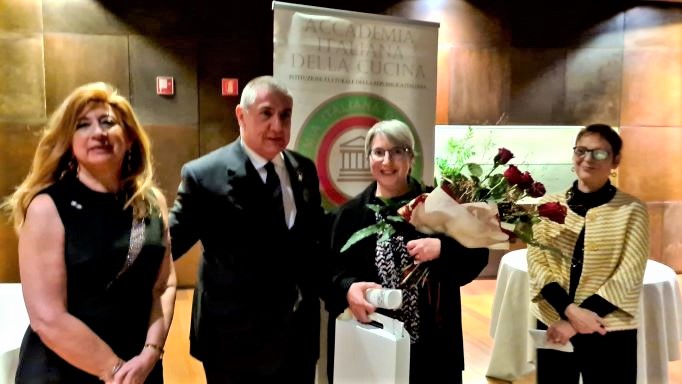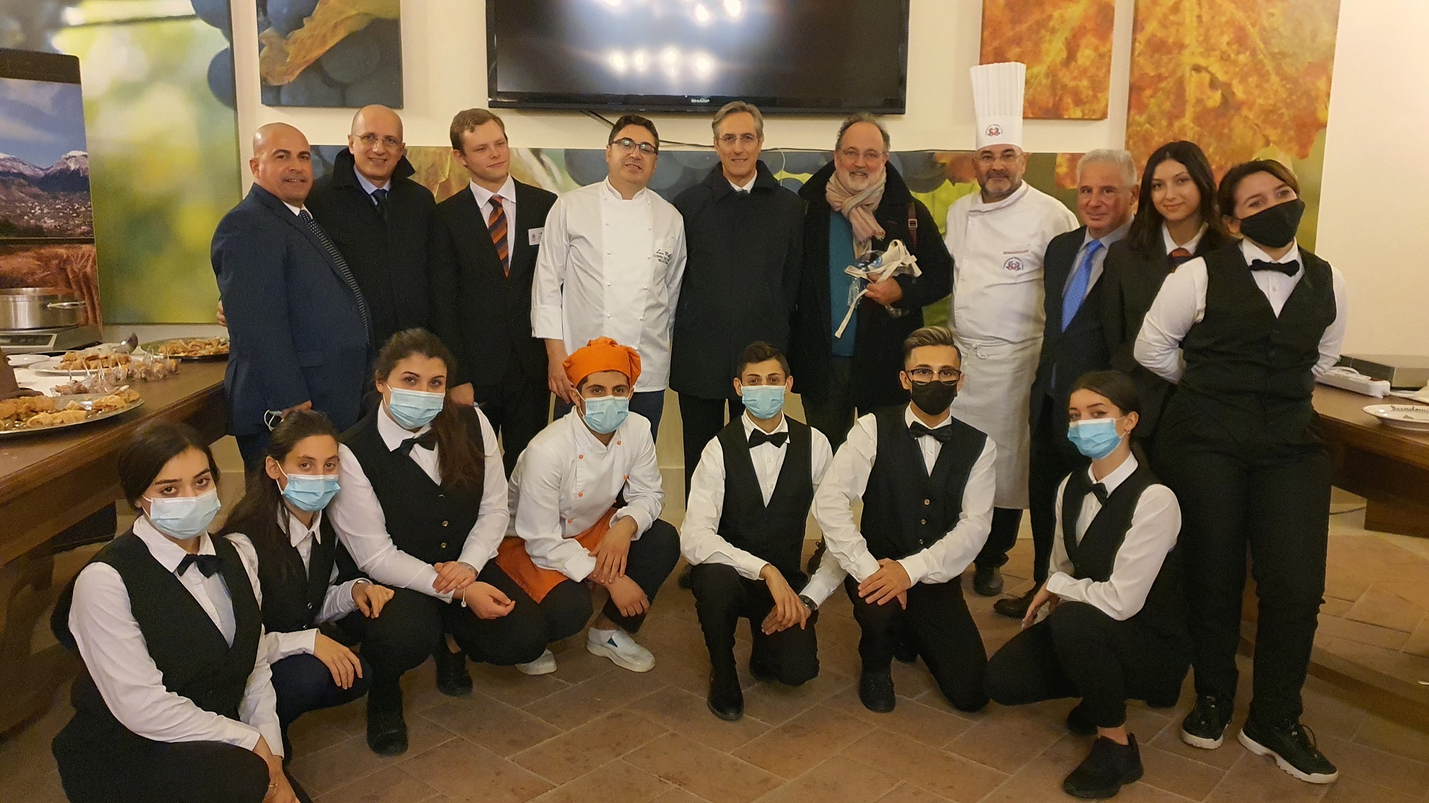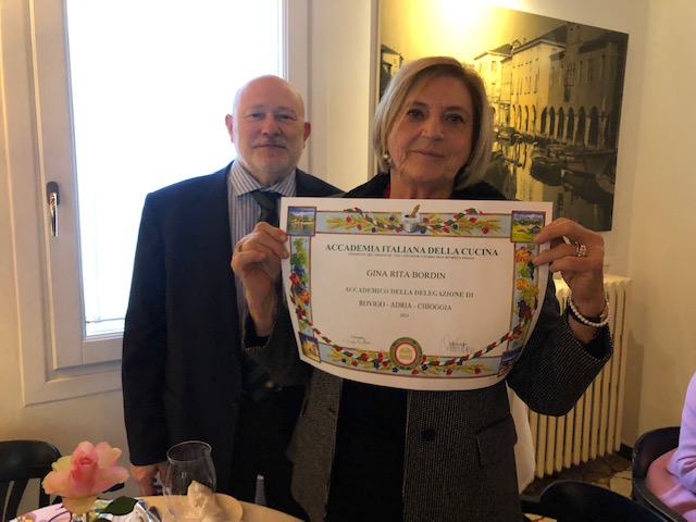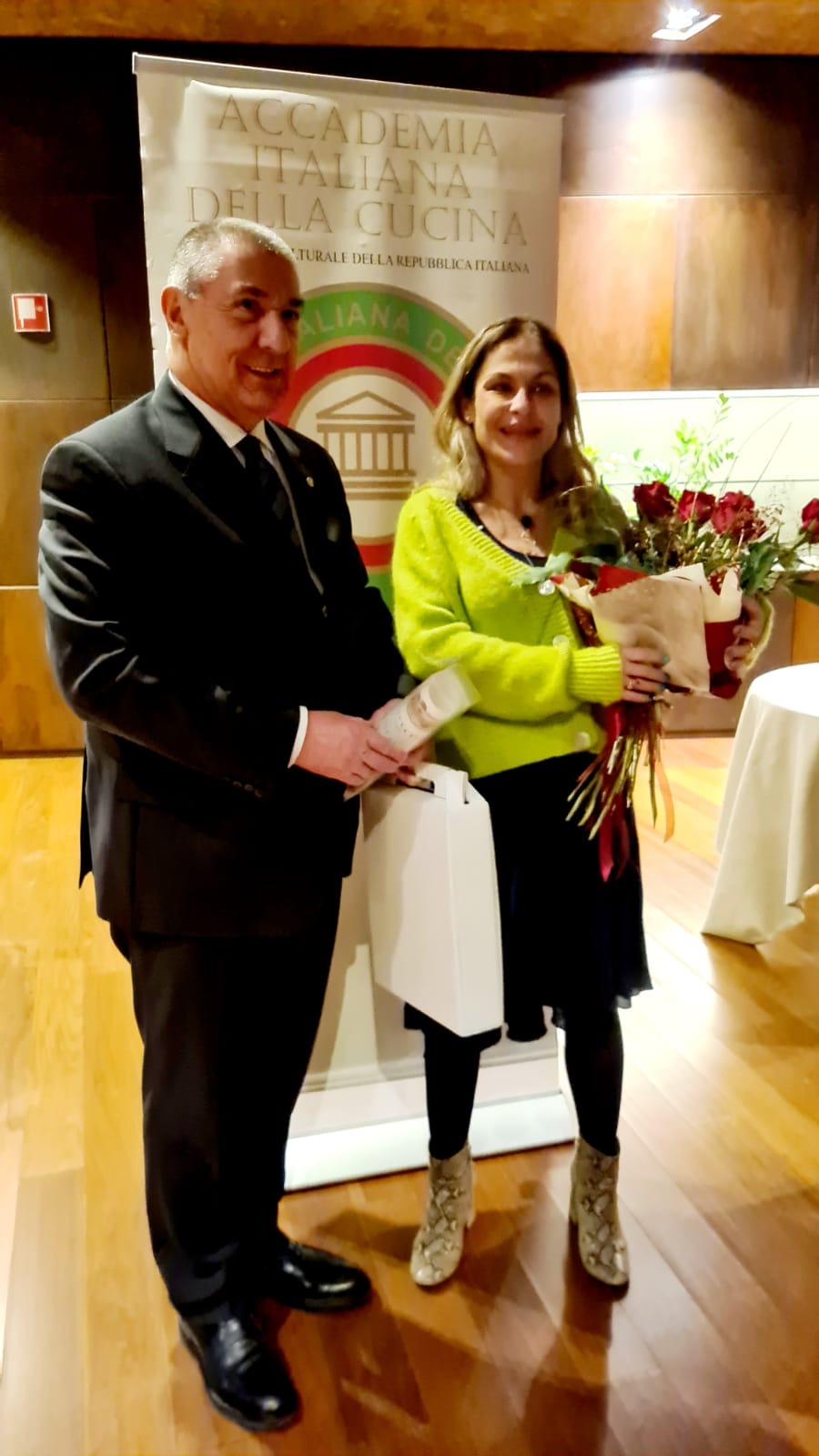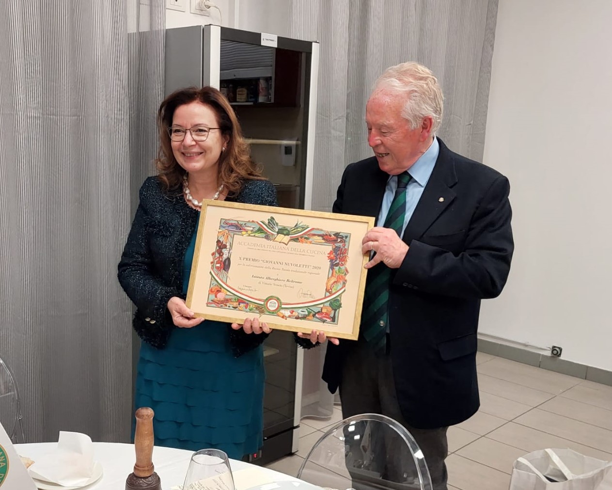 Le forti limitazioni della pandemia e gli impegni scolastici dell’Istituto hanno reso possibile solo a distanza di un anno la consegna del Premio Giovanni Nuvoletti 2020 all’Istituto Alberghiero “Alfredo Beltrame” di Vittorio Veneto (TV). La cerimonia è stata organizzata nelle sale della scuola in occasione di una riunione conviviale che ha visto la partecipazione del corpo insegnanti, degli studenti e degli Accademici. Durante la serata sono state evidenziate le due attività che hanno determinato l’assegnazione del premio. La prima è stata la partecipazione alla Settimana della Cucina Italiana nel Mondo a Nuova Delhi dove il team dell’Istituto ha ottenuto brillanti risultati, grazie alla realizzazione di ricette della tradizione con l’impiego di prodotti tipici portati direttamente dall’Italia. La seconda è il costante impegno che la Scuola pone nel relazionarsi con tutte le realtà aziendali di eccellenza del territorio per arricchire notevolmente il corso propedeutico degli studenti: un vero e proprio programma di pratica al lavoro presentato al Salone di Verona nel quadro del Job&Orienta e portato in visione a tutte le Scuole Alberghiere della Regione Veneto. Con questo riconoscimento, l’Accademia ha voluto manifestare la sua vicinanza alle Scuole Alberghiere seguendone le attività e diffondendo, per quanto possibile, la conoscenza dei valori tradizionali della cucina italiana che debbono essere bagaglio indispensabile nella formazione degli studenti. In foto il Delegato Nazzareno Acquistucci e la Preside Letizia Cavallini.