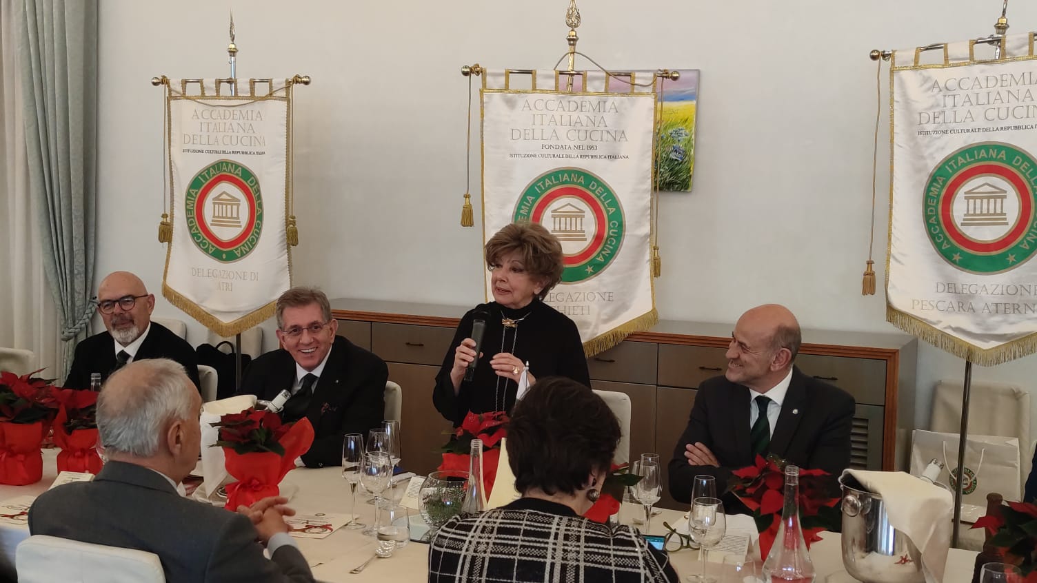 Una sala piena di colori e soprattutto di voglia di far festa ha accolto, presso il ristorante “Giardino degli Ulivi” di Rosciano (PE), le Delegazioni di Atri, Chieti e Pescara Aternum, guidate rispettivamente da Antonio Moscianese Santori, Nicola D'Auria e Giuseppe Di Giovacchino, che hanno deciso di unirsi per gli auguri di Natale. La giornata, a cui ha preso parte anche il Vice Presidente vicario Mimmo D’Alessio (in foto 1 con i tre Delegati e la brigata di cucina), è stata dedicata al tema “Solennità stagionali e personaggi culturali. Una nota sul pranzo natalizio” esposto con grande competenza dalla prof.ssa Eide Spedicato (in foto 2), già professore associato di Sociologia generale all'Università degli Studi “Gabriele d’Annunzio” di Chieti-Pescara. Per le tre Delegazioni, sei sono stati i Simposiarchi dell’evento, due per ogni Delegazione (Patrizia Giosuè e Aurelio Menozzi pe Atri, Erminia Ariosto e Maria Luisa Abate per Pescara Aternum, Maura Amoroso e Gerardo di Cola per Chieti). La riunione conviviale è stata preceduta dalla celebrazione della messa nella chiesa di San Sebastiano Martire in frazione Villareia di Cepagatti ed è stata officiata da mons. Michele Fiorentino, Legato dell'Accademia Italiana della Cucina per lo Stato Città del Vaticano (in foto 3 con i tre Delegati e il Vice Presidente vicario).