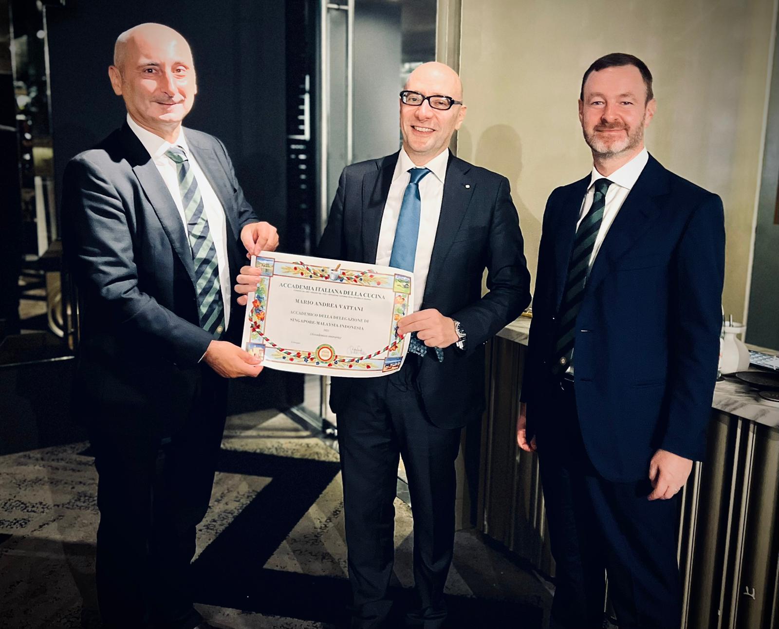 La Delegazione di Singapore-Malaysia-Indonesia si è riunita presso il Ristorante ART per celebrare la VI Settimana della Cucina Italiana nel Mondo con un evento organizzato in cinque diverse serate che hanno visto riuniti cinque Accademici ognuna. Come da tradizione, è stato scelto il ristorante a cui è stato riconosciuto per l’anno in corso il Diploma di Buona Cucina (2021). Per l'occasione, lo chef Daniele Sperindio ha preparato un menu ad hoc, particolarmente gradito da tutti gli ospiti, che ha rispecchiato il tema della Settimana “Tradizione e prospettive della cucina italiana: capire e ottimizzare la sostenibilità alimentare”. I cinque Simposiarchi delle serate - Paola Morris, Davide Muzio, Elena Simmen e Gionata Bosco - guidati dal Consultore Giacomo Clerici, hanno intrattenuto gli ospiti con interventi culturali focalizzati su Dieta Mediterranea, Sostenibilità e Agricoltura Biodinamica. Durante il convivio del 26 novembre il vice Delegato Alberto Martinelli ha dato il benvenuto a S.E. l’Ambasciatore d’Italia a Singapore Mario Andrea Vattani, da poco nominato Accademico onorario, a cui sono state consegnate le insegne dell’Accademia. L’Ambasciatore Vattani ha espresso parole di ringraziamento per la gradita e calorosa accoglienza manifestando anche vivo interesse per i contributi culturali della serata.