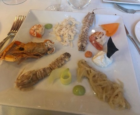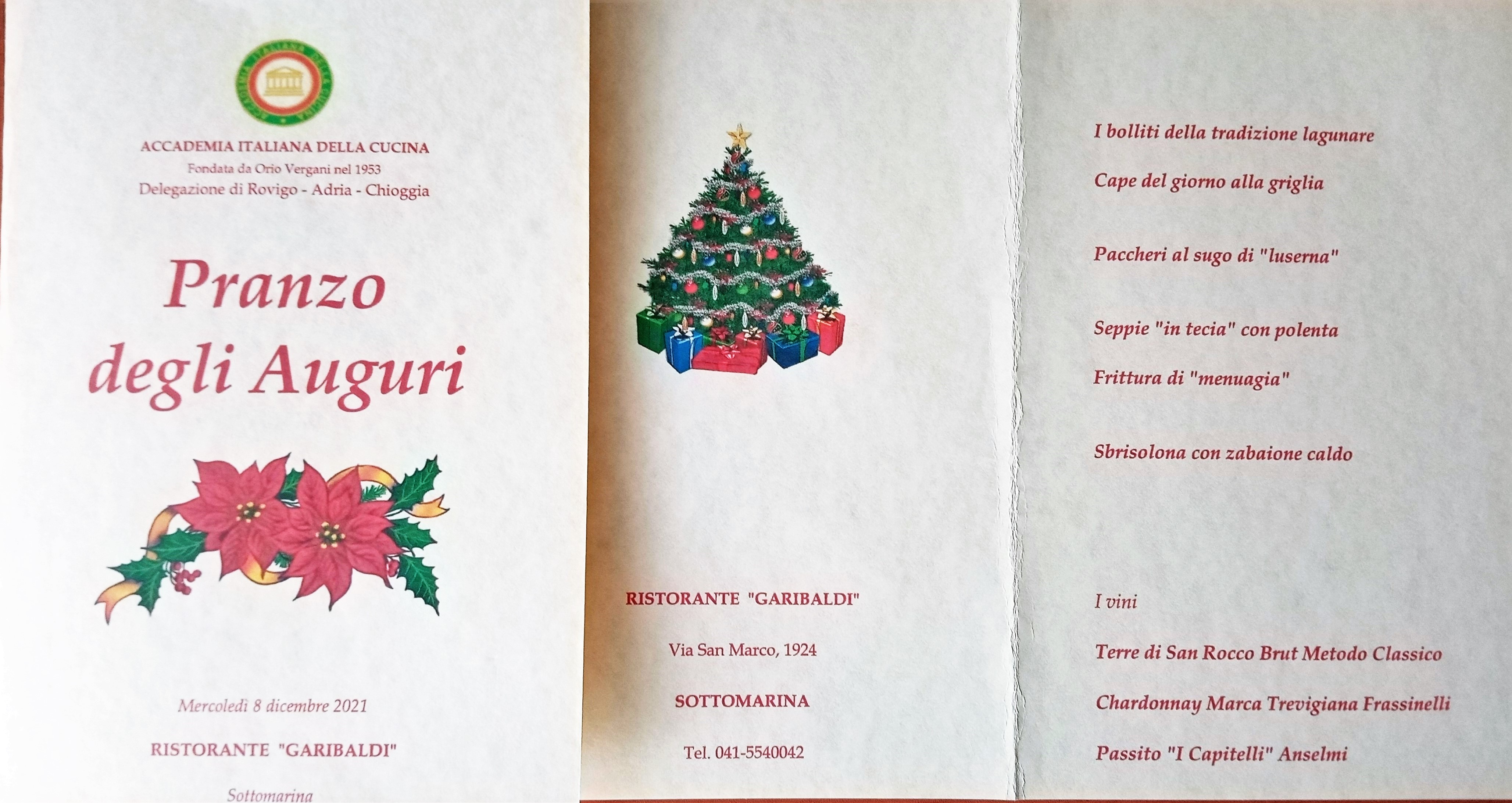 Nel bel ristorante nato dall’osteria in cui nel 1867 Garibaldi si fermò a mangiare e che da allora prese il suo nome ("Garibaldi", Sottomarina di Chioggia), si è tenuto il pranzo degli auguri della Delegazione di Rovigo-Adria-Chioggia con un menu impostato dai Simposiarchi Sergio Schiavon e Giorgio Vianelli sui piatti tradizionali del territorio. Il pranzo ha ottenuto ottime valutazioni anche per la cortesia e la precisione del servizio e la qualità dell’ ambiente che ha la bella caratteristica di avere la cucina a vista. Tutti i piatti sono stati molto apprezzati ma i voti più alti sono andati alle nerissime seppie in “tecia” con la polenta bianca, al perfetto fritto di laguna e ad una personale e ben riuscita interpretazione della sbrisolona con lo zabaione. Meritati applausi hanno salutato lo chef Nelson Meneghello e la sua brigata di sala e cucina alla fine del pranzo durante il quale è stata anche presentata la nuova Accademica Gina Bordin. Foto 1. Il Delegato Giorgio Golfetti con la nuova Accademica Gina Bordin. Foto 2. Il menu. Foto 3. I bolliti della tradizione lagunare.