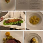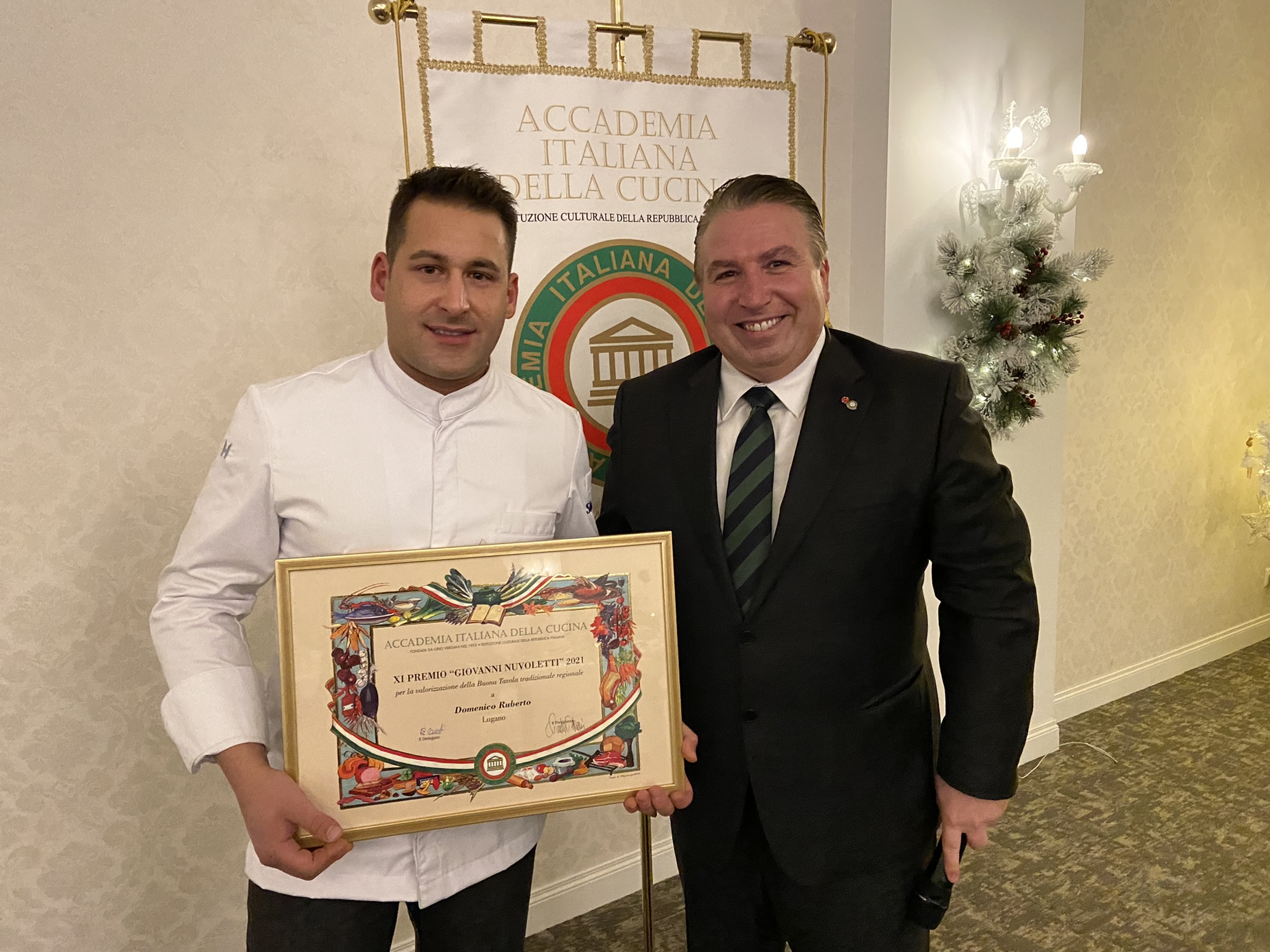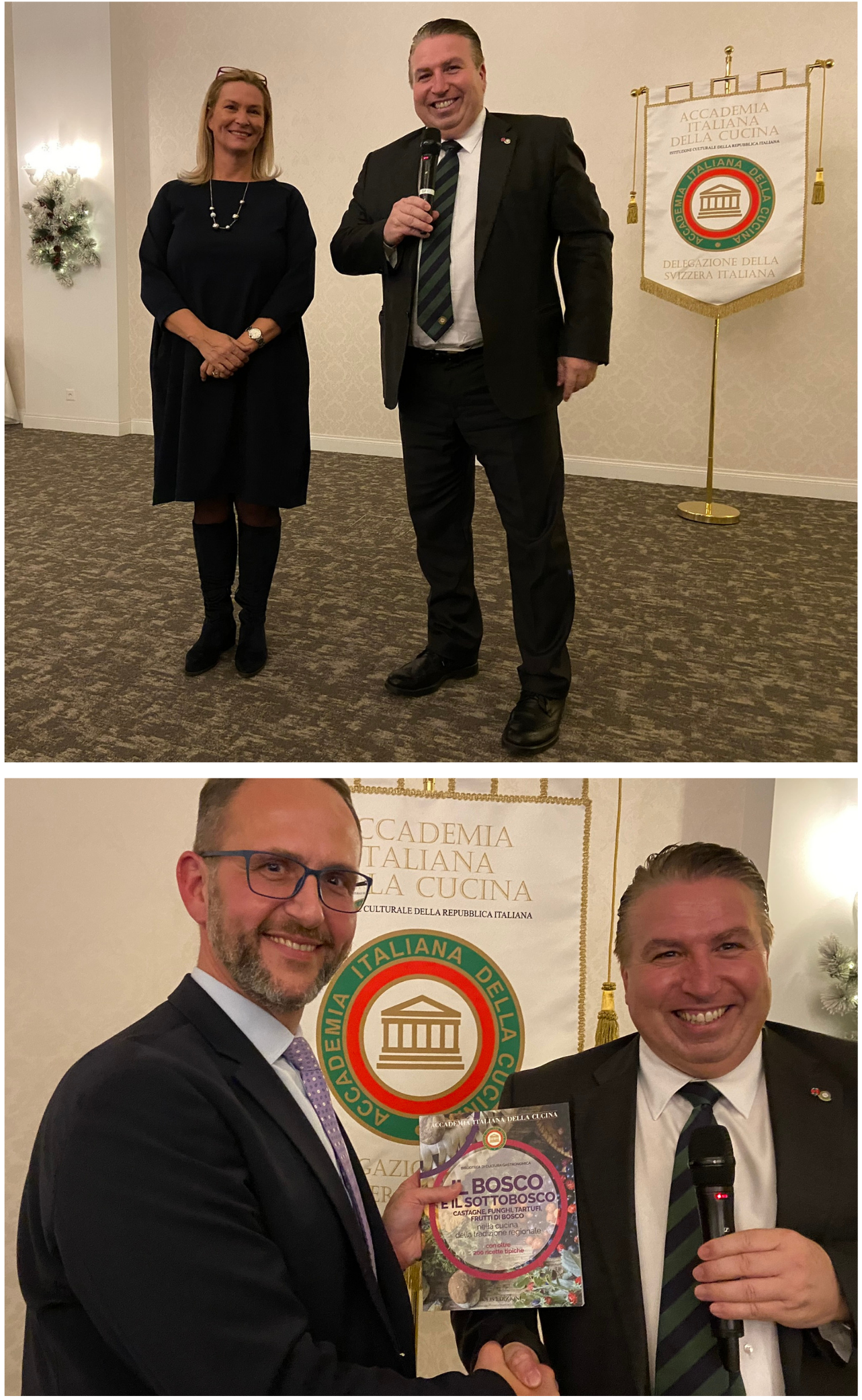 Per concludere questo speciale anno accademico, i Consultori della Delegazione Svizzera Italiana hanno organizzato la sesta e ultima cena conviviale del 2021 presso l’Hotel Splendide Royal a Lugano. La serata ha rivestito una particolare importanza in quanto durante la stessa sono stati accolti tre nuovi Accademici ed è stato consegnato il premio Giovanni Nuvoletti 2021 all’executive chef Domenico Ruberto. Ospiti della serata sono stati: la sig.ra Cinzia Stuppia (direttrice della “Giuseppe Giglia SA Marrons Glacés” che proprio quest’anno ha festeggiato il proprio centenario) e il Consigliere di Stato del Cantone Ticino, on. Norman Gobbi. La serata si è svolta in piena sicurezza ed ha riscosso un grande successo. Foto 1. I nuovi Accademici: in alto il Console Generale Gabriele Meucci (onorario), Angelo Bondi (a sinistra), Francesco Colella (a destra). Foto 2. Domenico Ruberto (premio Giovanni Nuvoletti 2021). Foto 3: Gli ospiti: Cinzia Stuppia (in alto), il Consigliere di Stato del Cantone Ticino, on. Norman Gobbi (in basso). Foto 4. Il menu e alcuni piatti.