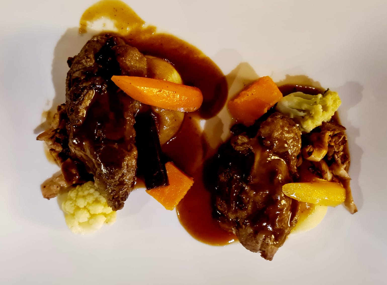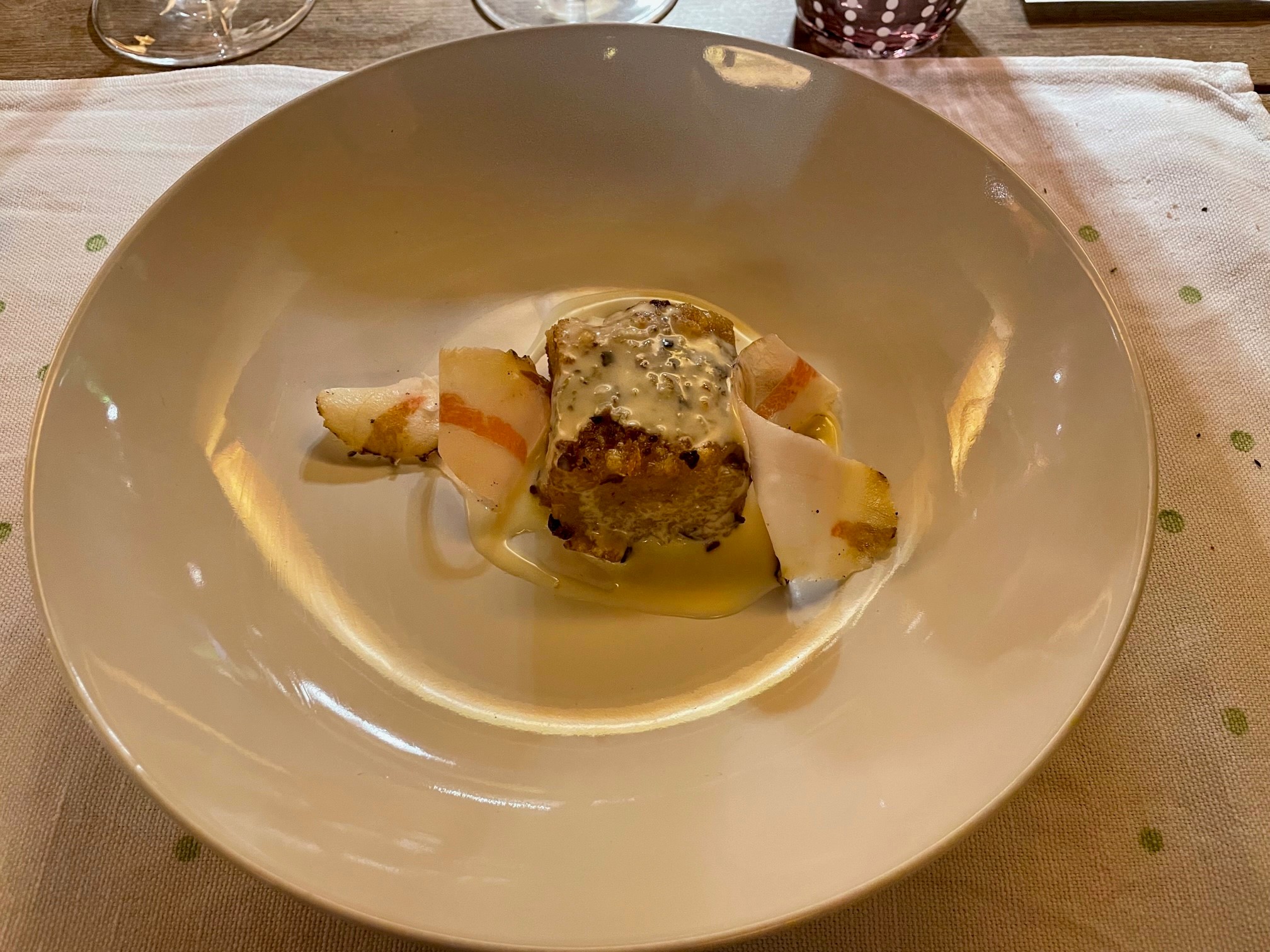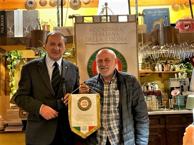 A distanza di qualche anno la Delegazione di Cesena è ritornata a far visita all’Osteria dei Frati di Roncofreddo (FC). La riunione conviviale è stata preceduta dalla visita alla Fossa dell’Abbondanza del Maestro affinatore Renato Brancaleoni, neovincitore del Premio alla carriera di Italian Cheese Awards (Foto 1). Il Simposiarca Marco Dalla Rosa ha proposto un menu ispirato alla stagionalità e alla tradizione del territorio che ha riscosso il generale gradimento degli Accademici. Speciale apprezzamento è stato riservato al pancotto e fonduta al formaggio di fossa (Foto 3) e alla guancia brasata di manzo con zucca e castagne (Foto 4). Il convivio si è svolto in una atmosfera di calda e allegra convivialità e si è conclusa con la consegna ai giovani gestori Giorgio Clementi e Valentina Grandotti, nonché alla brigata di cucina, del guidoncino della Delegazione (Foto 2).