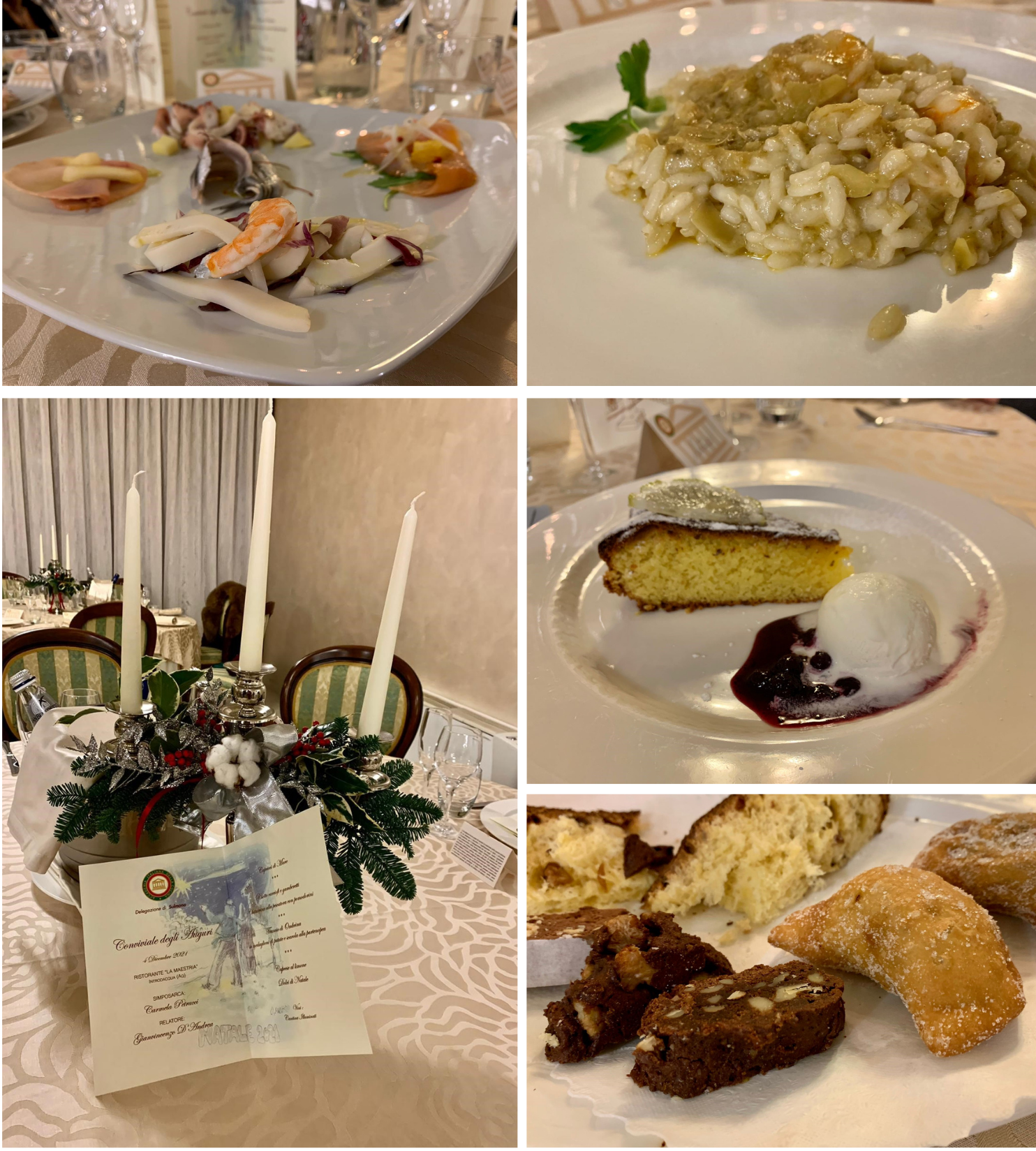 La Delegazione di Sulmona si è ritrovata al ristorante La Maestria di Introdacqua (AQ) per la cena conviviale degli auguri. Un incontro che ha visto coniugare la buona cucina a momenti culturali, alla presenza di numerosi ospiti e autorità per il consueto scambio degli auguri. Foto 1. Il Delegato Gianni D’Amario e la Simposiarca Carmela Petrucci. Foto 2. L’Accademico Gianvincenzo D'Andrea durante la sua relazione sulle tradizioni culinarie natalizie. Foto 3. Il Delegato con i cuochi. Foto 3. Piatti e menu.