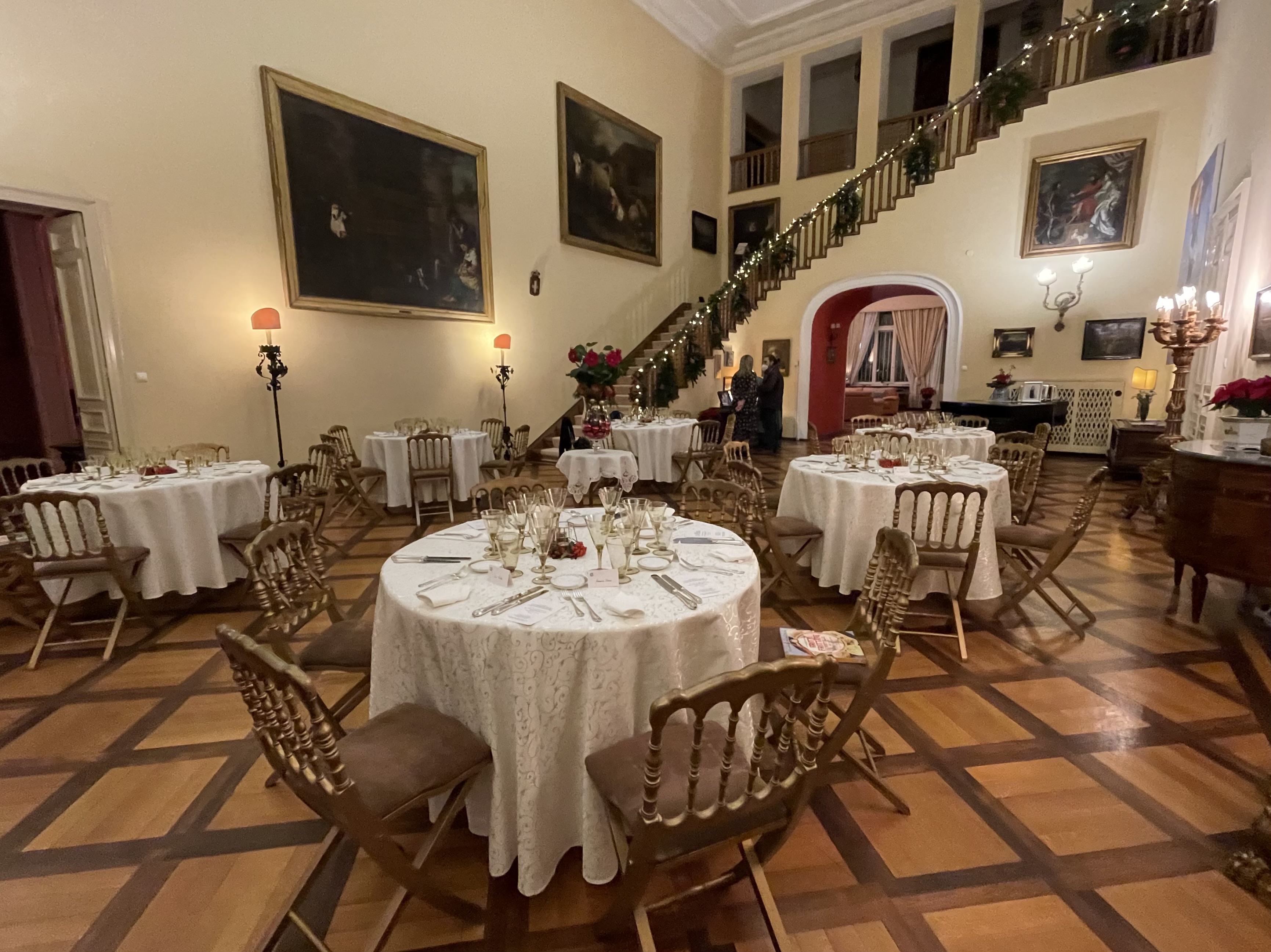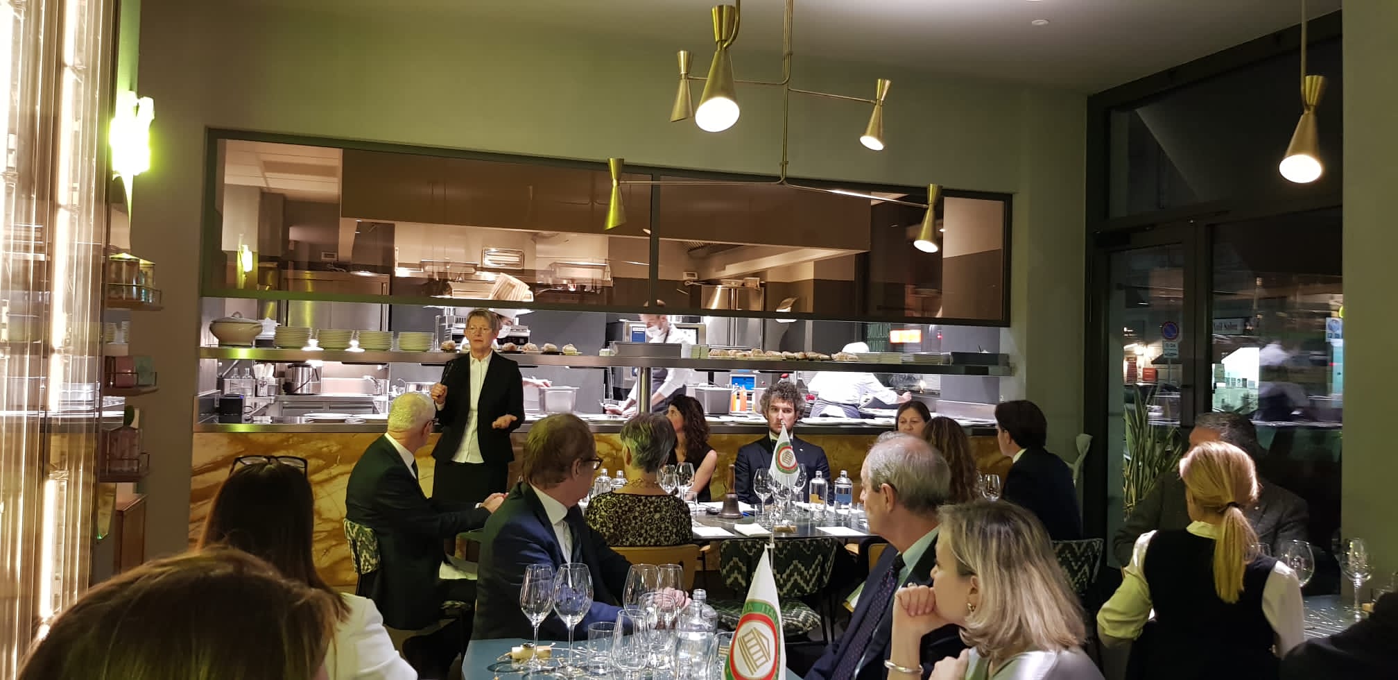 Nella splendida residenza dell’Ambasciatore Italiano a Bucarest si è svolta una cena preparata dallo chef Federico Valicenti, espressamente venuto dall’Italia. Lo stesso, ispirandosi a piatti medievali in onore del nostro Sommo Poeta, ha allietato i presenti con un particolare menu. Simposiarca della serata, l’Accademico Ruggero Gianfelici che dopo il brindisi di benvenuto ha dato la parola all’Ambasciatore d’Italia, S.E. Alfredo Maria Durante Mangoni - recentemente nominato Accademico onorario di Bucarest - che ha ringraziato la Delegazione e il Delegato Luigi Zaccagnini per l’impegno svolto negli anni, teso sempre a valorizzare e trasferire la cultura e le secolari tradizioni della nostra cucina italiana. Ha presentato poi il ricco programma di eventi organizzati dall’Ambasciata in occasione della Settimana. Il Delegato Zaccagnini, dopo i rituali saluti ai partecipanti, ha dato il benvenuto in Accademia a S.E. l’Ambasciatore ed ai neo Accademici Gabriella Navarra e Paolo Cestra, rivolgendo un particolare ringraziamento alla padrona di casa per la sua squisita ospitalità. La serata è stata accompagnata da letture dantesche declamate dall’attore Massimiliano Nugnes che ha recitato in italiano e romeno pezzi tratti dalle tre cantiche della Divina Commedia. Al termine della serata, il Delegato ha fatto dono allo chef Valicenti e alla bravissima cuoca dell’Ambasciata di un presente della Delegazione e di una pubblicazione della Biblioteca di Cultura Gastronomica.