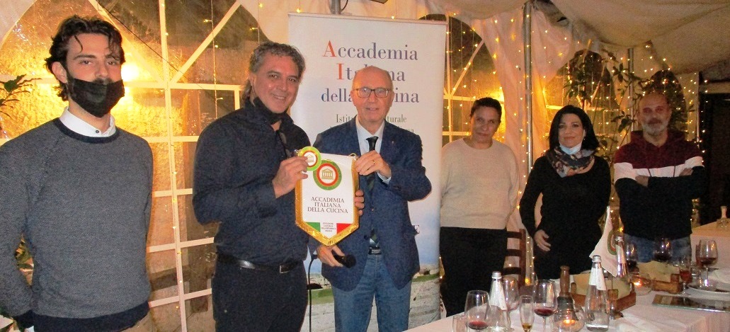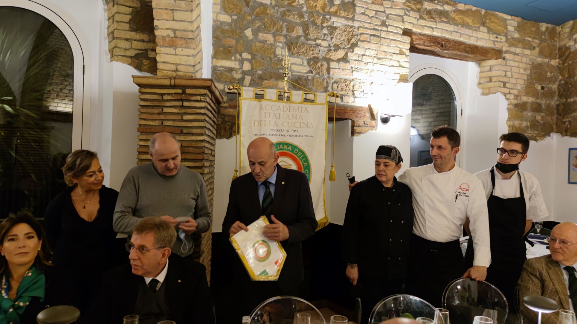 Serata per soli Accademici che, guidati dal Simposiarca Alfonso Di Fonzo, hanno fatto visita ad uno dei locali più antichi e blasonati del territorio della Delegazione: il ristorante l'Angolino a San Vito Chietino. Un ritorno dopo qualche anno che ha puntato a riconfermare la capacità di Carlo De Sanctis e della sua brigata di cucina, guidata dal giovane Moris Fortunati, di essere il punto di riferimento della ristorazione di mare lungo la Costa dei Trabocchi. La riunione conviviale è risultata piacevole e intensa, con un partecipato dibattito accademico sui profili di gusto e di giudizio da considerare nel valutare un locale, sviluppato grazie alla scelta originale dei piatti presentati. Da menzionare, uno specialissimo baccalà e un apprezzatissimo semifreddo che ha concluso degnamente una buona prova culinaria di un ristorante che conferma le attese nonostante le novità. Foto 1. Conferimento delle insegne al nuovo accademico Diego De Carolis. Foto 2. Il Simposiarca Alfonso Di Fonzo. Foto 3. La brigata di cucina con il Delgato Nicola D'auria. Foto 4. Una delle portate.
