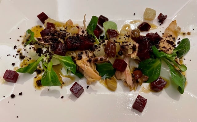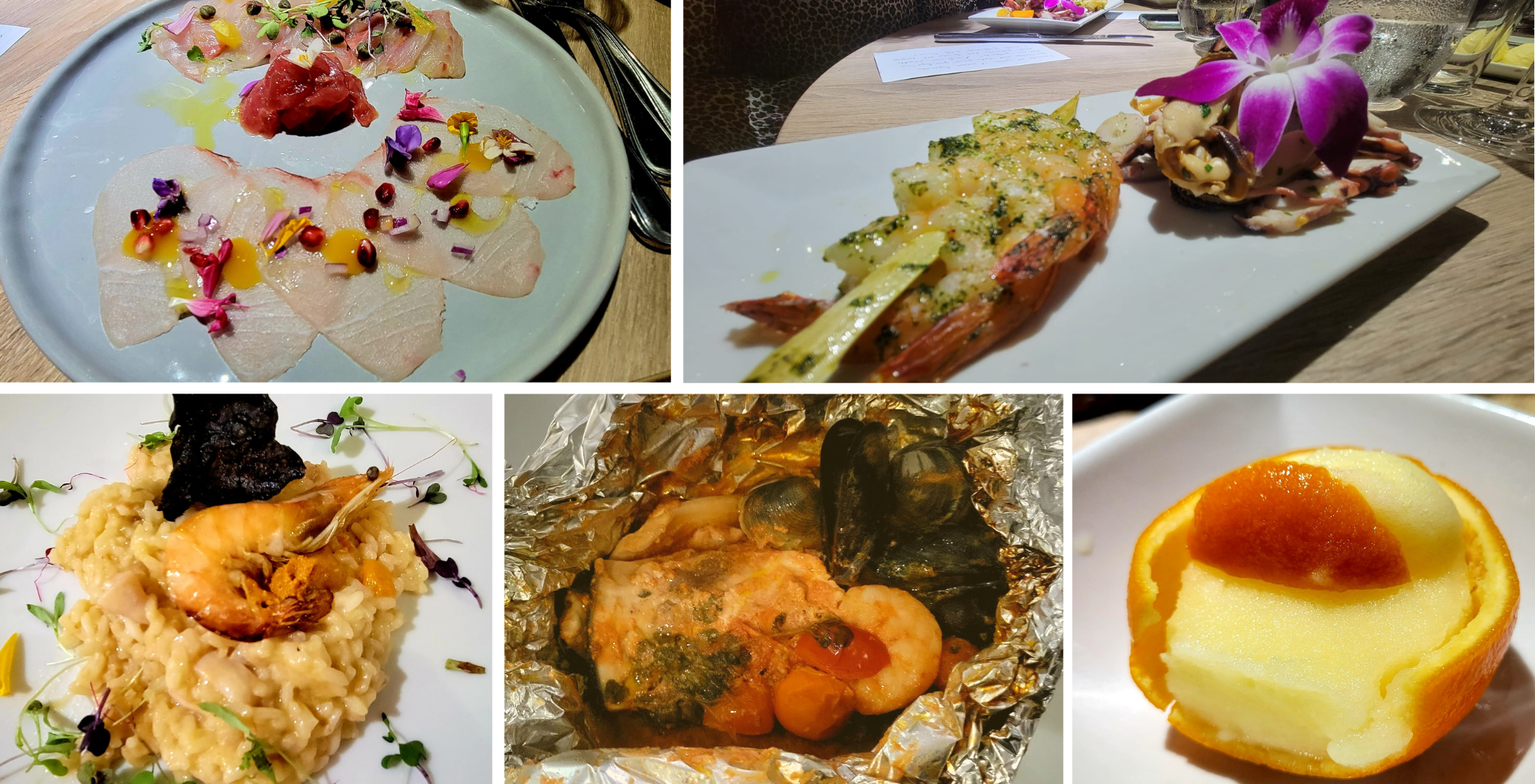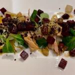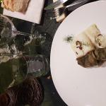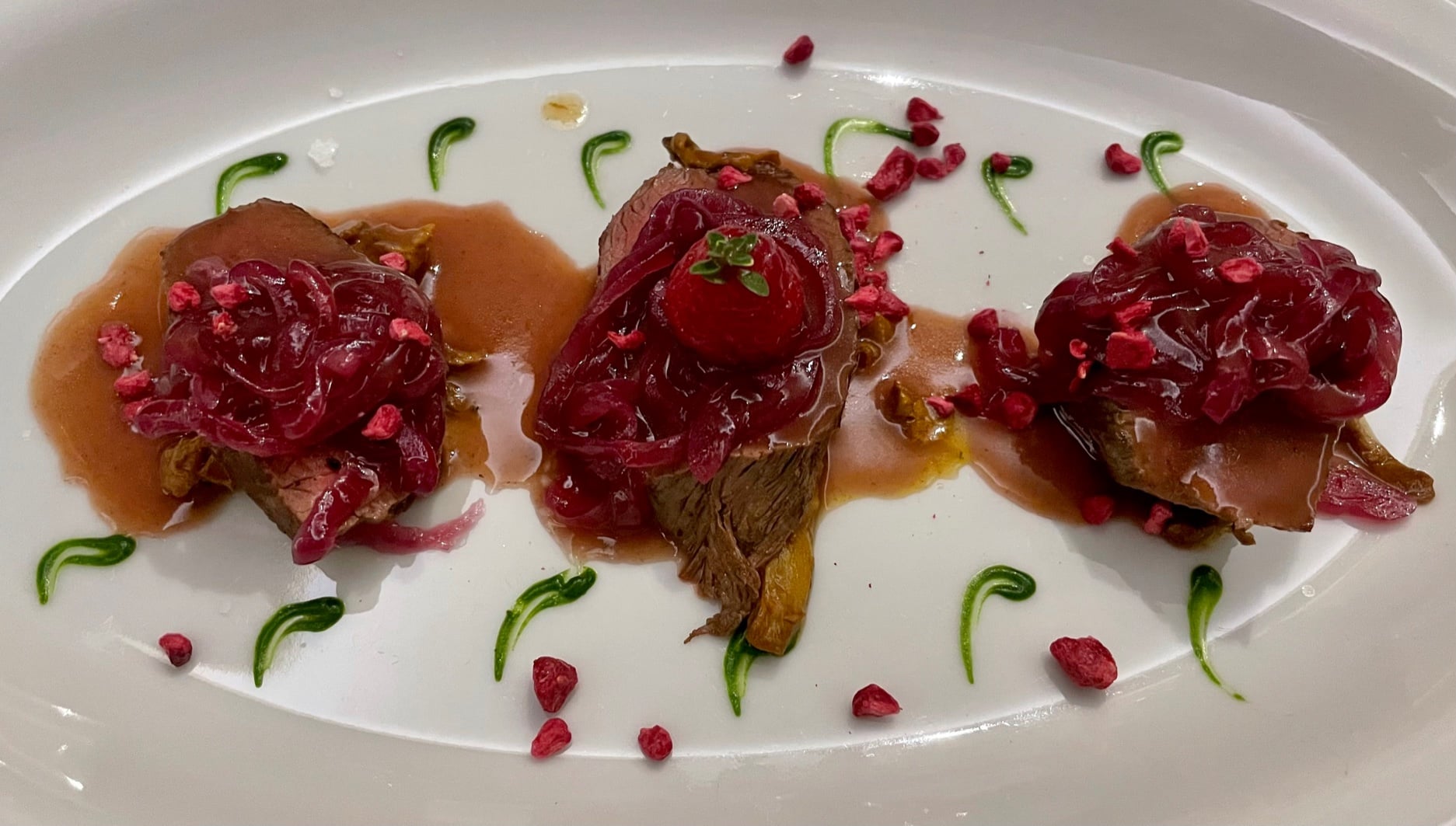 La Delegazione di Cortina d’Ampezzo ha consegnato il Diploma di Cucina Eccellente a Fabio Pompanin del ristorante “Al Camin” di Cortina. Il tema della serata è stato “Feso ce che voi”, che in italiano significa “faccio ciò che voglio”: ai Simposiarchi Monica e Massimo Hirschstein è sembrato giusto lasciare campo libero nella scelta del menu e dei vini allo chef Fabio, avendo egli strameritato questo prestigioso riconoscimento. Cresciuto costantemente nel suo percorso, vanta un ottimo curriculum anche come cuoco internazionale per Casa Italia, nel corso delle Olimpiadi di Pyeongchang 2018 e Tokyo 2021. Ma ciò che più convince di lui è la grande voglia di fare, di sperimentare, di non sottrarsi alle sfide, sempre con bravura, modestia ed umiltà: la serata è stata memorabile, grazie anche all’affettuosa e attenta accoglienza riservataci. Foto 1. Da sinistra: il Vice Delegato Diego Dipol, la Delegata Monica De Mattia, Fabio Pompanin e la moglie Lorena, i Simposiarchi Monica e Massimo Hirschstein. Foto 2. Animelle di vitello, fonduta di malga e tartufo nero. Foto 3. Insalata tiepida di coniglio in olio cottura con robiola, rapa rossa, finocchio ed olive taggiasche. Foto 4. Tagliata di controfiletto di cervo al lampone con cipolla rossa caramellata e finferli nostrani.