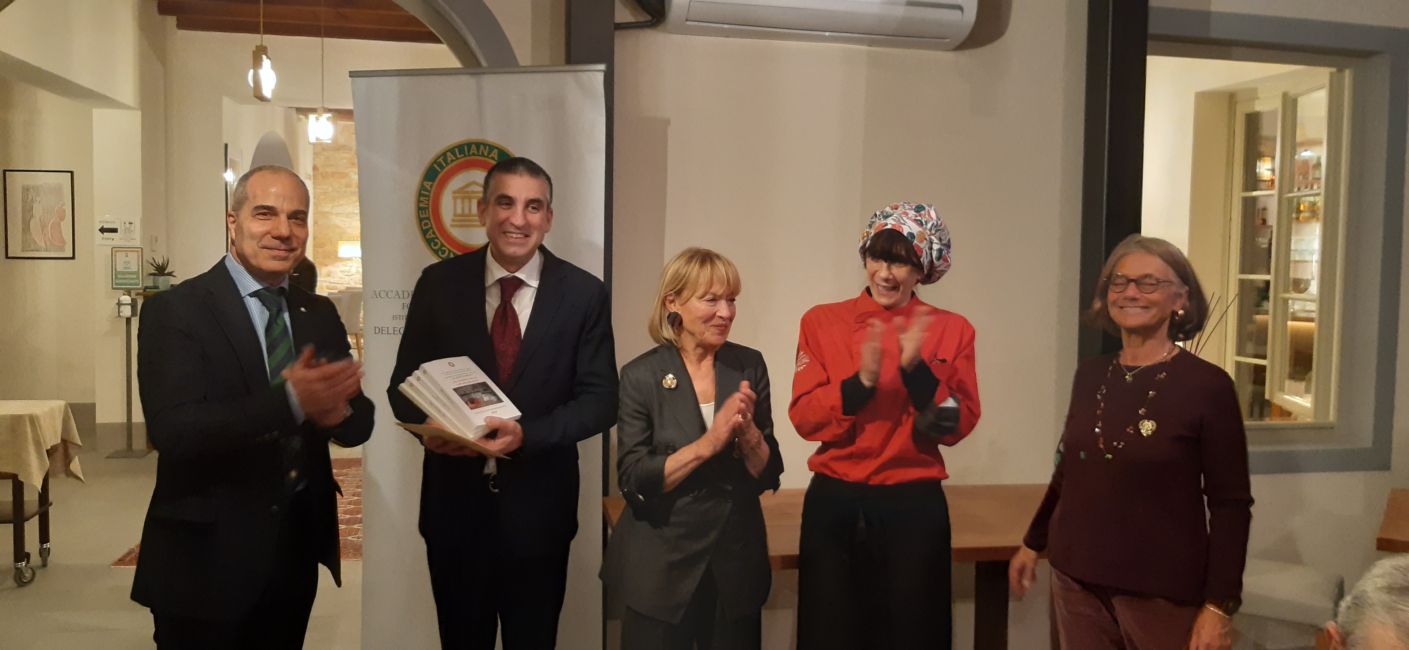 La Delegazione di Messina ha pubblicato, in occasione della Settimana mondiale della cucina italiana, il libro di Attilio Borda Bossana “Il Cibo Italiano negli Stati Uniti – La rivisitazione dei piatti siciliani più noti”, presentato presso la Sala dell’Accademia Peloritana dei Pericolanti da Fortunato Celi Zullo, già Direttore dell’Istituto del Commercio estero negli USA e a Londra, e da Paola Sabella, Segretario generale della Camera di Commercio di Messina, con l’intervento del Coordinatore Territoriale Sicilia Orientale Vittorio Sartorio (Foto 1). In serata, il Delegato Francesco Trimarchi ha dato il benvenuto a otto nuovi Accademici (Foto 2) nel corso di una riunione conviviale molto partecipata (foto 3) e apprezzata presso lo storico ristorante Piero che ha proposto un menu strettamente legato alla tradizione ultrasecolare della cucina messinese. La giornata si è conclusa con la consegna da parte del Delegato e del Coordinatore Territoriale del Premio Giovanni Nuvoletti 2020 a Giovanna e Piero Scibilia e alle figlie Emy (foto 4).