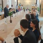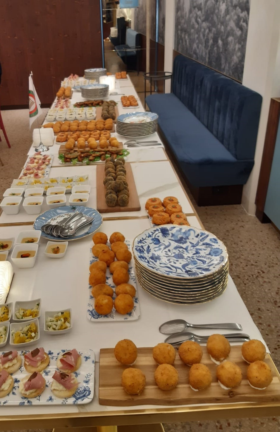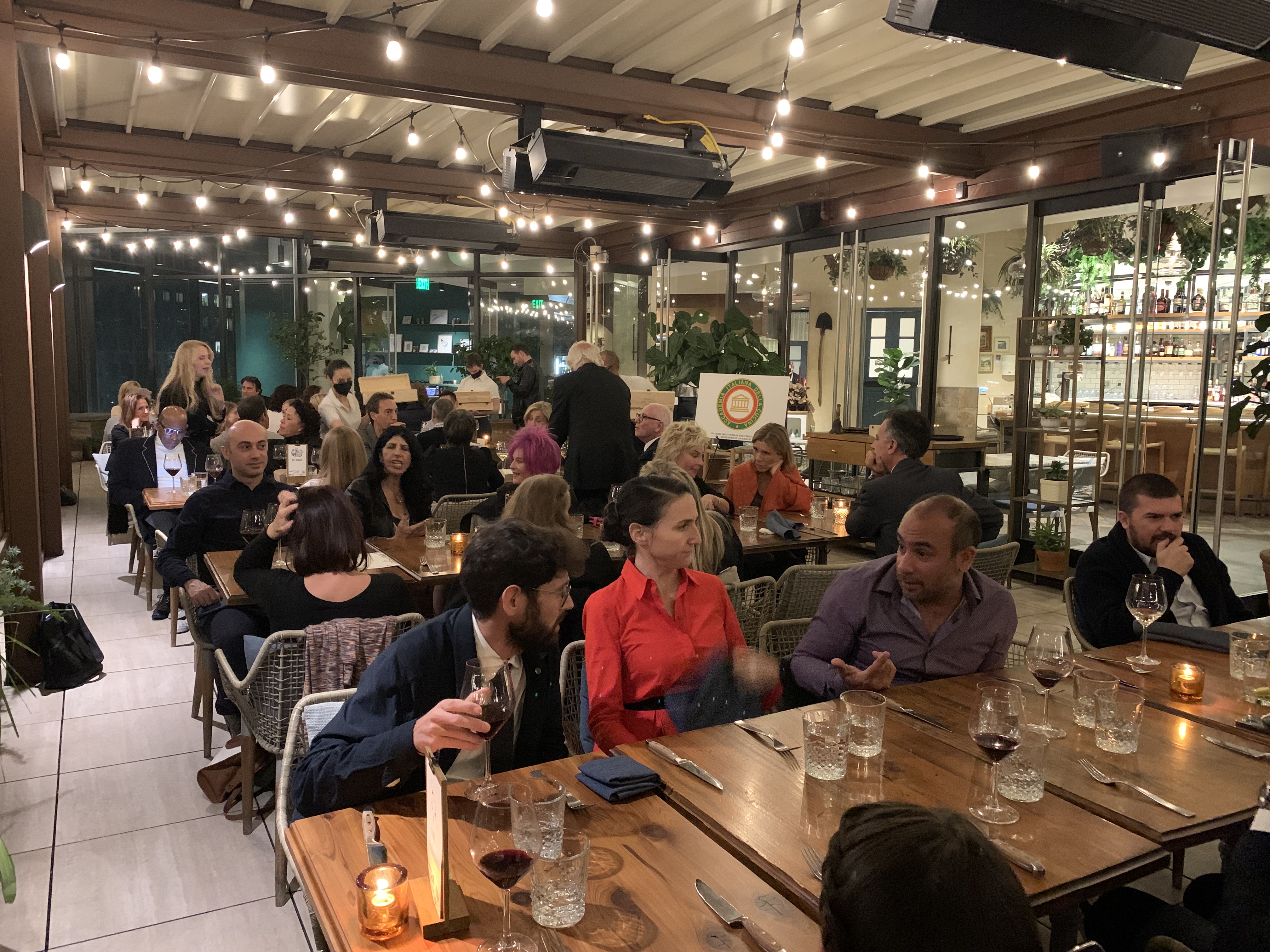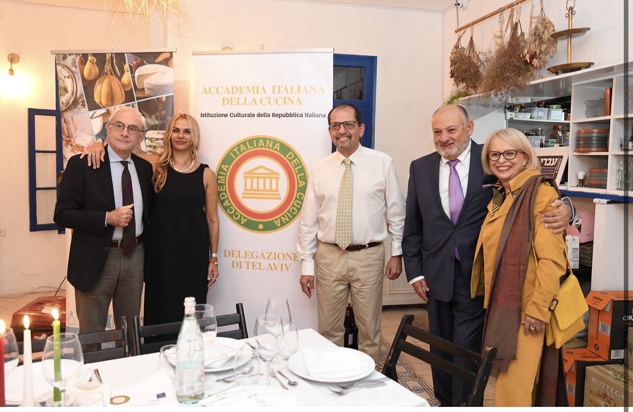 Tra gli eventi della VI Settimana a Tel Aviv, la Delegazione locale ha organizzato una cena sul riuso e sul recupero in cucina, in continuità con il tema della VI Settimana sulla sostenibilità alimentare. Realizzata nella suggestiva cornice della città vecchia di Jaffa nel locale a vista porto Hayama, la cena è stata preparata da due chef italiani presenti in Israele per l’occasione: Marco Morello e Claudia Fabiani. In occasione di questo evento, la Delegata di Tel Aviv Cinzia Klein ha consegnato i premi dell’Accademia 2021: il Premio Massimo Alberini alla ditta di pasta fresca “Pasta della Casa” di Moshe Barel e il premio Giovanni Nuvoletti allo chef Benny Ben Israel. Alla serata hanno partecipato rappresentanti della comunità italiana e autorità, tra cui il nuovo Ambasciatore S.E. Sergio Barbanti con la moglie Laetizia. Foto 1. Da sinistra: Accemico Massimo Lomonaco, Delegata Cinzia Klein, Accademico Roberto della Rocca, Moshe Barel e Letizia della Rocca. Foto 2. I due premiati Moshe Barel e Benny Ben Israel. Foto 3. Panoramica della sala. Foto 4. Supplì; gnocchetti di pane con aglio nero e carciofi fermentati; polpette di pesce e costoletta di bieta; pizza al salmone; semifreddo di torroncino.
