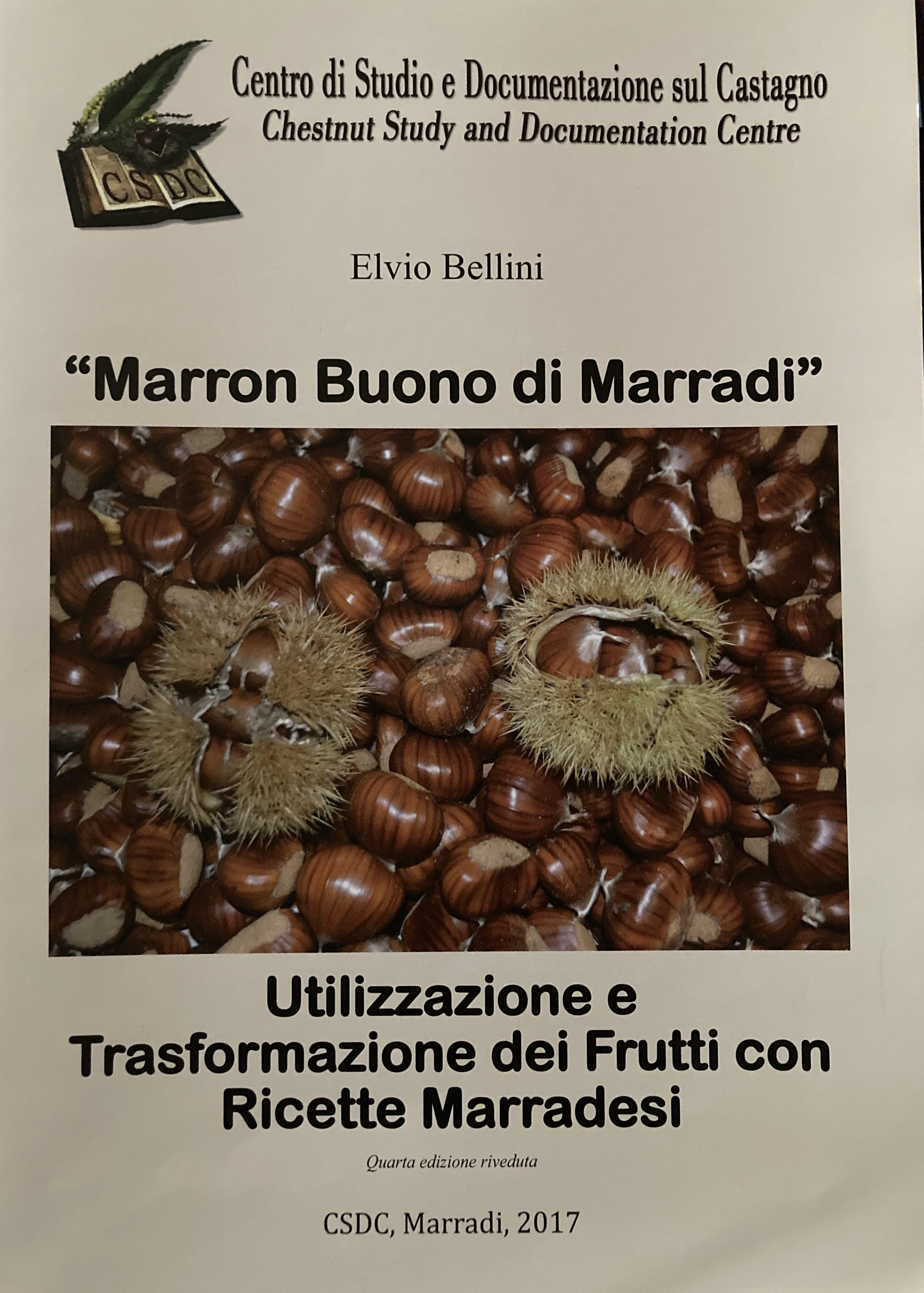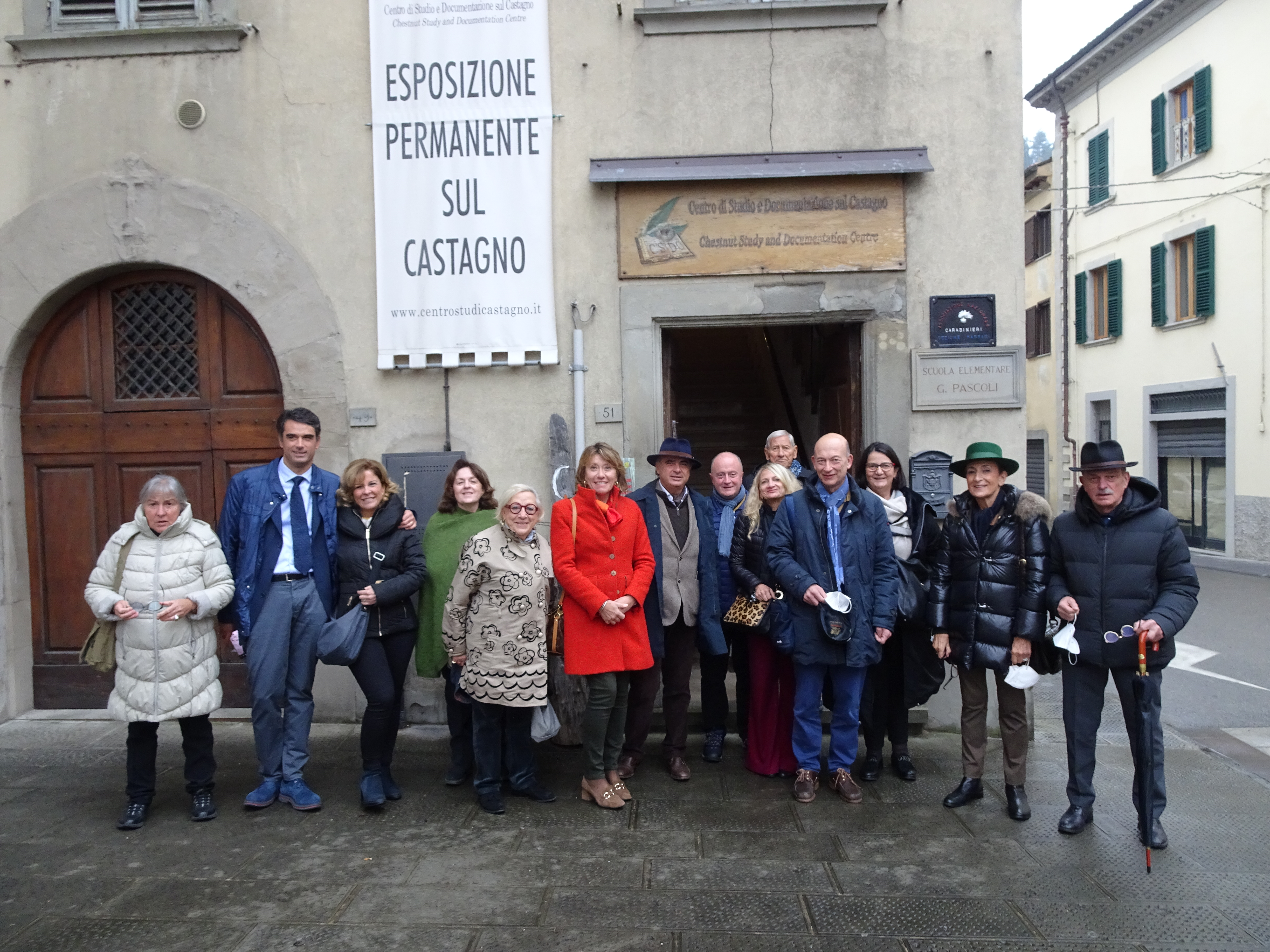 Un gruppo di Accademici del Mugello, guidato dalla Delegata Monica Sforzini, ha dedicato, come approfondimento del tema dell’anno, una giornata a Marradi (FI), uno dei comuni del Marrone del Mugello IGP e in particolare terra del “Marron Buono”. La riunione conviviale, alla quale hanno partecipato anche la Delegata della Versilia Storica Anna Ricci e il Delegato di Castel San Pietro-Medicina Andrea Stanzani, si è svolta al ristorante La Colombaia, con un menu accuratamente selezionato dal Simposiarca Desiderio Naldoni. Al pranzo ha fatto seguito la visita al “Centro di Studio e Documentazione sul Castagno” e l’incontro con il suo presidente prof. Elvio Bellini, che ha illustrato le problematiche attuali legate al recupero e alla ricostituzione dei castagneti. Un’occasione di arricchimento culturale sul frutto del castagno, e in particolare sul marrone, che nel passato ha rappresentato una risorsa fondamentale per l’alimentazione della gente di montagna e il cui impiego primeggia in molte delle ricette marradesi tramandate da secoli. Foto 1. La consegna del guidoncino e del volume “Storia della cucina italiana a fumetti”. Da sinistra: il Simposiarca Naldoni, la Delegata Sforzini e i cuochi Lubiana Vinci e Andrea Buriani. Foto 2. Un momento conviviale. Foto 3. Gli Accademici all'ingresso del Centro di Studio e Documentazione sul Castagno. Foto 4. Una pubblicazione di ricette marradesi del prof. Bellini.