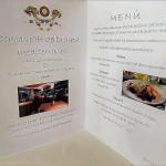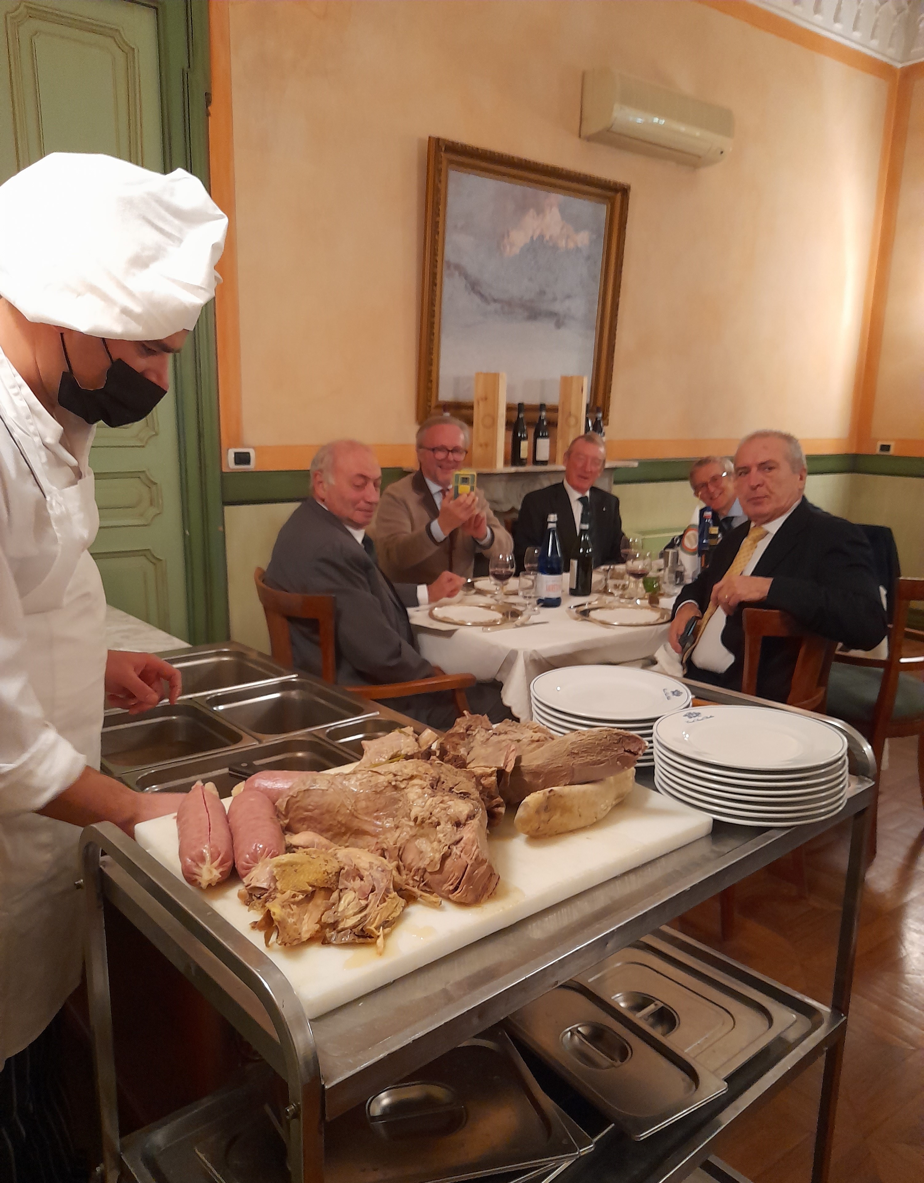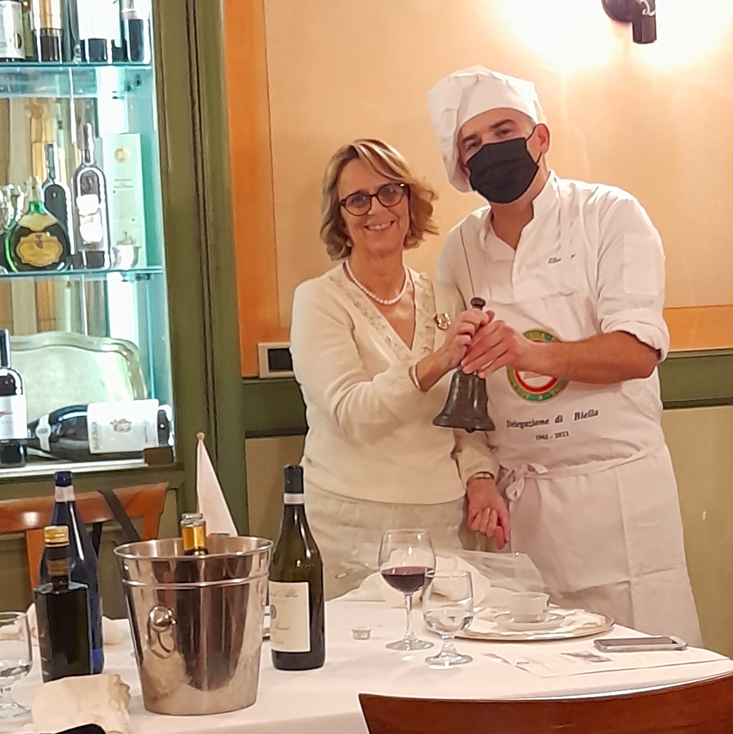 La Delegazione di Biella ha dedicato un convivio ad un aspetto della cucina piemontese: il bollito misto. La riunione conviviale sì è svolta al Circolo Sociale Biellese che ha messo a disposizione una sala a ospiti esterni. Foto 1. Tavola centrale. Foto 2. La Delegata Bertotto consegna il grembiule del 60° della Delegazione allo chef Elion Keci. Foto 3. Bolliti da tagliare. Foto 4. Flan di cardi gobbi su crema di parmigiano, chips di topinambur e fiori essiccati; tajarin al ragù di carne; piatto delle salse; pera al vino rosso e gelato alla crema.