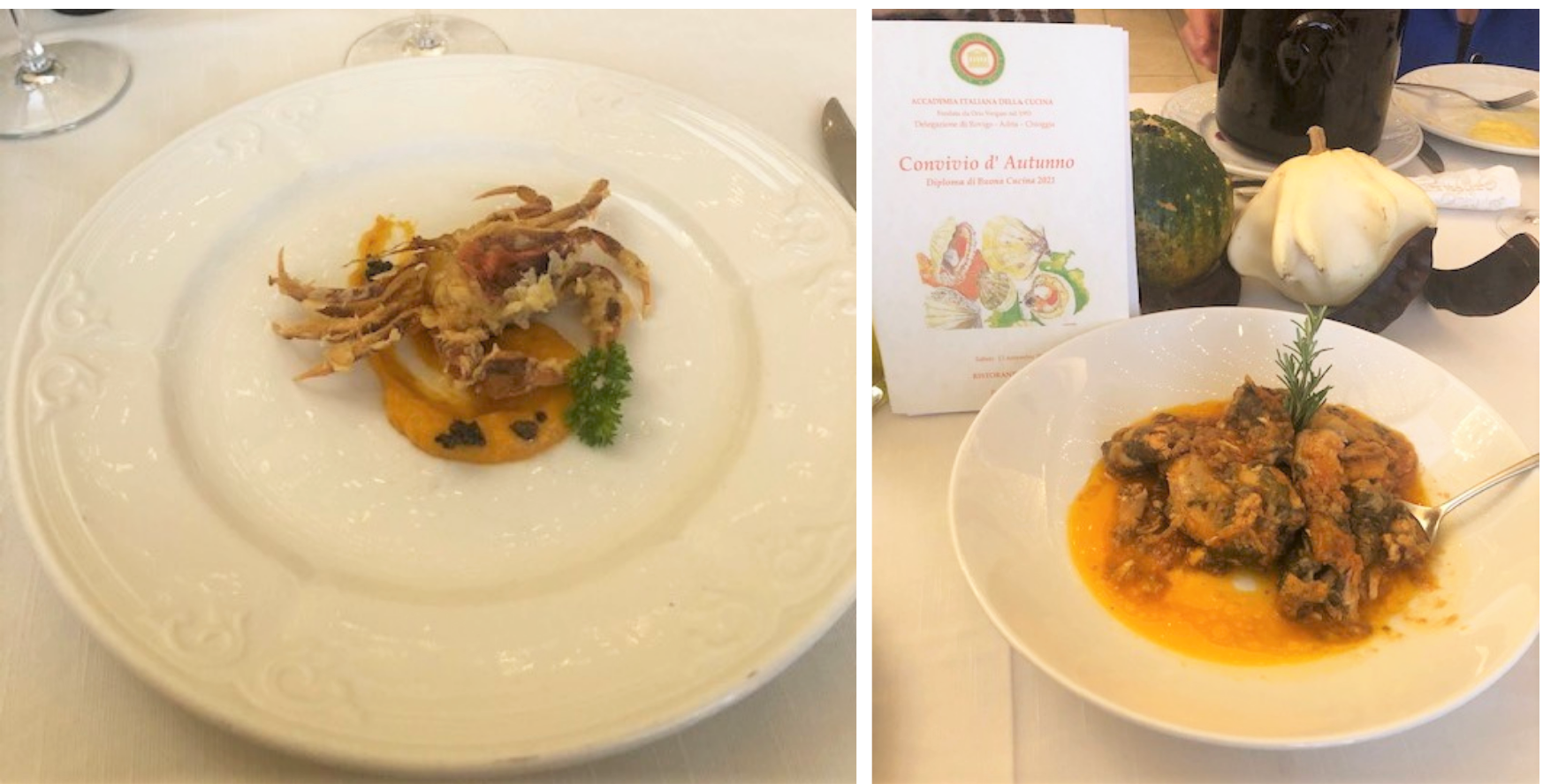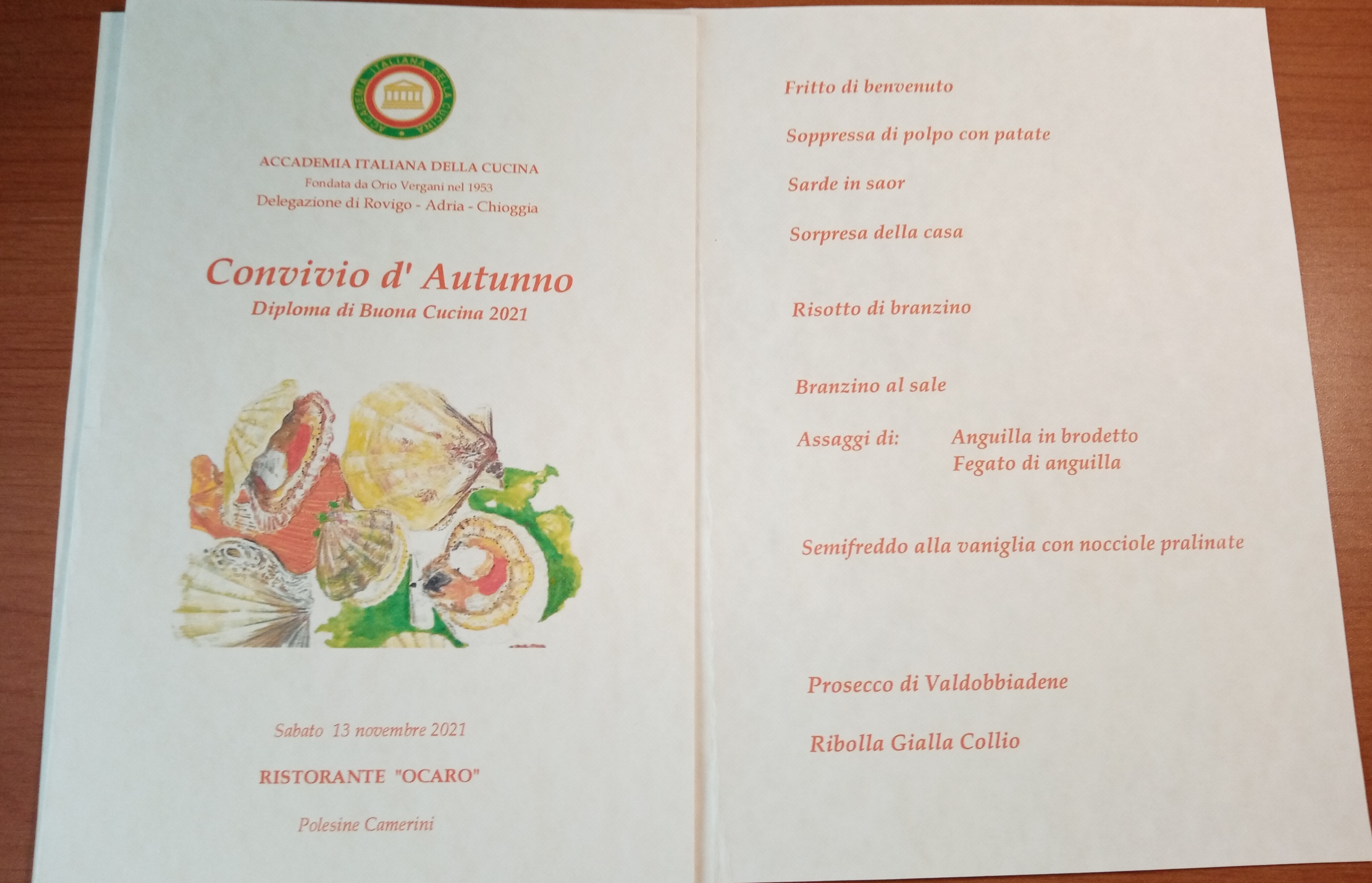 La Delegazione di Rovigo-Adria-Chioggia ha consegnato con grande soddisfazione il Diploma di Buona Cucina 2021 al Ristorante “Ocaro” di Porto Tolle in una apprezzatissima riunione conviviale (foto 1, Accademici a tavola). Il pranzo ha riscosso infatti un grande successo e pressoché tutti i piatti hanno ricevuto valutazioni altissime (foto 3, il menu) con il buonissimo dessert, un semifreddo alla vaniglia con meringa all’italiana e nocciole pralinate, sul primo gradino del podio seguito dalla moléca fritta su crema di zucca con tartufo nero del Delta e dall’anguilla in brodetto con la polenta (foto 4, moléca e anguilla). Molto apprezzati anche gli ottimi vini che hanno ben accompagnato i piatti, il servizio efficiente e sorridente e la perfetta accoglienza per cui meritatissimi applausi hanno salutato alla fine la consegna del Diploma ai giovani gestori, i fratelli Alessia e Nicola Pavanati, e ai loro collaboratori da parte del Delegato Giorgio Golfetti (foto 2).