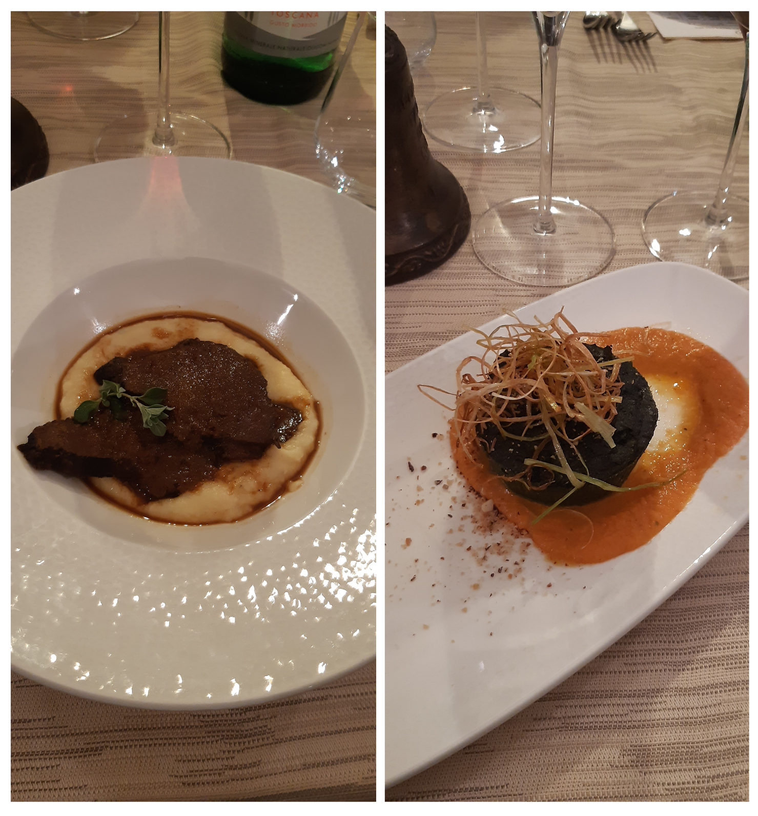 La Delegazione del Valdarno Fiorentino, guidata dai Simposiarchi Assia Olivieri e Paola Mainardi, ha partecipato alla riunione conviviale presso il ristorante “Al pruno” situato all'interno del Resort 37 nel Comune di Rignano sull'Arno. Ricavato da un casolare toscano del XIV secolo, il complesso è stato inaugurato nel 2019. Il menu, preparato dalla chef Donella Persico, è stato apprezzato da tutti i commensali. I piatti serviti, di ottima qualità, hanno privilegiato prodotti stagionali a chilometro zero, nel rispetto della tradizione culinaria toscana. Alla fine della serata il Delegato Sandro Fusari, insieme ai Simposiarchi, ha consegnato alcuni volumi dell'Accademia al restaurant manager Simone Boldrini e alla chef Donella Persico. Foto 1. Consegna dei volumi dell'Accademia. Da sinistra: Sandro Fusari, Simone Boldrini, Assia Olivieri, Donella Persico, Paola Mainardi. Foto 2. Flan di cavolo nero su purea di fagioli all'uccelletto e nocciole tostate; risotto zucca gialla con guancia di maiale profumato al tartufo. Foto 3. Guancia di manzo brasata al Chianti classico su purea di patate al timo; tortino arancia e mandorla con ganache al cioccolato e cialda croccante.