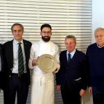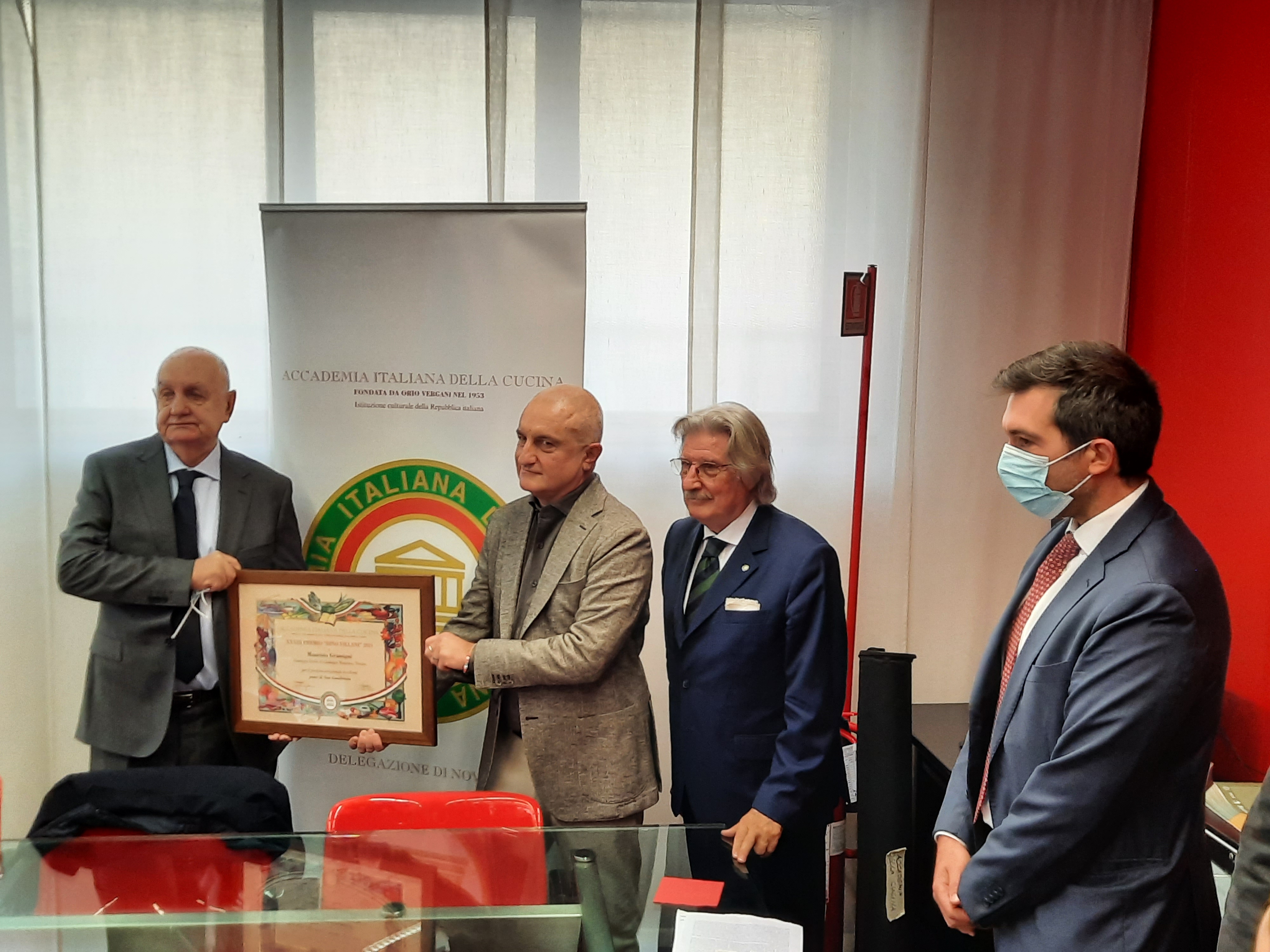 Lunedì 25 ottobre nella Sala Panarotto della Confartigianato della Provincia di Novara, si è tenuta la cerimonia di consegna del Premio Dino Villani al dolce “Pane di San Gaudenzio” prodotto dalla Pasticceria Gramigni di Novara. Erano presenti le autorità cittadine e la stampa che, già nei giorni precedenti, aveva diffusamente scritto di questo evento. Numerosi Accademici e clienti della pasticceria hanno occupato tutta la sala, nel rispetto delle regole anti-Covid. Dopo il saluto delle autorità, il Delegato Piero Spaini ha illustrato le finalità dell’Accademia e le motivazioni del Premio Dino Villani. Commossi i titolari della pasticceria Gramigni, che opera in città dal 1964, padre Ettore e figlio Maurizio che da qualche anno conduce l’attività. Al termine, nella sala attigua, c’è stato un assaggio del dolce premiato e brindisi. Foto 1. Pubblico e tavolo delle autorità. Foto 2. Ettore e Maurizio Gramigni con il Premio Dino Villani, con il Delegato Piero Spaini e il Vice Prefetto dott. Moscatello. Foto 3. Premiati e autorità.