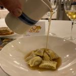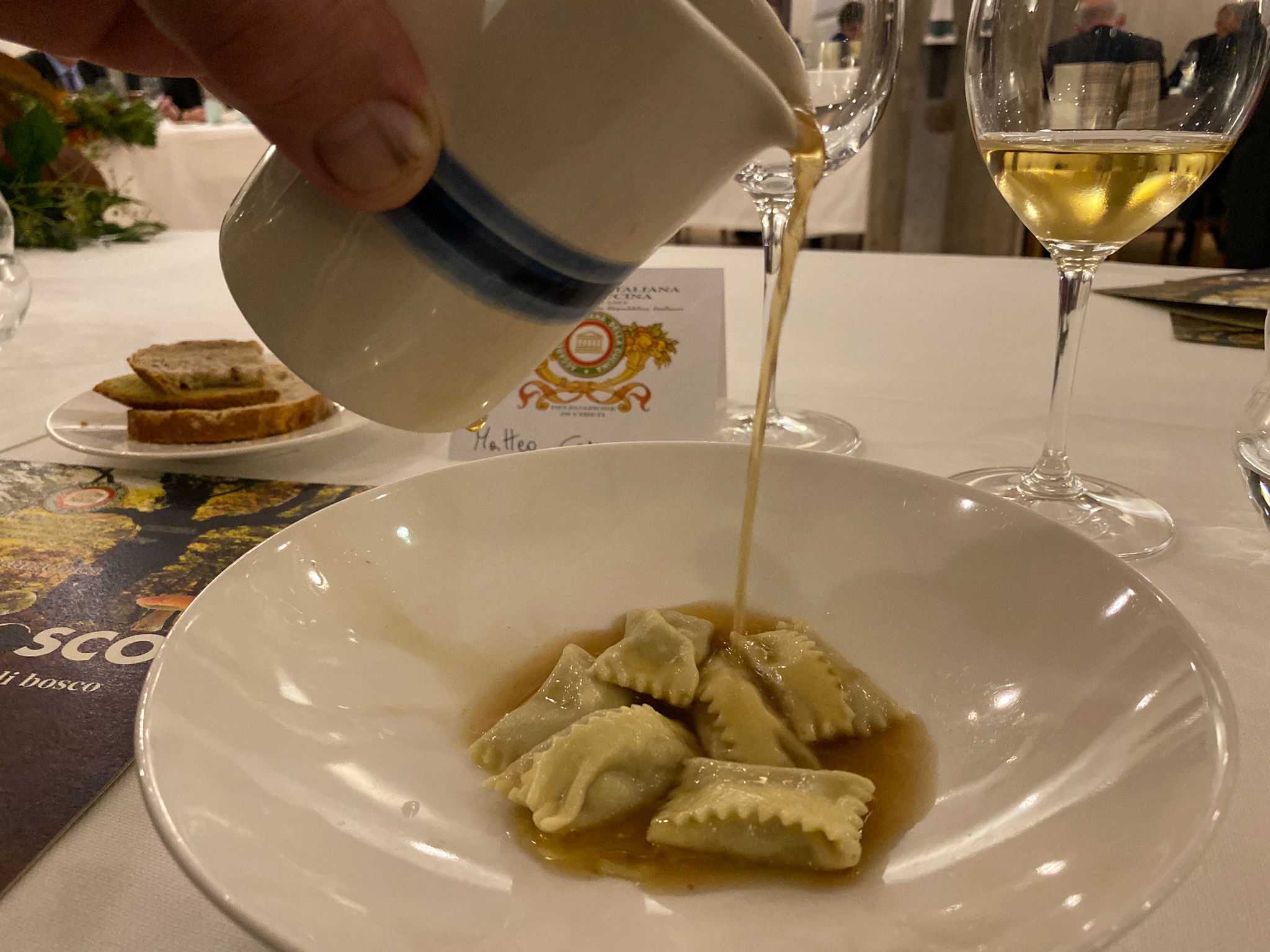 Per la Cena Ecumenica 2021 la Consulta della Delegazione di Chieti ha scelto di affidarsi alla famiglia Tinari, da tre generazioni proprietaria del ristorante "Villa Maiella" che ha di recente rinnovato il sempre raffinato locale. A Guardiagrele, sotto le pendici del massiccio della Majella, ambiente perfetto per il tema dell'anno dedicato ai frutti del bosco e del sottobosco, Peppino e Angela Tinari, insieme ai figli Arcangelo (chef) e Pascal (sommelier e direttore di sala), hanno reinterpretato con rigore la tradizione abruzzese con piatti in cui i profumi del bosco si sono straordinariamente amalgamati in sapienti portate che hanno incontrato il favore entusiastico di accademici e ospiti, tra i quali il prefetto di Chieti, Armando Forgione (in foto 1 con il Delegato Nicola D’Auria e il Vice Presidente vicario Mimmo D’Alessio). In particolare, la Consulta ha lanciato una sfida allo chef di casa, chiedendo una reinterpretazione di una carne molto apprezzata in Abruzzo ma poco proposta, il coniglio: il risultato è stato un’esaltante carne porchettata che ha stuzzicato le papille gustative di tutti. La dotta relazione dell'accademico Francesco D'Alessandro (foto 2) sui frutti del bosco in Abruzzo, ha disegnato la cornice di fondo di una conviviale di grande pregio. Foto 3. La brigata di cucina e di sala. Foto 4. Ravioli del plin d'anatra e brodo di porcini.