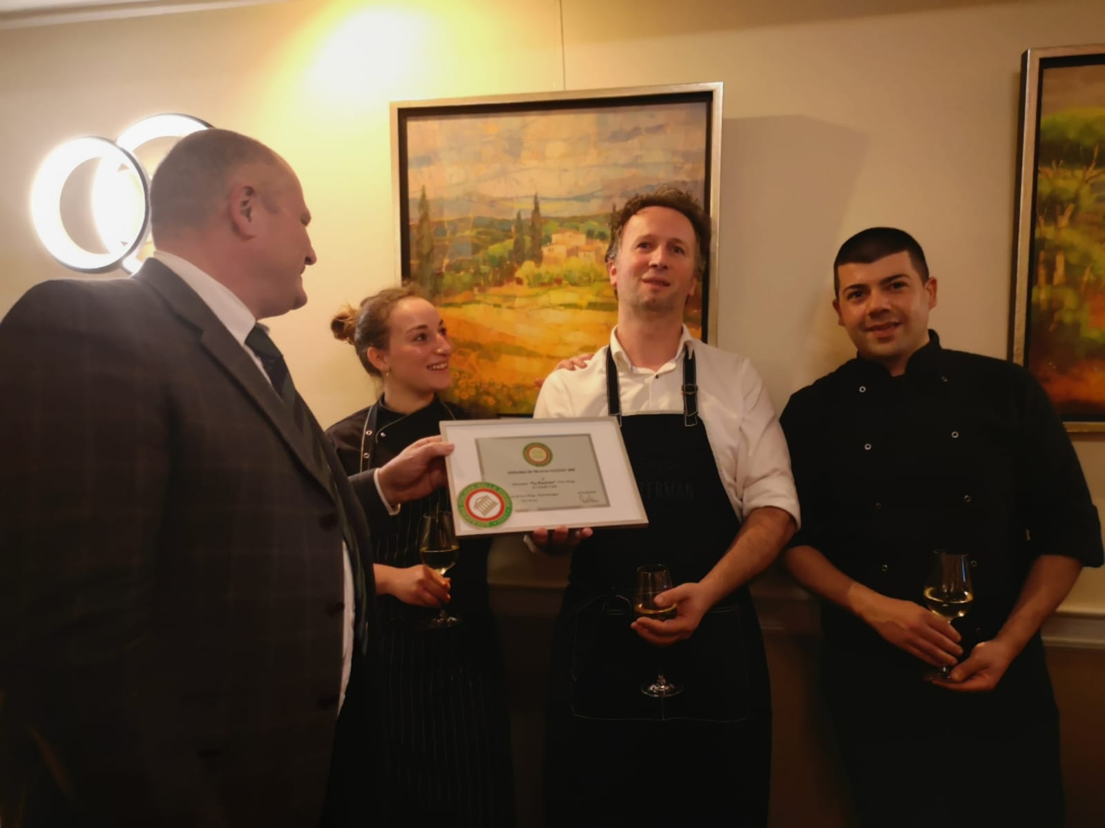Grande successo per la Cena Ecumenica della Delegazione di Den Haag-Scheveningen grazie ai cuochi Benedetta Paolinelli, Mattia Piras, Danny Russo e al sommelier/gestore Tellis Muca del ristorante “La Passione”. Durante la serata è stato consegnato il Diploma di Buona Cucina, accolto dai ristoratori con orgoglio e gioia. Il ristorante “La Passione” ha dimostrato anche in questa occasione di meritare il prestigioso riconoscimento dell’Accademia confermandosi il miglior locale italiano dell’Aia. Foto 1. Il Delegato Ciro Pernice consegna il premio. Foto 2. Presentazione del tema “Funghi e frutti di bosco e dune nei Paesi Bassi”. Foto 3. Antipasto (petto di fagiano affumicato, gel di mirtillo, crumble di noci, spugna di erbe). Foto 4. primo piatto (funghi porcini, polenta mantecata al pecorino di grotta, uovo pochè).