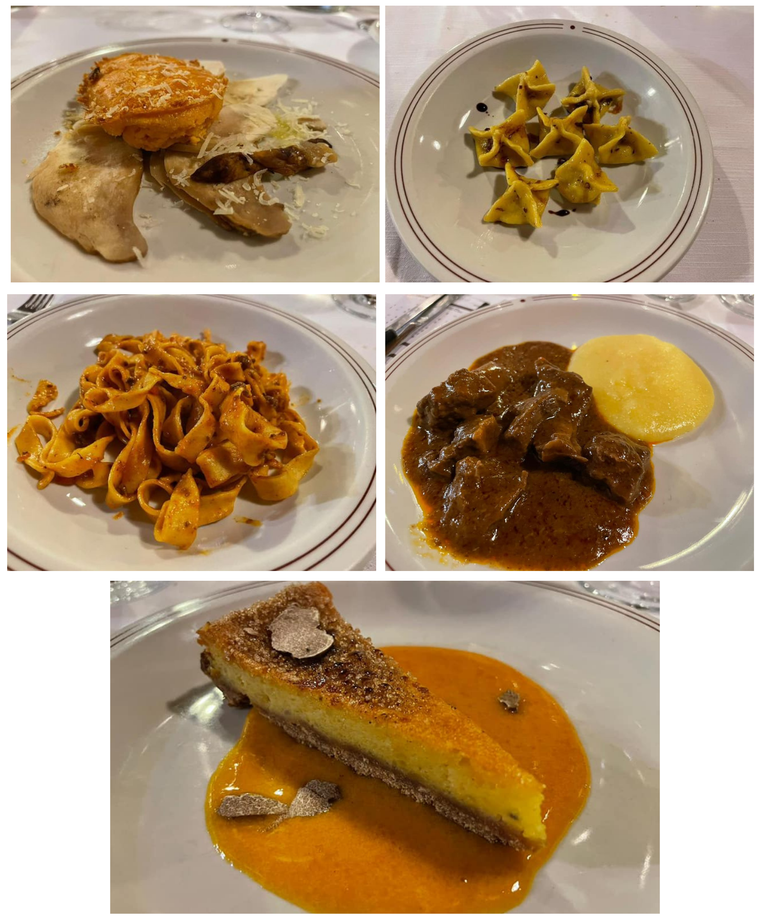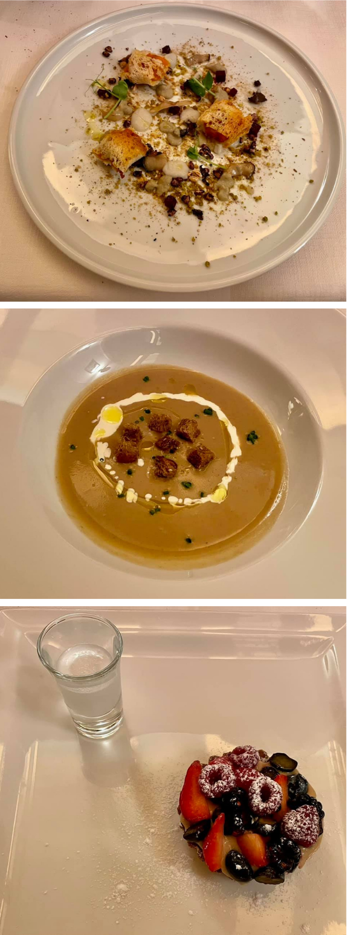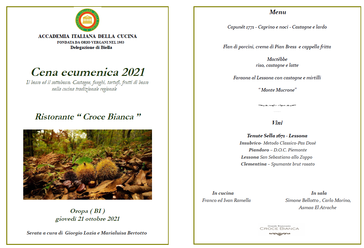 La Delegazione di Biella si è riunita al ristorante Croce Bianca di Oropa per la Cena Ecumenica 2021 (foto 1) con un menu a base di antichi piatti tradizionali con protagonisti i frutti del bosco e del sottobosco. Durante la serata la Delegata Maria Luisa Bertotto ha consegnato il Diploma di Buona Cucina 2021 al gestore del ristorante Franco Ramella (foto 2). Foto 3. Menu. Foto 4. Le portate.