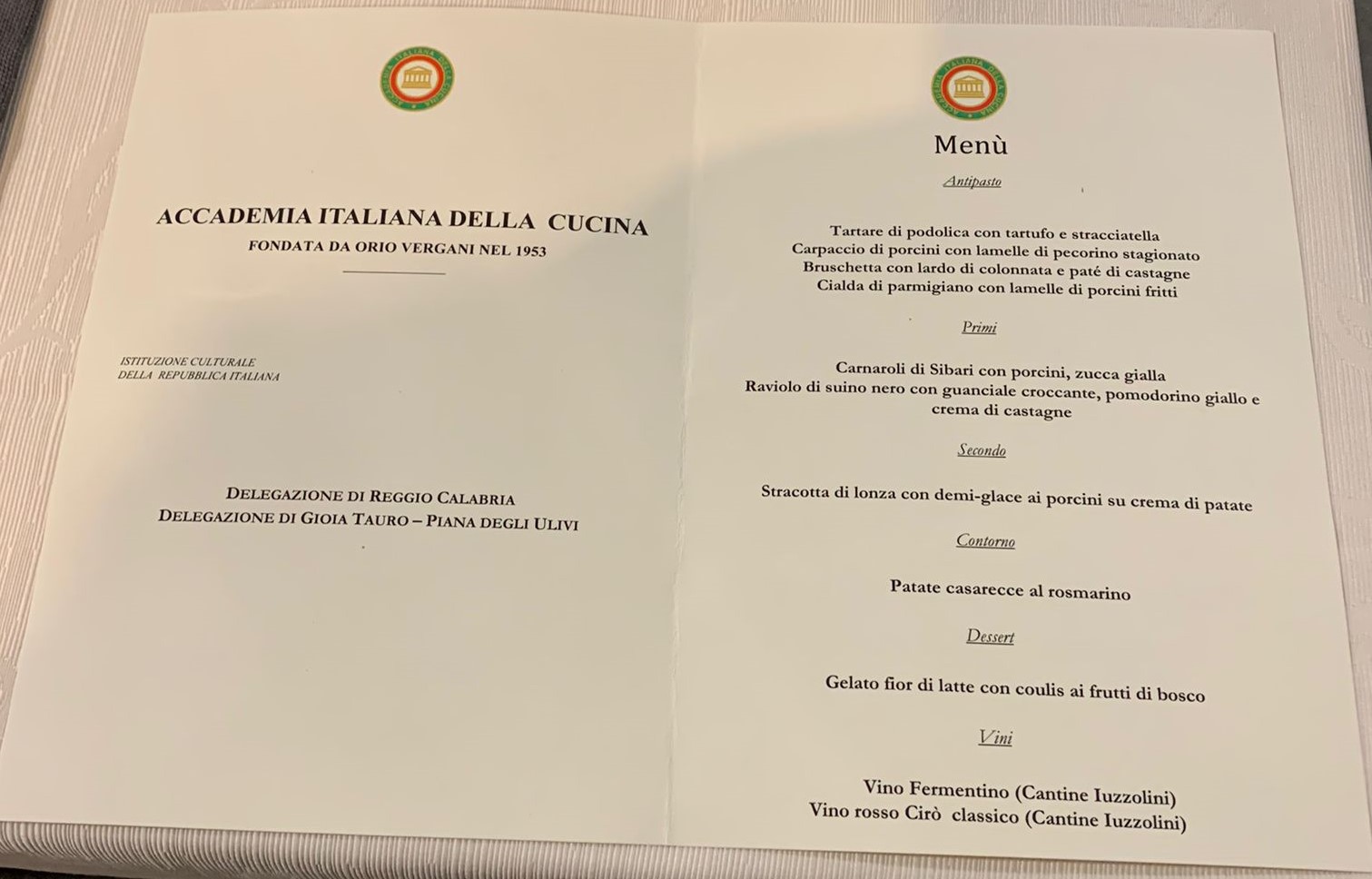 Il ristorante “Bonanno Restaurant” di Taurianova ha ospitato la Cena Ecumenica delle Delegazioni Gioia Tauro-Piana degli Ulivi e Reggio Calabria. Il Simposiarca Alessandro Cannatà si è soffermato sugli aspetti riguardanti la storia della montagna, la tutela e la ricchezza delle aree boschive con aneddoti sull’attività e sulle prassi dei cercatori di funghi e tartufi. Introdotti dai due Delegati Sandro Borruto e Giuseppe Alvaro, sono seguiti gli interventi del Sindaco di Taurianova, Roy Biasi, dei Delegati Giuseppe Ventra (Locride-Costa dei Gelsomini), Vincenzo Vitale (Area Grecanica-Terra del Bergamotto) e dell’Accademica Cettina Princi Lupini che ha intrattenuto i presenti sulle origini dell’importante evento. A conclusione dell’incontro molto partecipato, il Delegato Borruto ha omaggiato il Sindaco Roy Biasi della recente pubblicazione edita dall’Accademia “Storia della cucina italiana a fumetti”. È seguito, in collegamento con il Delegato Franco Panu di Cagliari, lo scambio di auguri tra gli Accademici e la descrizione dei piatti proposti delle rispettive tradizioni regionali. Il Delegato Giuseppe Alvaro ha donato all’executive chef Emanuele Bonanno l'ultimo volume della Biblioteca di Cultura Gastronomica sulla cucina del bosco e sottobosco e un guidoncino da esporre nel locale.